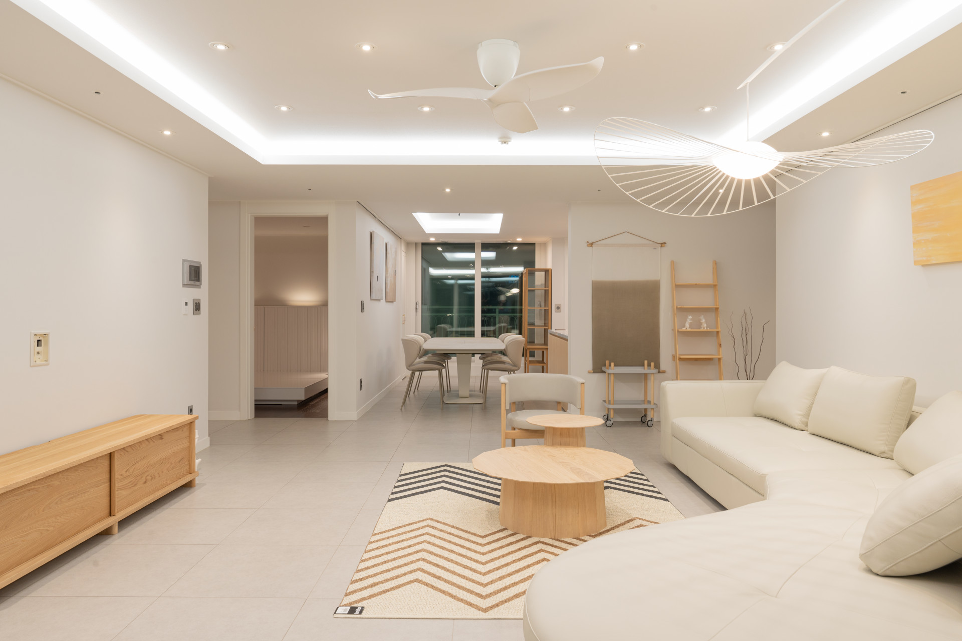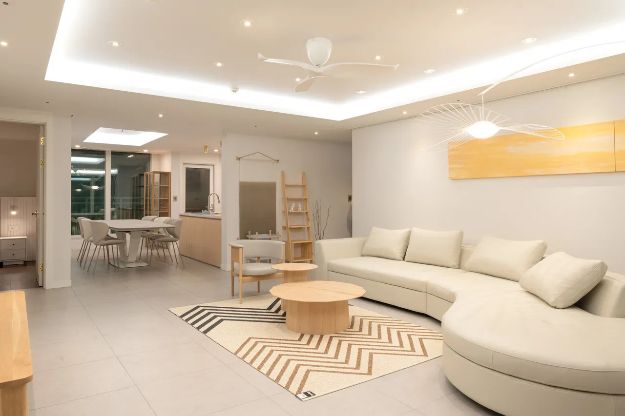 보다 따뜻하고 아늑한 거실 인테리어를 위해 우드 소재의 가구를 메인으로 사용하였으며, 자연적인 소재감이 가족들을 보다 편안한 분위기 속에서 대화하게 합니다.