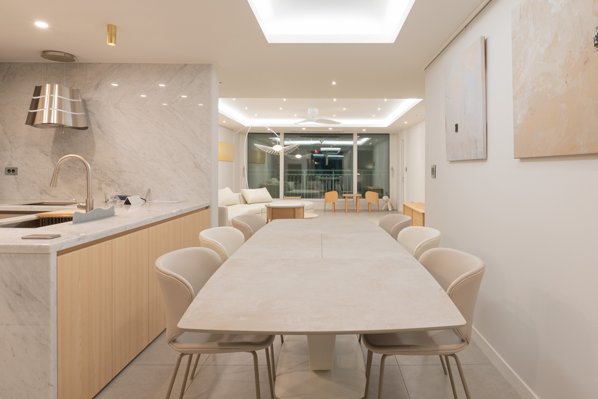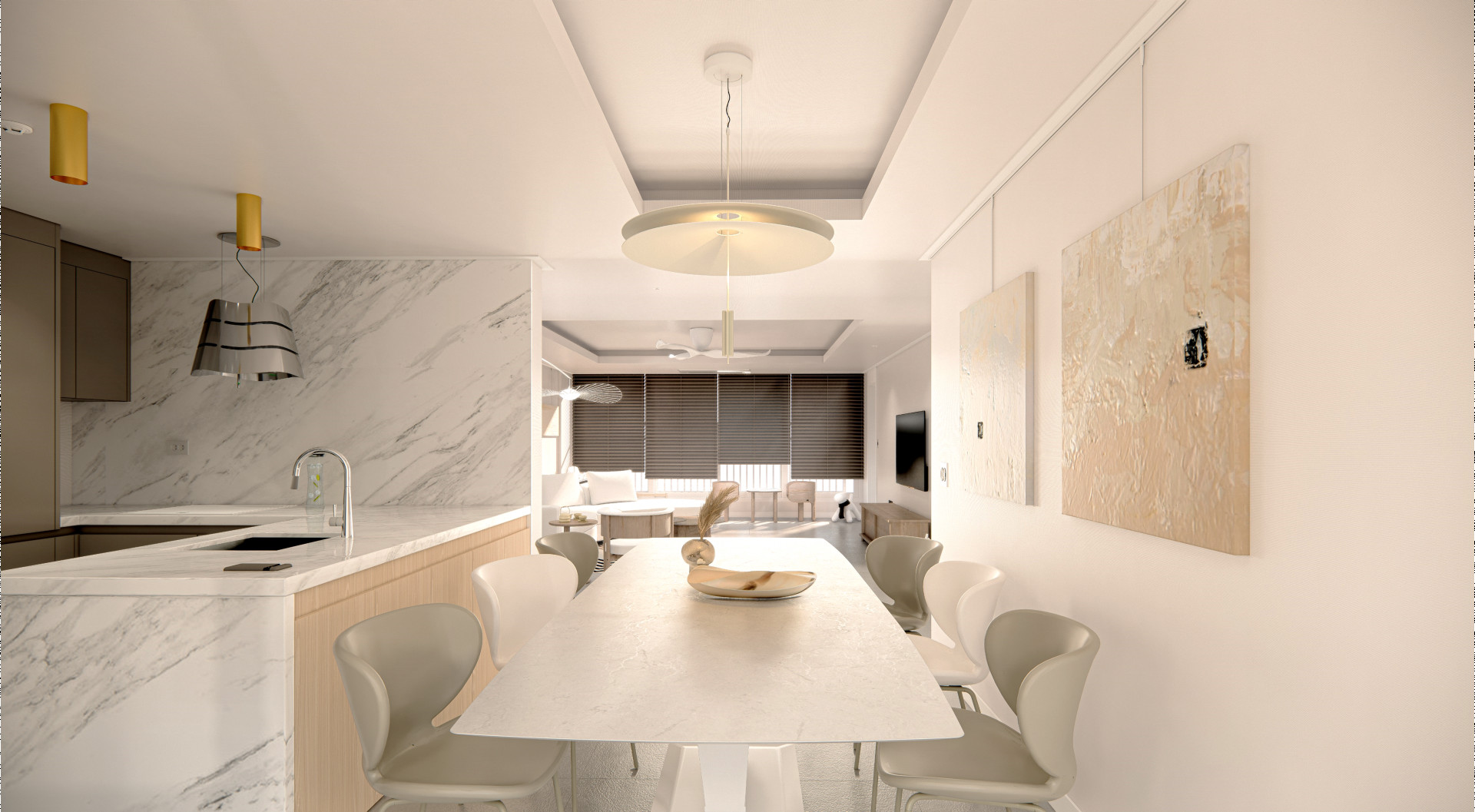 다이닝룸 인테리어는 보다 따뜻하고 아늑한 느낌으로 제안드렸습니다. 테이블은 익스텐션 기능이 포함되어 있어, 4인 가족부터 지인들과의 식사나 파티에서 최대 8인까지 앉을 수 있는 테이블로 사용 가능합니다. 효율적인 주방 인테리어에 제격인 가구이지요.