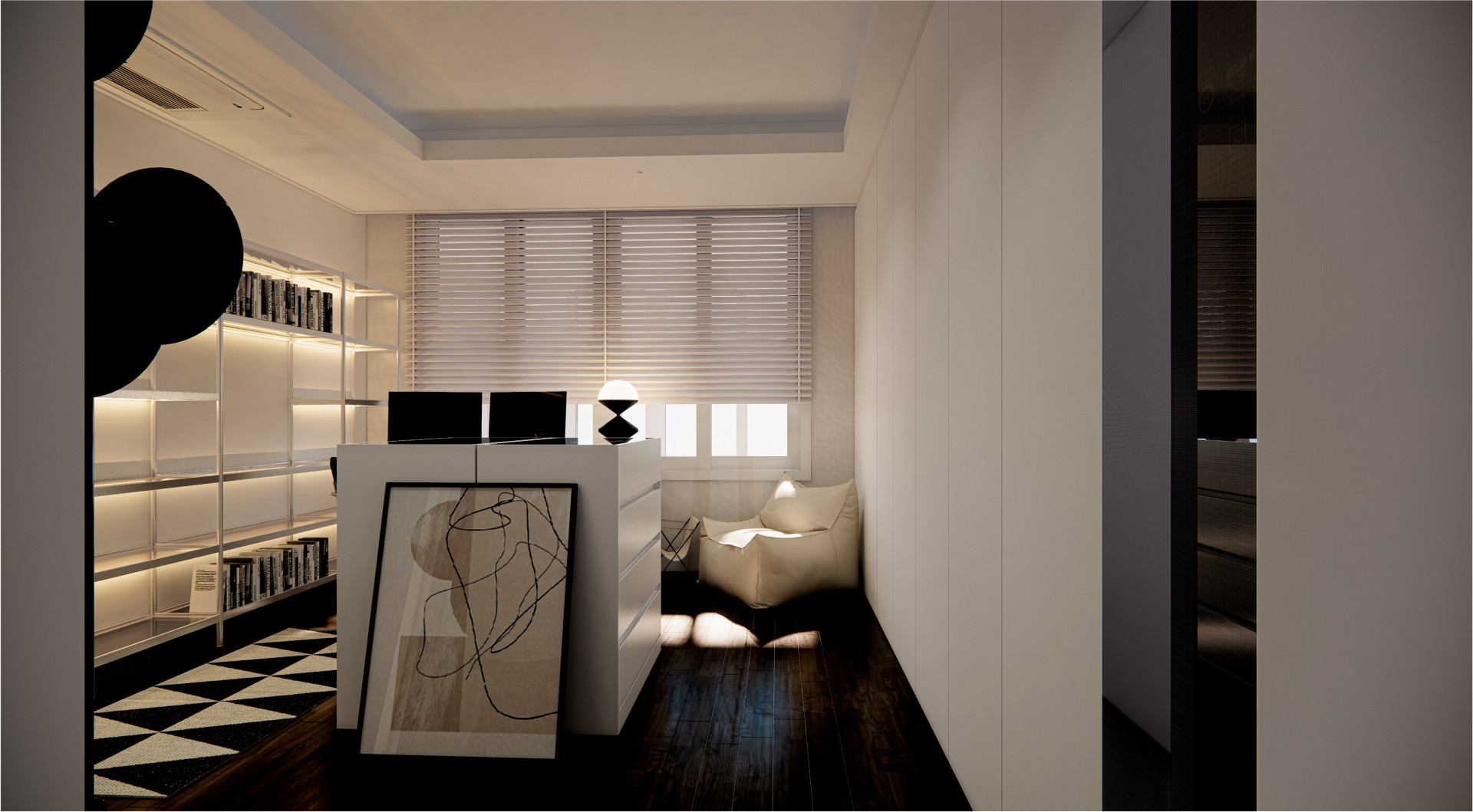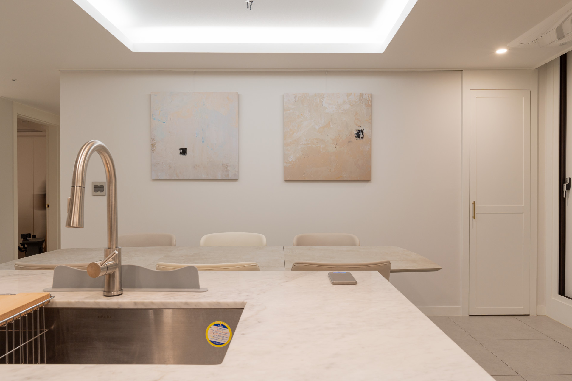 의자는 화이트와 베이지를 섞어 배치해 밋밋할 수 있는 공간에 포인트를 더했습니다. 블라인드도 웜 브라운 컬러를 사용하여 조화로운 분위기를 연출하였습니다.