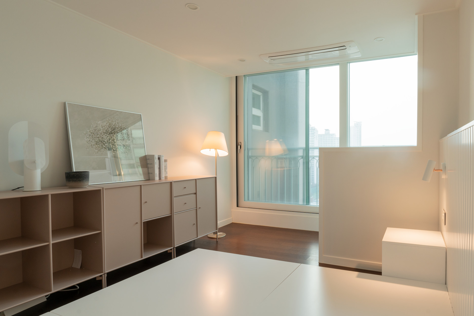 침실 인테리어는 적절한 조명과 색상, 그리고 기능성을 중요시하는 디자인으로 구성합니다. 인테리어티쳐는 뉴트럴 컬러를 활용하여 안정적이고 따뜻한 분위기를 더했어요. 조명의 전구까지 신경 써 눈의 피로를 최소화하도록 설계하였습니다.