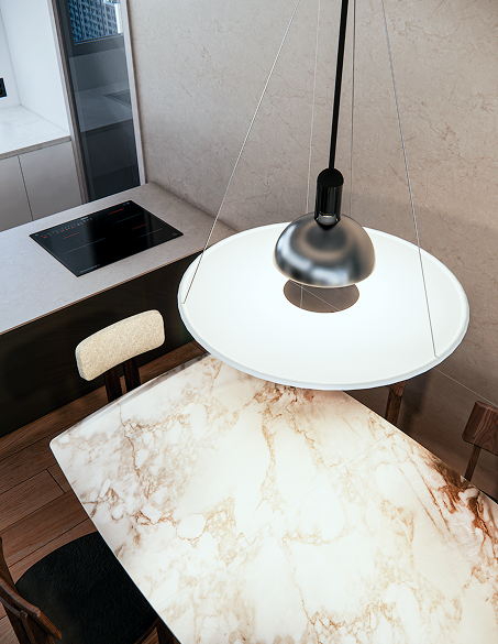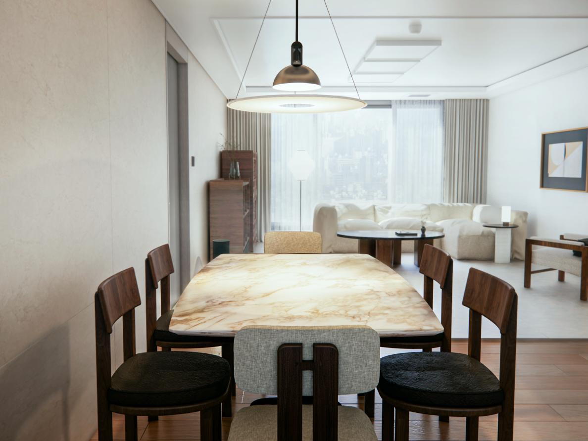 묵직한 우드와 스톤의 조화—다이닝 하나로 완성된