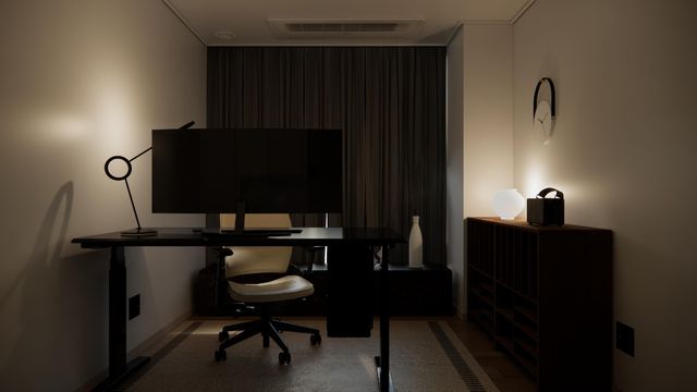 서재 공간은 기존 거실장을 활용하시기로 했기 때문에, 블랙 월넛톤에 맞춘 가구 구성을 제안드렸습니다. 블랙 모션 데스크를 배치하여 중후한 느낌을 주었으나 너무 무거울 수 있는 부분은 화이트 체어와 오브제, 그리고 아이보리톤의 러그를 깔아서 중화시켰습니다.