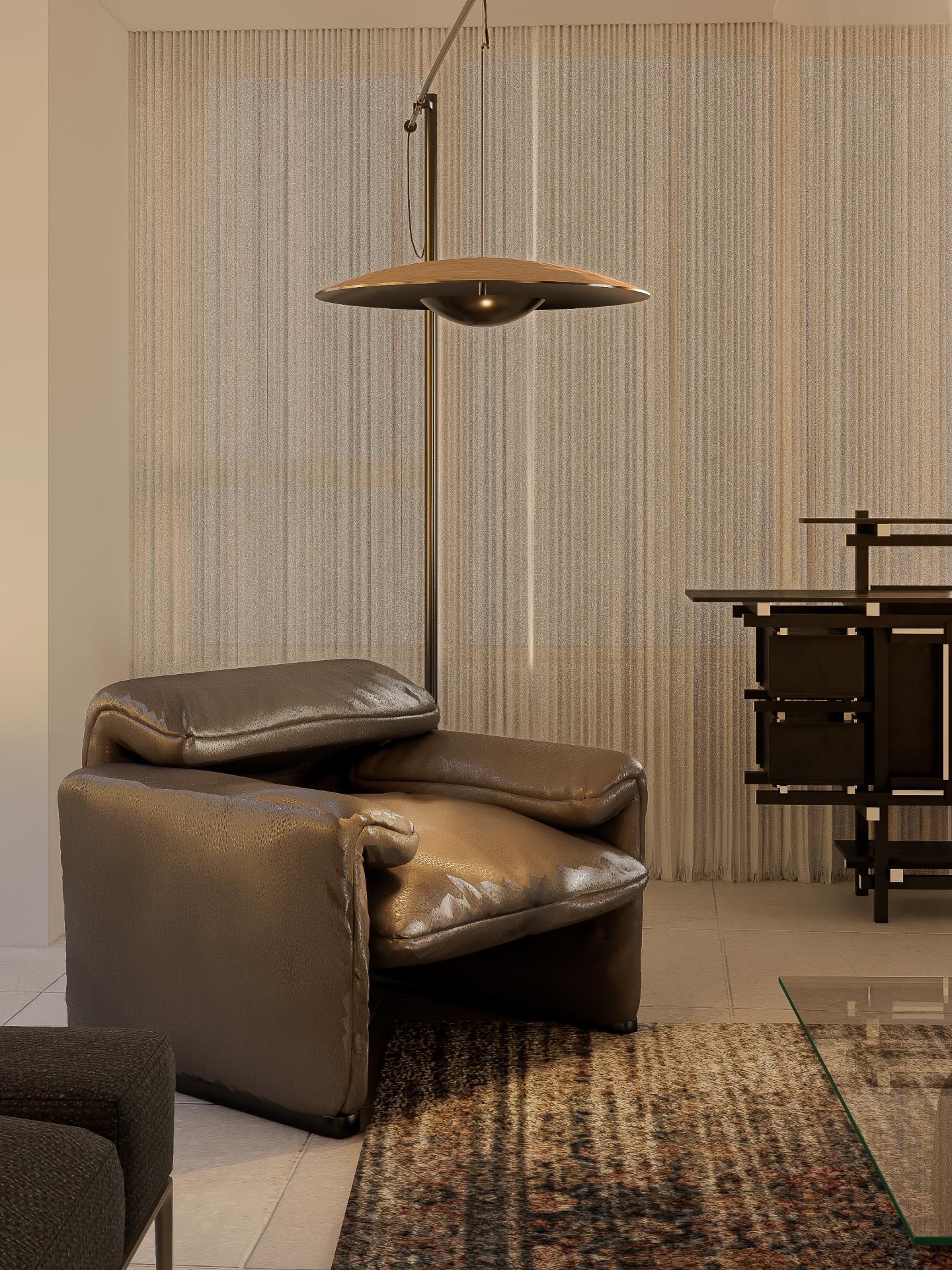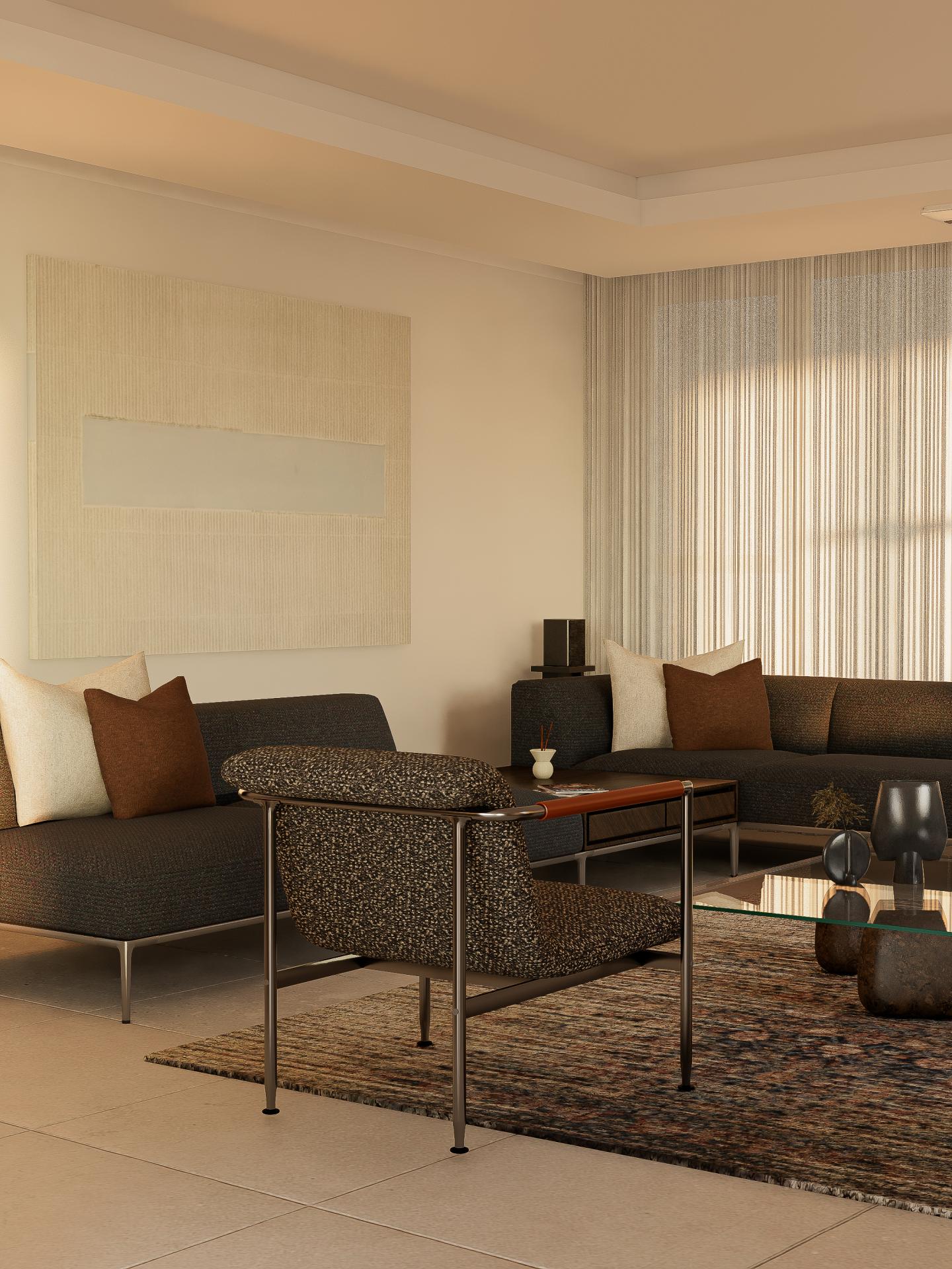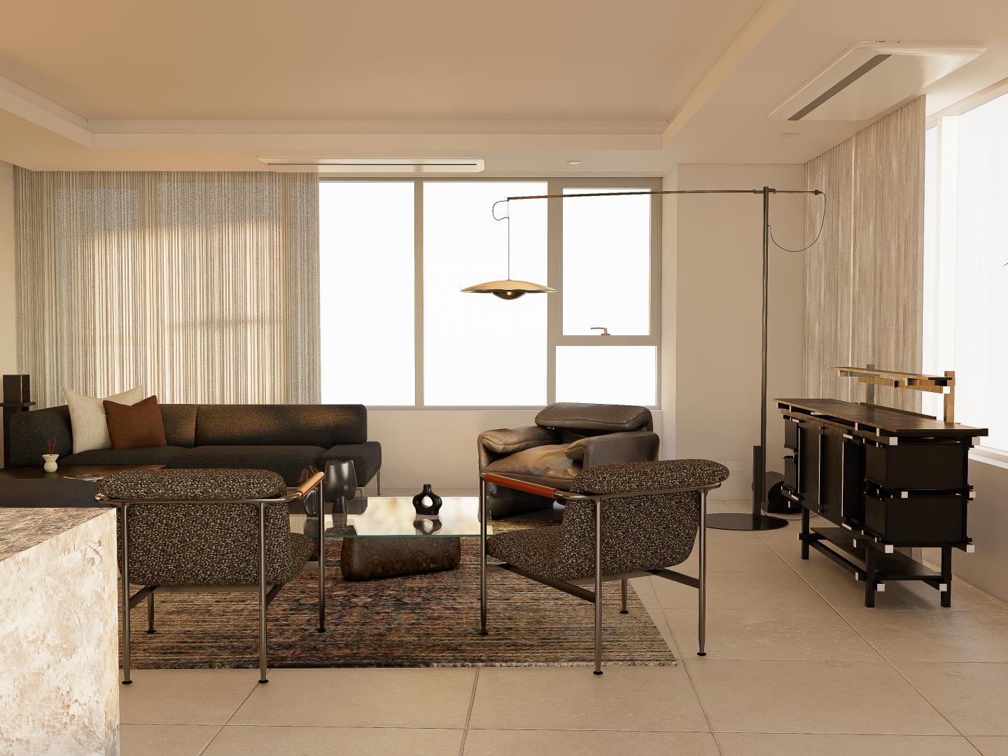 아이코닉한 라운지 체어 배치로 공간의 세련됨을 증가 시켰습니다.
