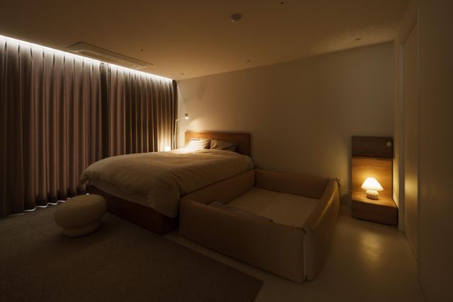 협탁, 스툴, 조명 모두 둥글고 모서리가 날카롭지 않은 가구들로 이루어져 있어 아이와 함께하는 침실이 더욱 안전하고 휴식에 집중하실 수 있도록 계획했습니다. 침구는 크지 않은 패턴이면서 무채색의 패턴을 선택하여 은은하고 세련되게 공간에 포인트를 주고자 하였습니다.