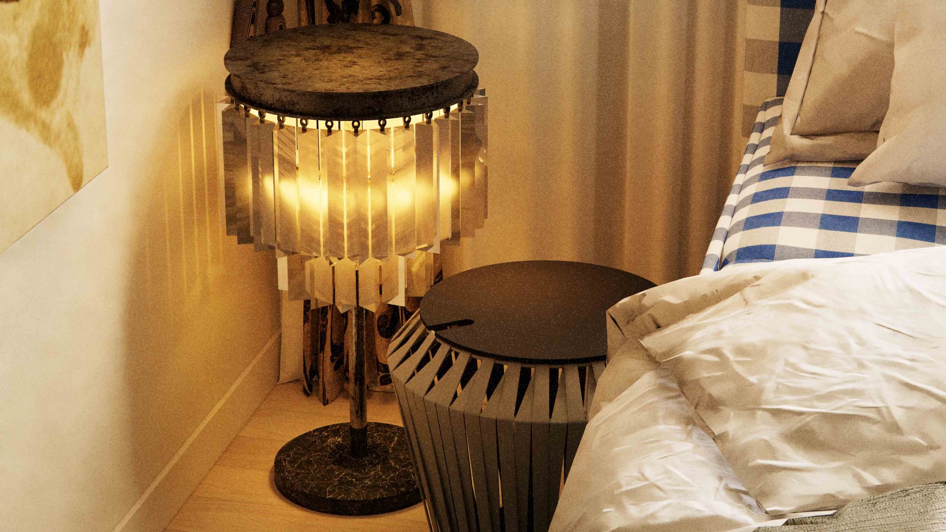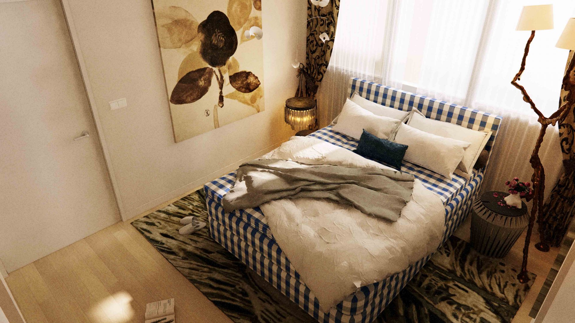 푸른 체크패턴이 시그니쳐인 ‘해스텐스' 2000T 침대가 중앙에 배치되어온전히 쉼에 집중할 수 있는 공간으로 연출해 보았습니다.