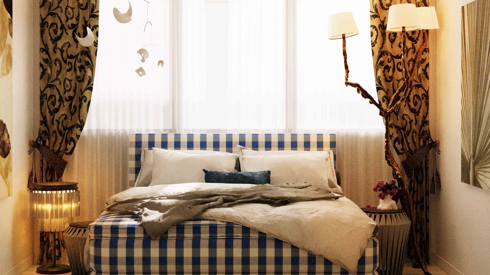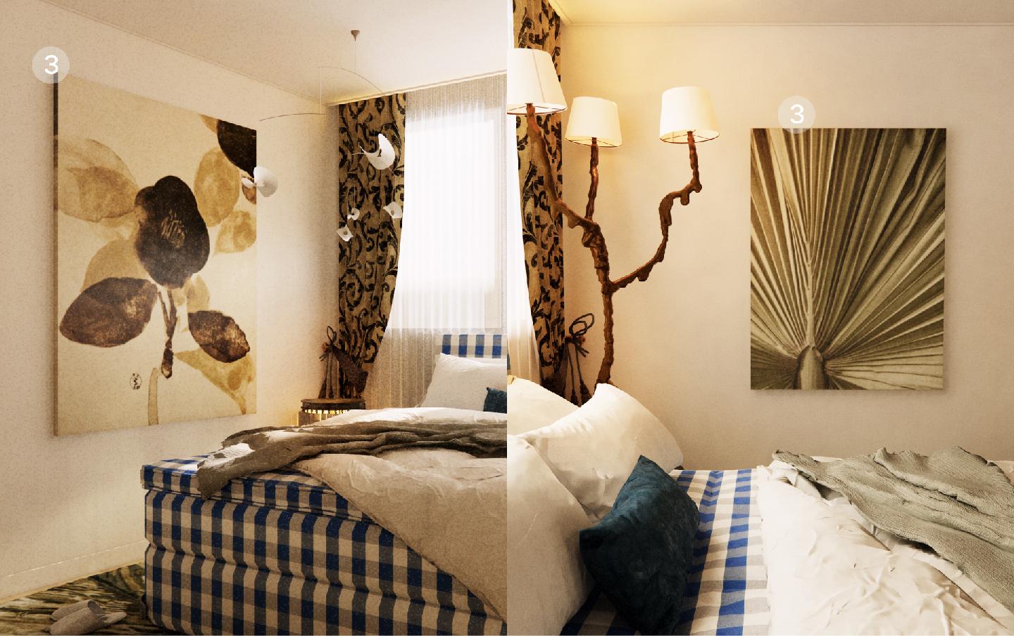 클래식한 디자인에 현대적인 감성과 색채감이 더해져, 어반 클래식에 가까운 거실 인테리어입니다. 컬러 벽지를 시공하는 대신 아트워크와 커튼의 무늬를 활용하여 침실의 고전적인 무드를 극대화합니다. 마치 동화 속에서 잠을 청하는 것처럼 말이지요.