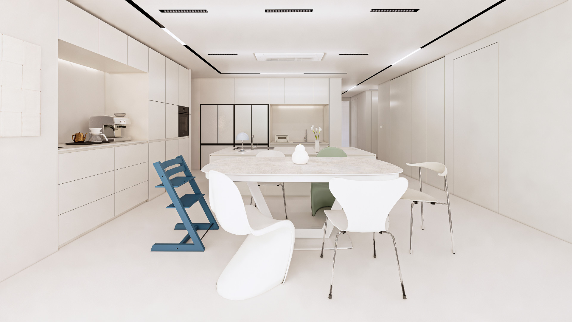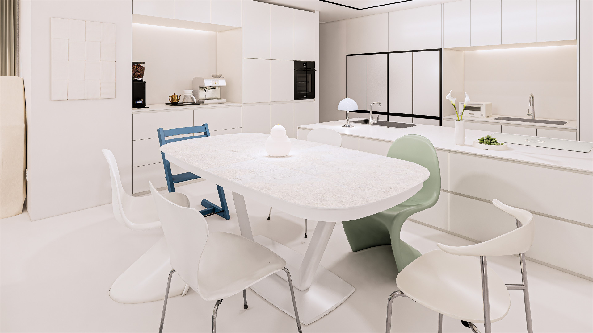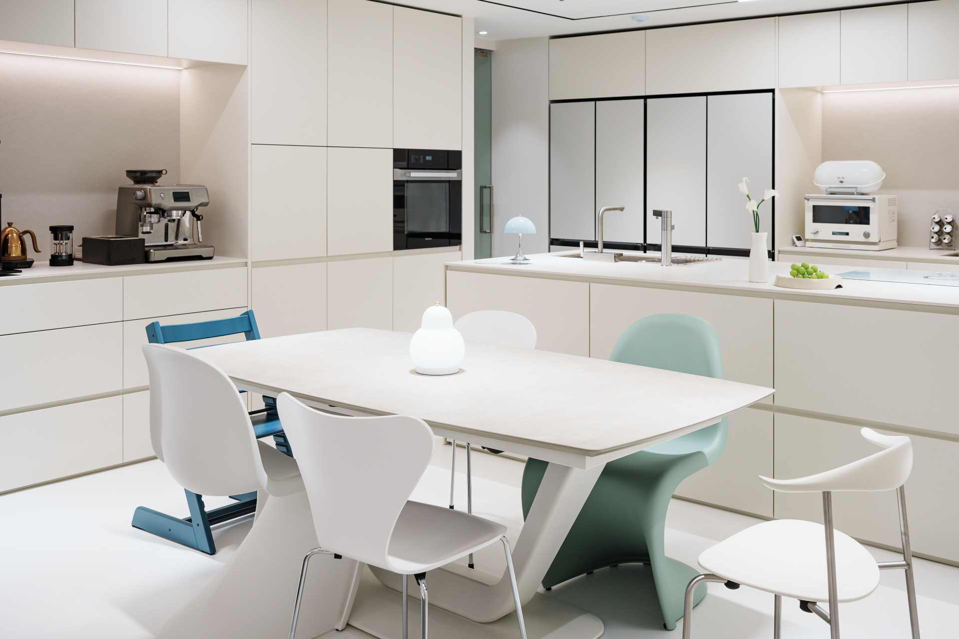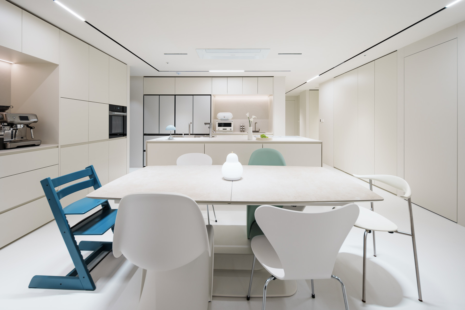 2살이 된 아이와 함께 생활하시기 때문에, 전체적으로 둥근 쉐입의 곡선이 강조된 가구로 아이가 모서리에 다치지 않는 안정적인 환경을 고려하였습니다. 프리츠한센, 비트라 등 다양한 디자인 가구의 조합이 감각적인 60평대 다이닝룸 인테리어를 완성합니다. 이렇게 유튜버 유트루님의 첫 번째 공간이 완성되었습니다.