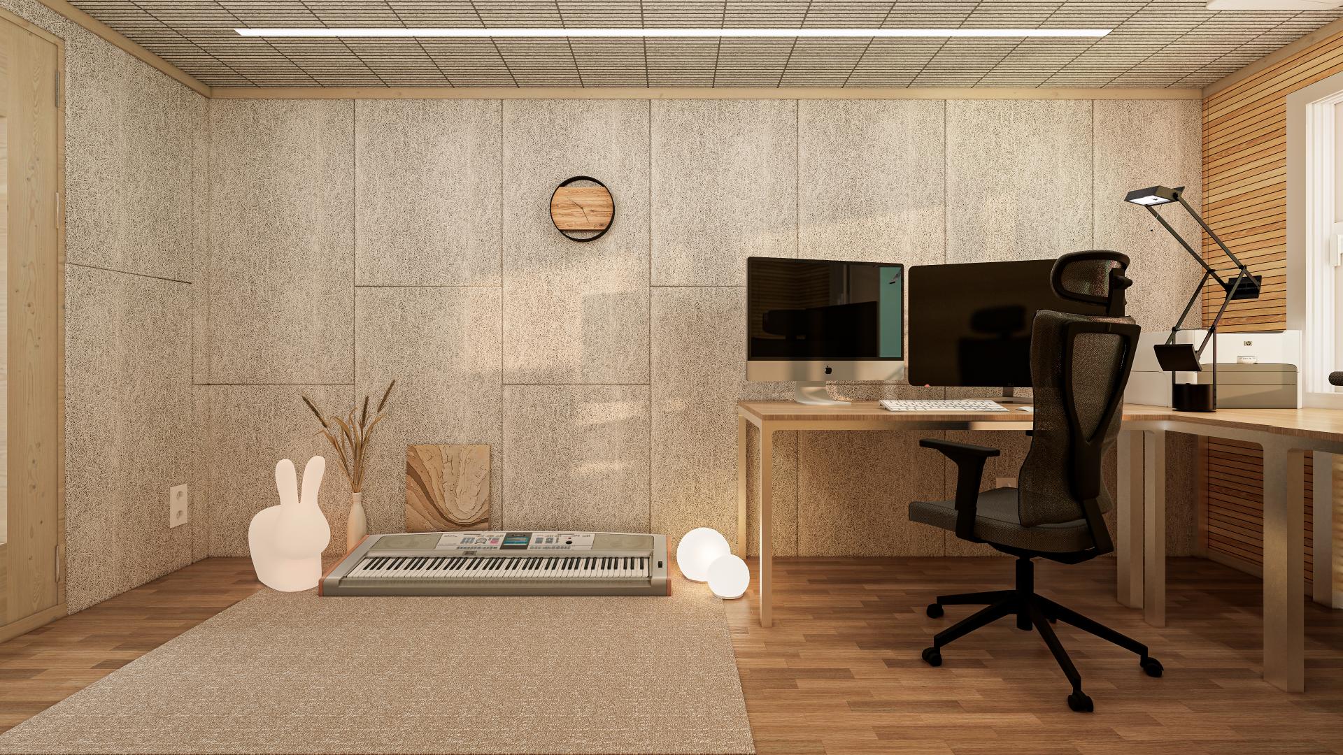방음방은 전체적으로 기존 마감재와, 사용하고 계신 가구에 맞추어 뉴트럴한 톤의 오리엔탈&내추럴 스타일로 진행하였습니다. 편집, 업무 등이 이루어지는 집중 공간으로 사용됨에 따라 색에서 오는 피로감을 줄이고자 블랙&화이트의 무채색을 사용하였습니다. 또한, 메인 컬러로 따뜻한 베이지&우드 톤을 사용하여 릴렉싱이 가능하도록 하였습니다. 따뜻한 색의 조합으로 차분하고 아늑하게 정리하여 편안한 무드가 느껴집니다.