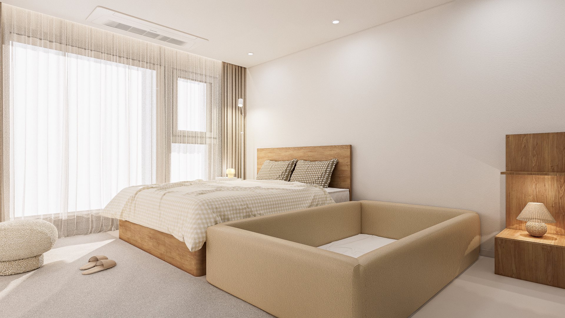 협탁, 스툴, 조명 모두 둥글고 모서리가 날카롭지 않은 가구들로 이루어져 있어 아이와 함께하는 침실이 더욱 안전하고 휴식에 집중하실 수 있도록 계획했습니다. 침구는 크지 않은 패턴이면서 무채색의 패턴을 선택하여 은은하고 세련되게 공간에 포인트를 주고자 하였습니다.