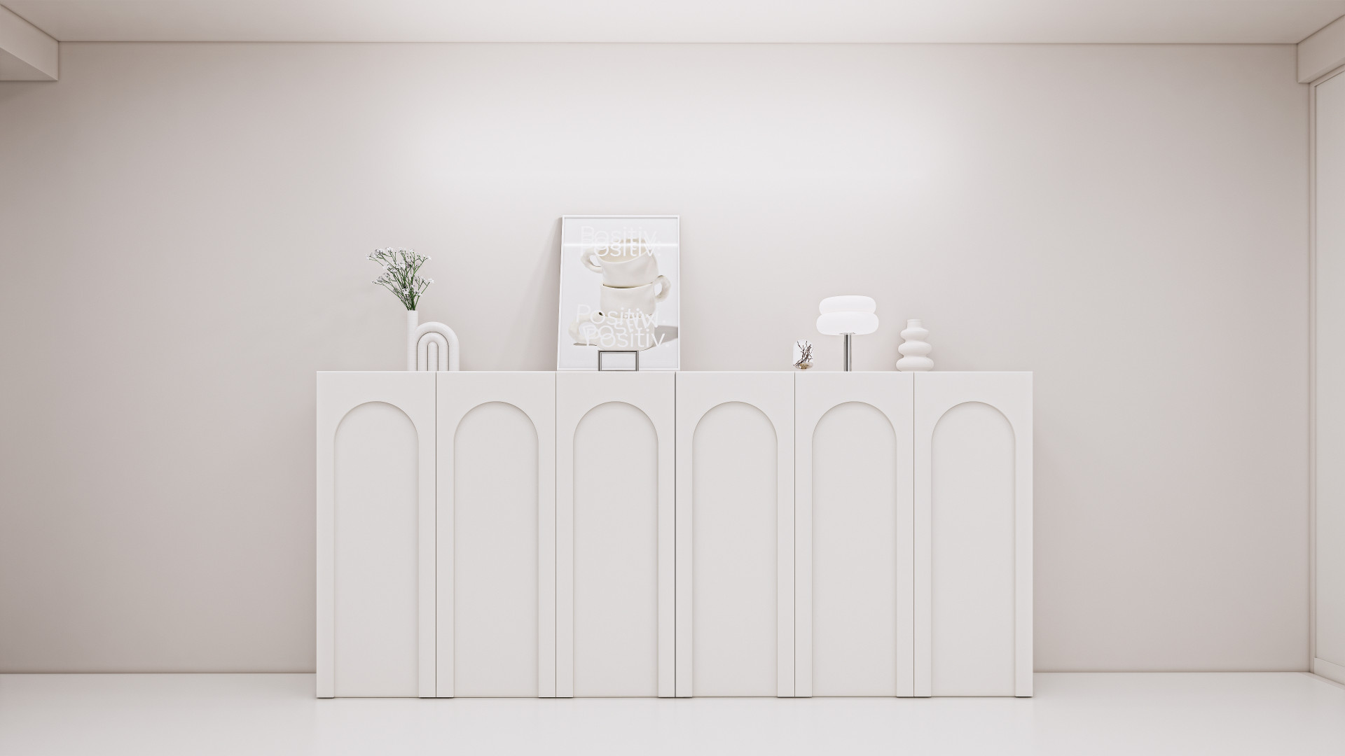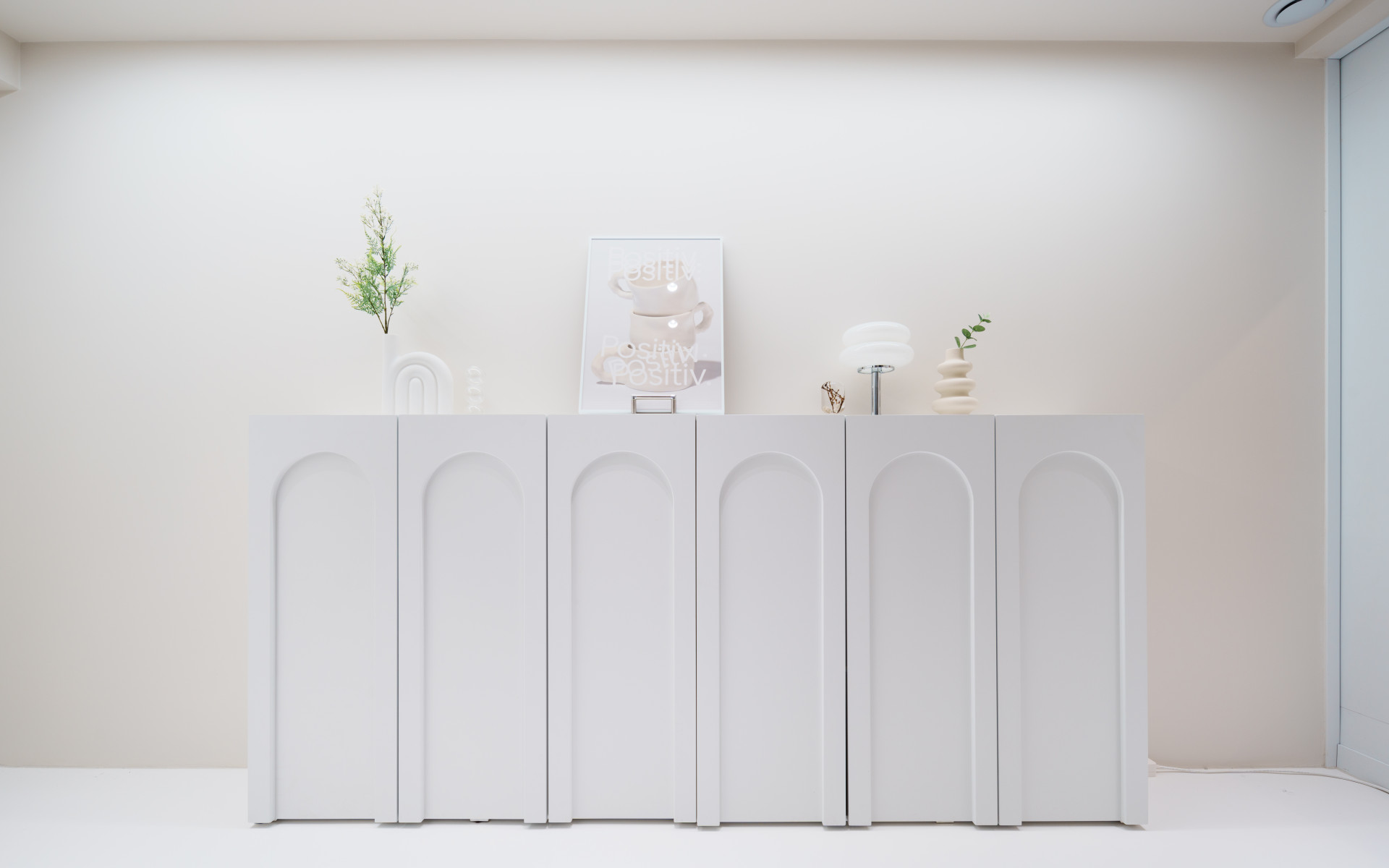 촬영방은 화장품 리뷰를 자주 진행하시는 고객님의 라이프 스타일을 고려하여 얼굴과 제품에만 온전히 집중될 수 있도록 색을 배제한 미니멀 화이트톤을 선택했습니다. 또한 화이트라는 색상이 주는 단조로움을 피하고자 화병과 조명 등은 무게감 있으면서 볼륨감과 형태감이 살아있는 오브제를 선택하여 공간에 위트감과 리듬감을 주었습니다. 오브제들의 전체 톤이 밝은 화이트, 샌드 베이지 등의 톤으로 이루어져 있어 배경이 지저분하지 않습니다.