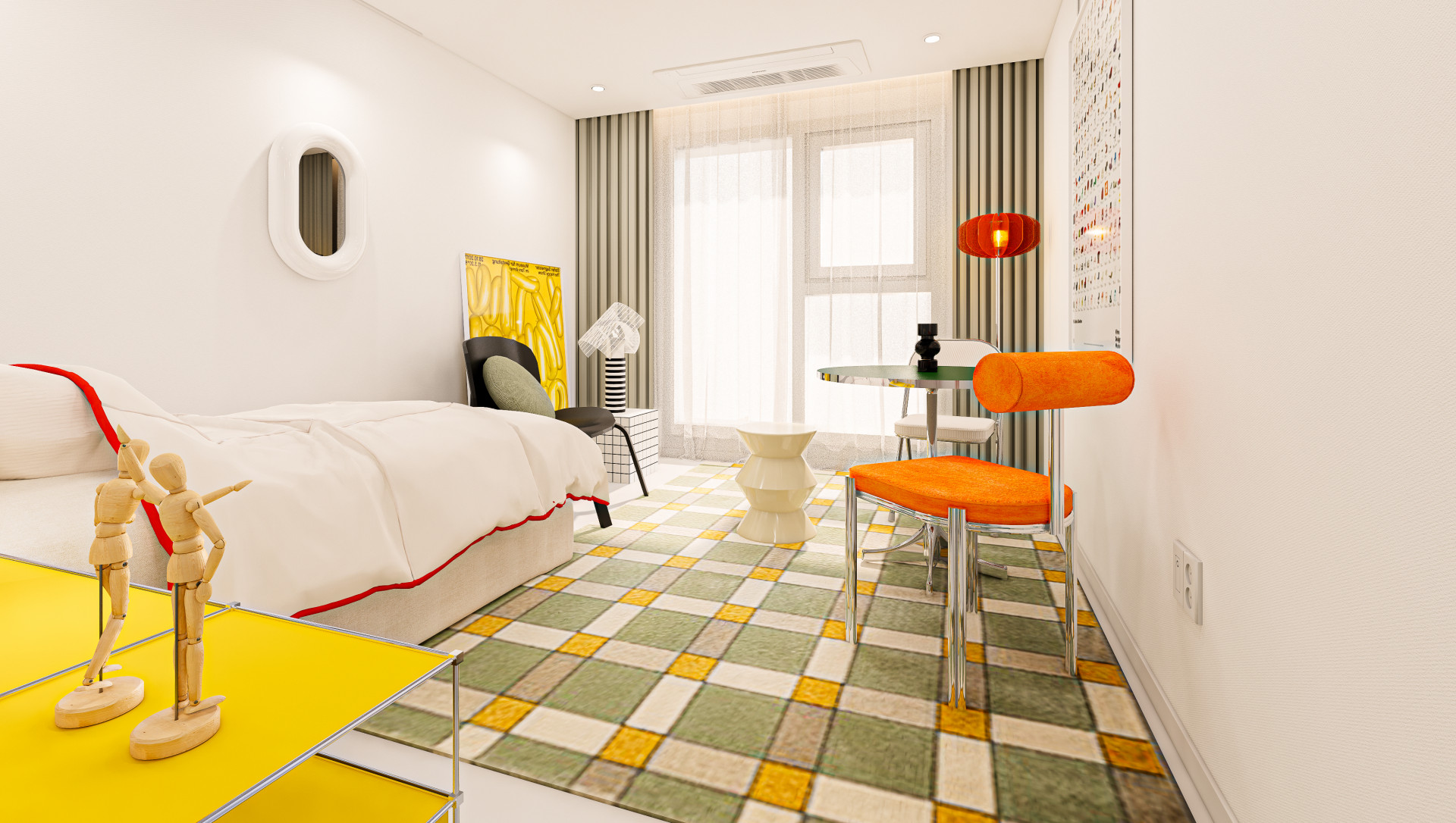 게스트룸은 오렌지, 옐로우, 그리너리한 컬러와 패턴이 과감하게 조합된 미드센추리 스타일입니다. 전체적으로 비비드한 듯 톤 다운된 색감들로 조합되어 있어 차분하고 편안한 인상과 동시에 유니크함이 느껴집니다. 마치 가구 쇼룸에 방문한 것처럼 벽을 장식한 대형 포스터과 적재적소에 배치된 조명이 따스한 무드를 완성합니다. 플라스틱, 스테인리스, 가죽 등 다양한 소재와 재미있는 디자인의 오브제들이 공간을 더욱 존재감 있는 풍성한 공간을 만들어줍니다.