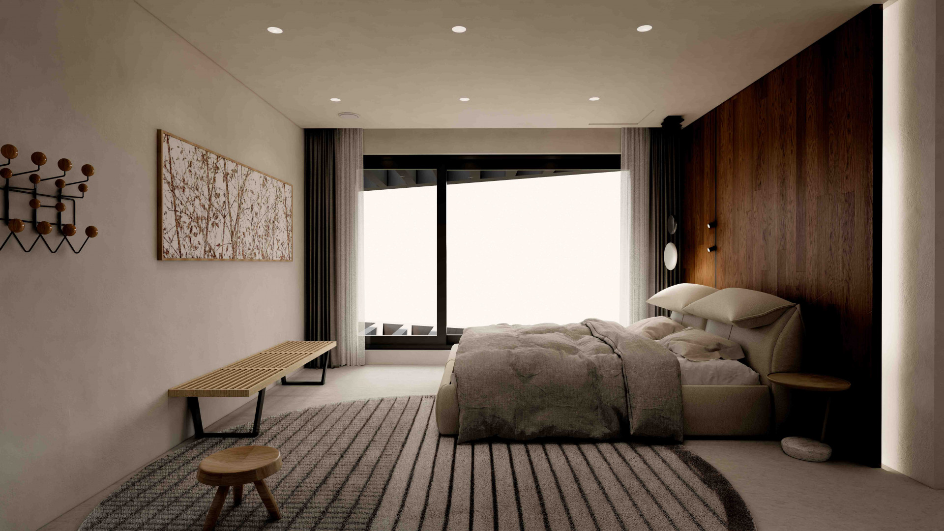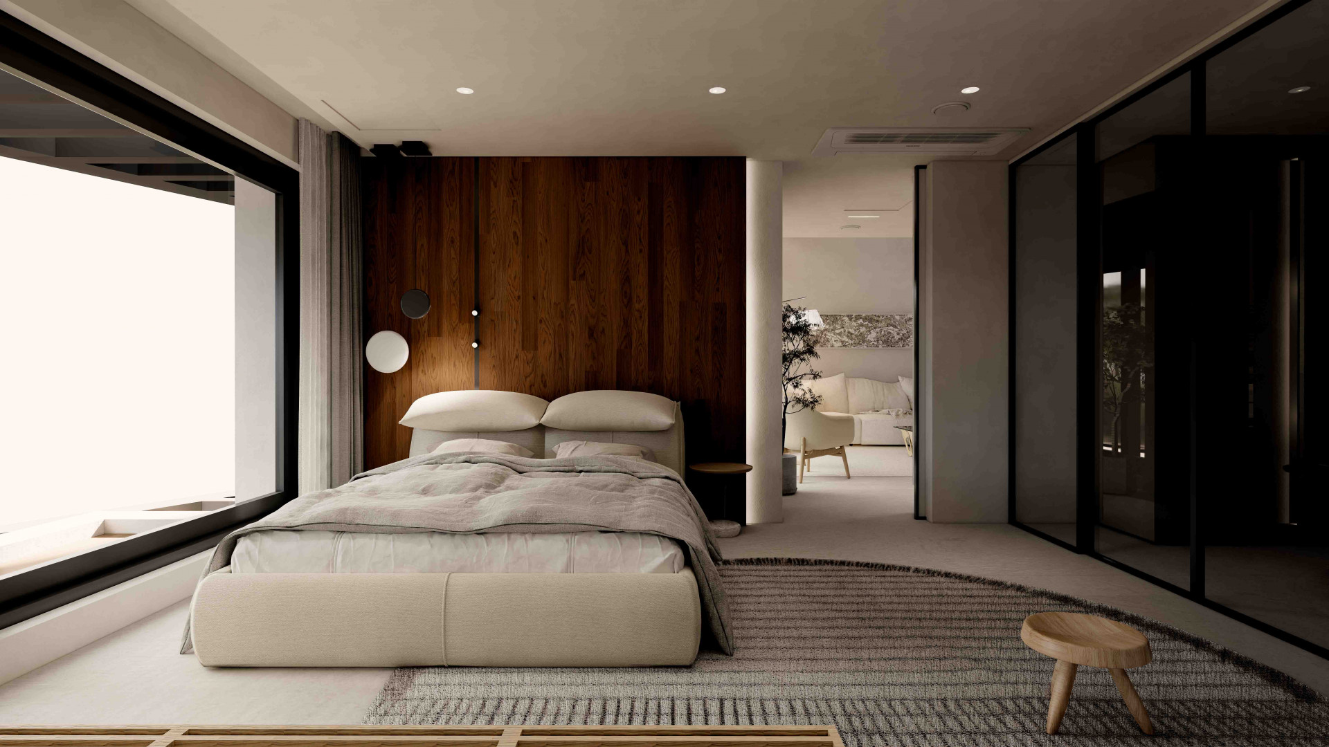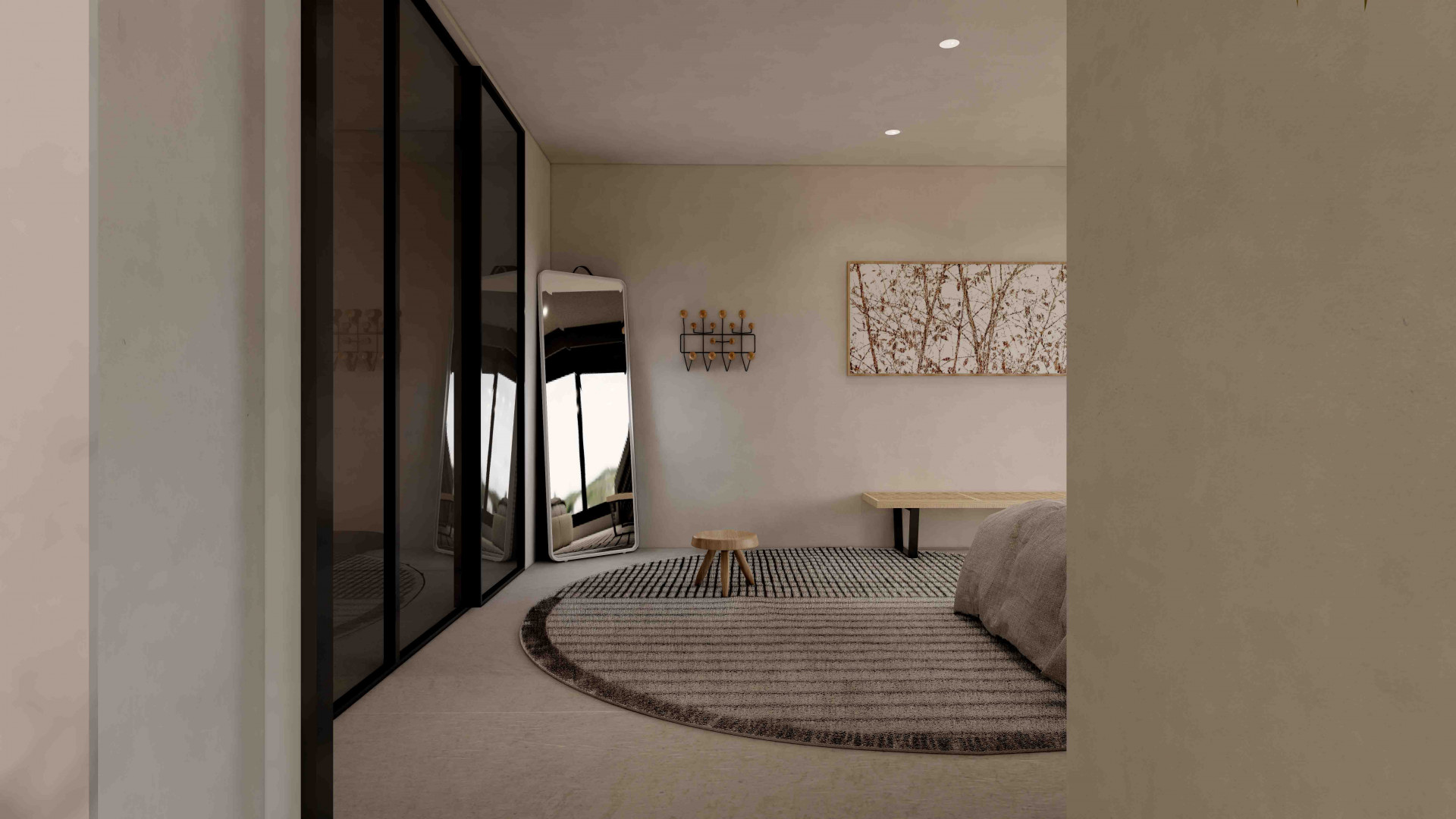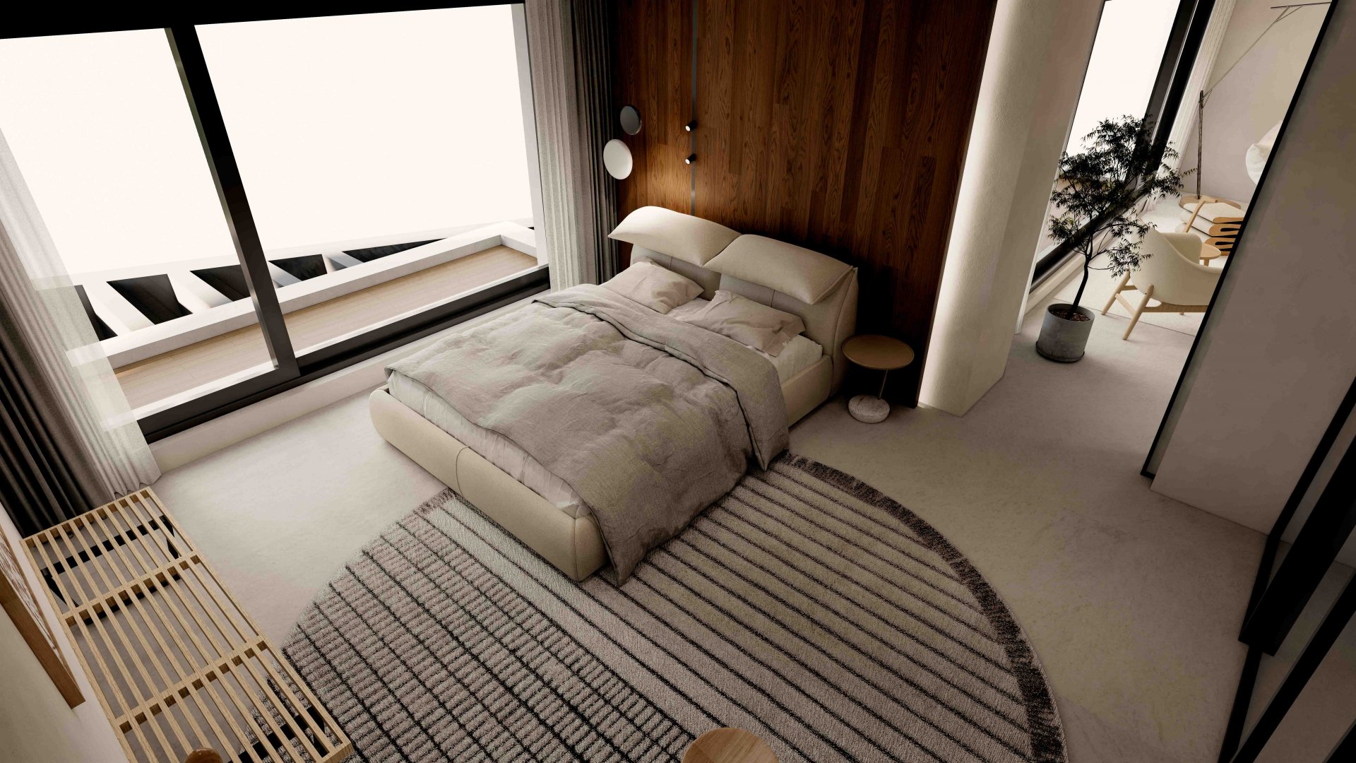 패브릭과 우드의 소재의 조화에 집중하여 검소하면서도 세련된 감성이 느껴지는 아늑한 침실을 스타일링 합니다. 패브릭 소재의 침대프레임을 사용하여 자연스러운 느낌을 강조하면서 따뜻한 느낌이 방안 전체에 퍼질 수 있도록 합니다. 장식적인 요소와 컬러의 사용을 절제하여 침실에서 오롯이 휴식에 집중할 수 있도록 합니다. 원형 러그를 통해 공간을 분리하여 독특한 감성을 지닌 가구 배치를 구성합니다. 모서리에 전신거울을 배치해 창밖의 풍경을 다양한 위치에서 감상할 수 있게 했으며, 이는 공간에서 생동감이 느껴지게 합니다.