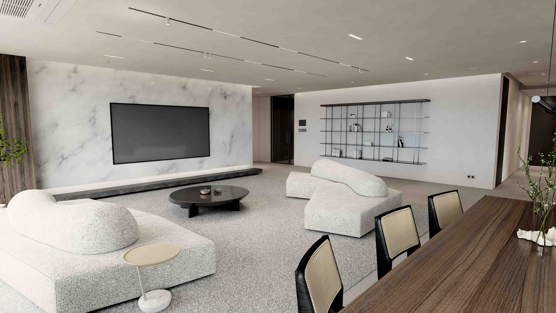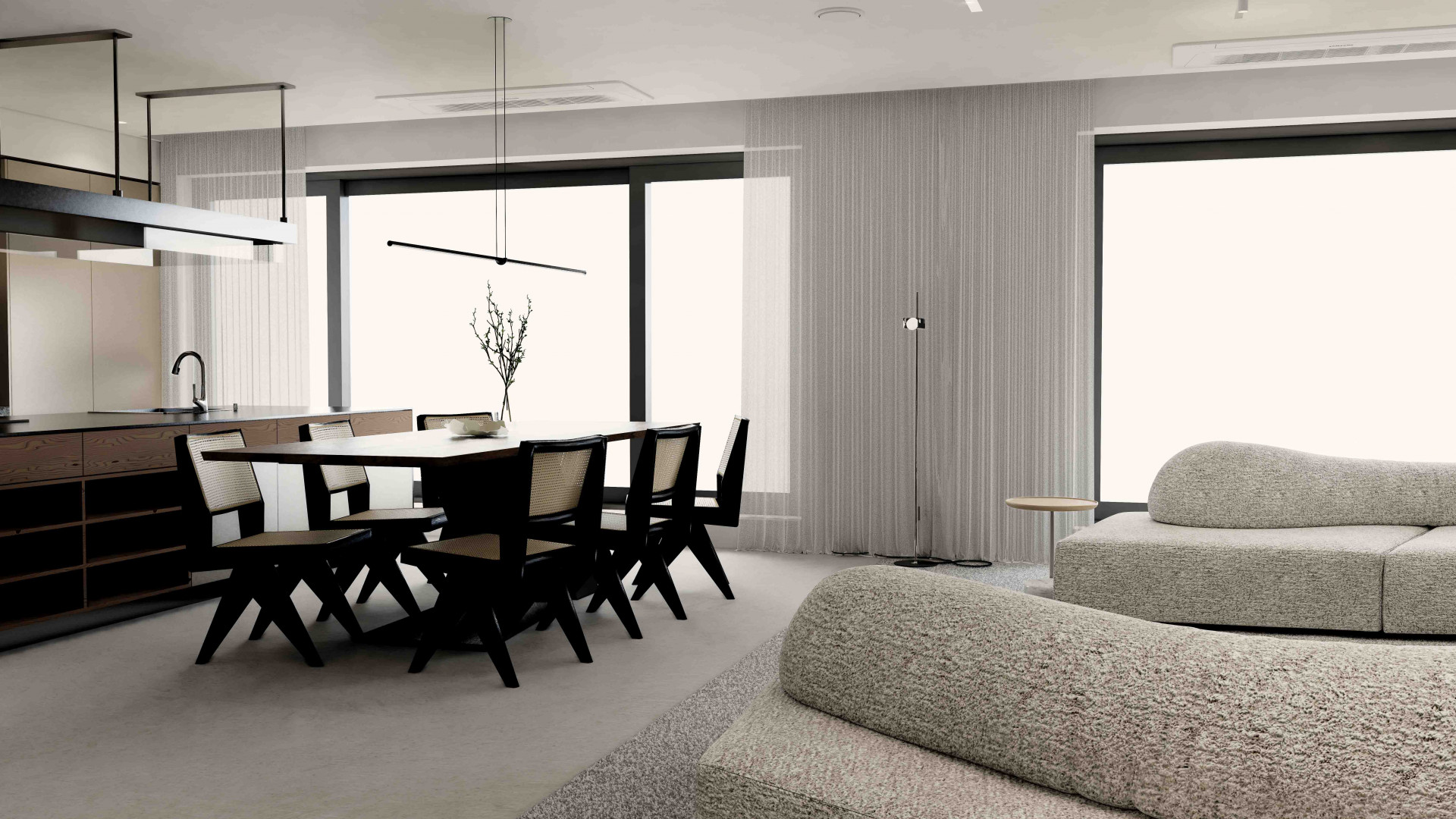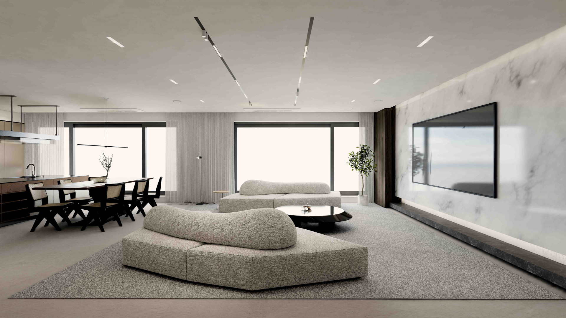 톤온톤의 컬러를 사용하여 공간 전체의 조화를 이루게 합니다. 커튼, 러그 및 가구들에 중립색을 사용하여 고요한 기운을 연출하였고, 이를 통해 세련면서 조화로운 느낌을 주었습니다. Edra의 On the Rocks 소파를 분리하여 재배치함으로써, 공간에 자유로움과 유동성이 느껴지게 합니다. 넓은 소파의 좌판을 원하셨던 고객님을 위해 소파의 모듈들을 고유한 각도와 위치로 배치하여, 개성 있고 편안한 느낌의 소파 배치를 연출합니다.
