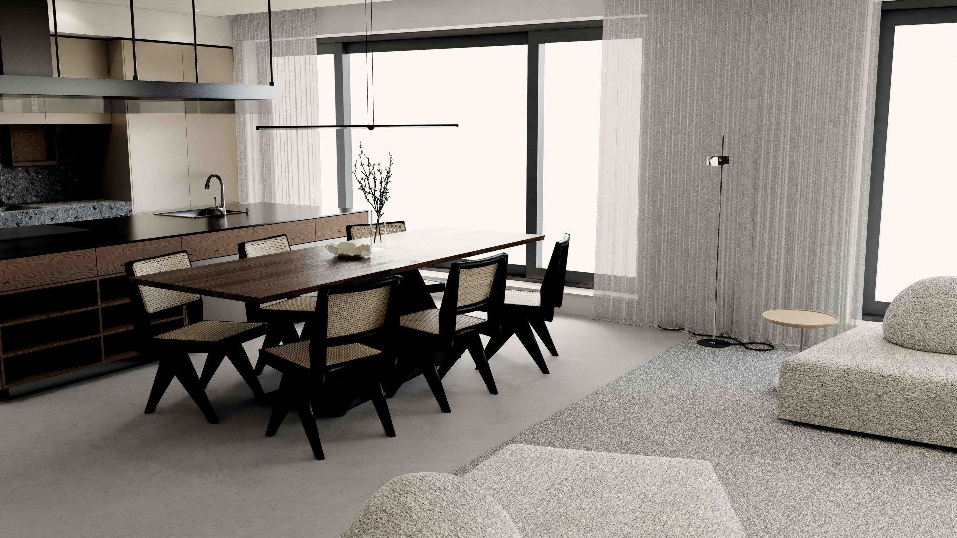 자연스럽게 동선이 이어지는 다이닝룸을 보세요. CASSINA의 Capitol Complex 체어를 사용하여 진중하면서도 내추럴한 다이닝 셋을 구성합니다. 원목 가구들의 조화를 통해 고급스러움과 세련된 느낌이 강조되면서 따뜻한 느낌이 드는 스타일링을 연출합니다.