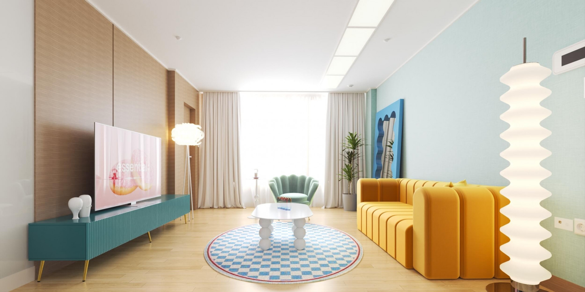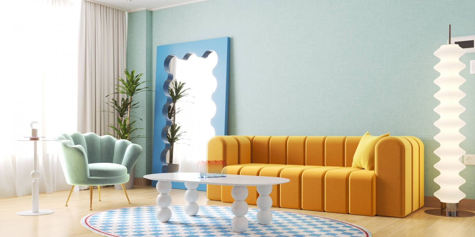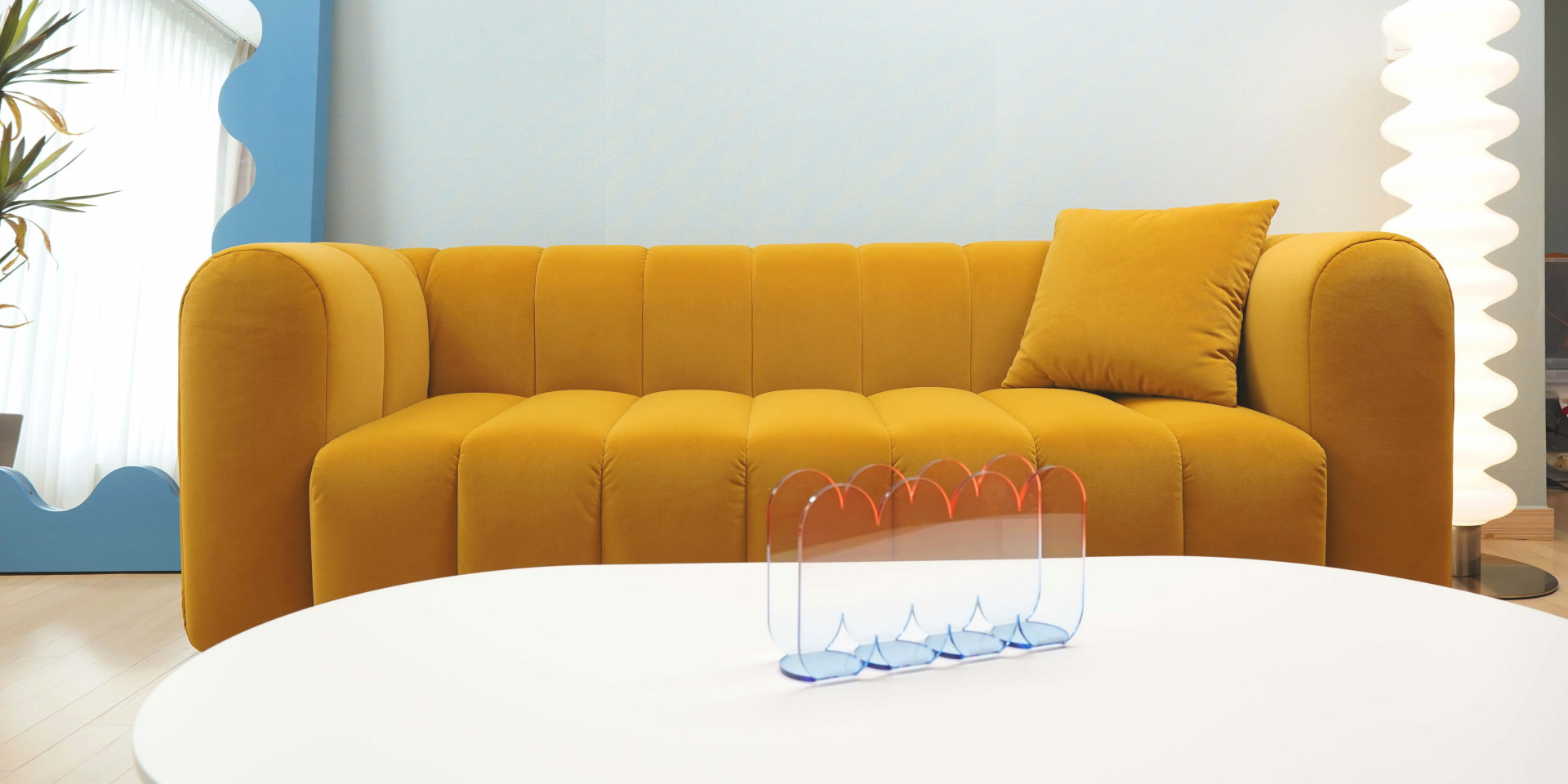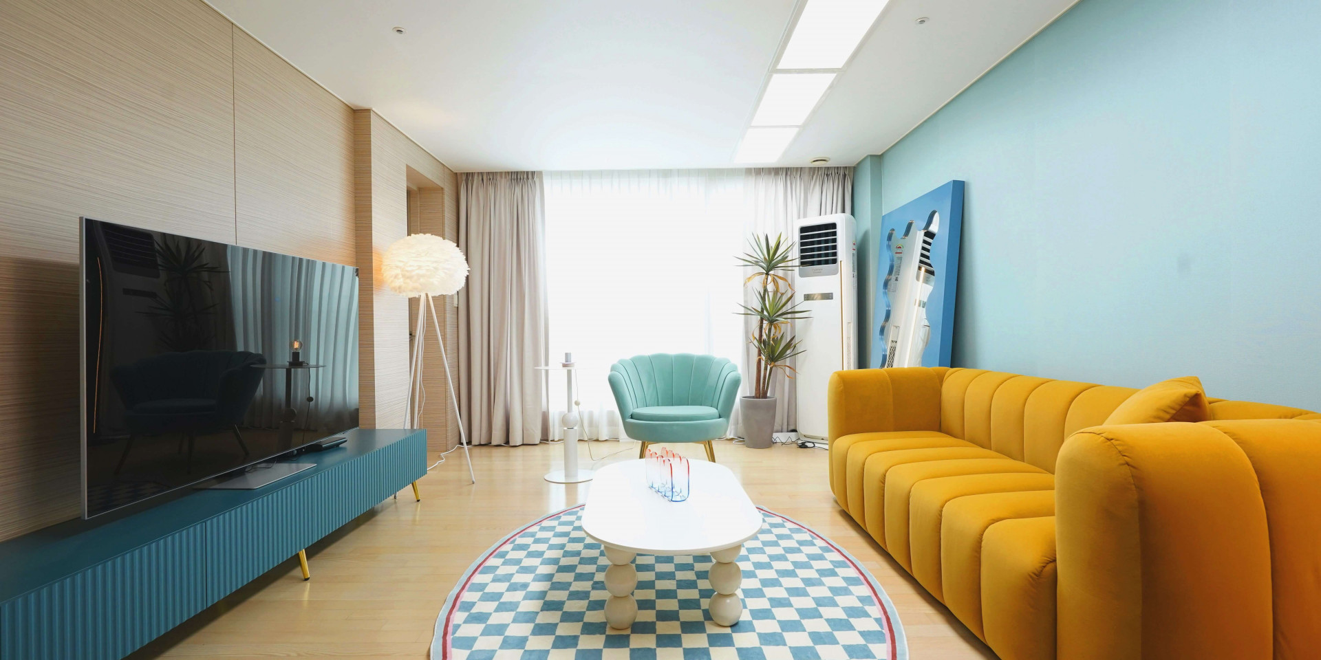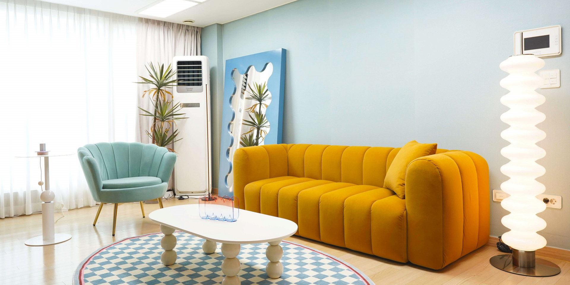 거실에서 소파에 누워있는 경험, 다들 있으실텐데요. 고객이신 시미즈님은 특히 주로 소파에서 시간을 많이 보내는 라이프 스타일을 가지고 계셨고, 이러한 라이프 스타일을 고려해 폭신하고 넉넉한 사이즈로 누울 수도 있는 패브릭 소파를 선택했습니다. 거실 인테리어에 메인이 되는 프렌치 스타일의 벨벳소파는 노란색 머스타드 컬러가 눈길을 사로잡습니다. 곡선이 강조된 형태미와 쨍한 컬러는 자칫 튀어보일 수 있어 마찬가지로 굴곡진 형태의 장스탠드와 거울 등의 가구들을 함께 배치하여 통일감을 주었습니다. 더하여 가구들의 알록달록한 컬러를 통해 레트로한 감성을 더한 공간으로 스타일링을 완성했습니다.