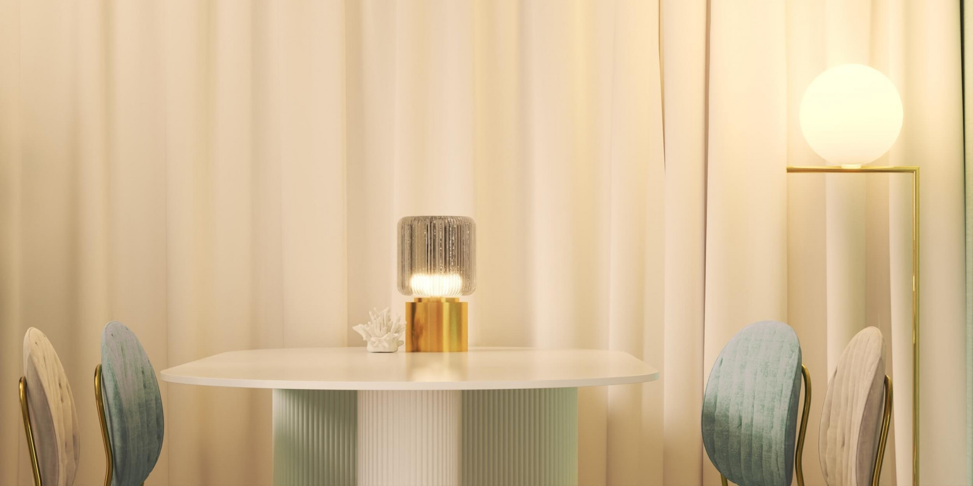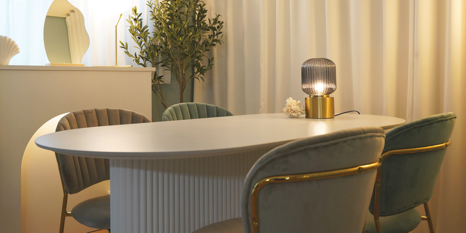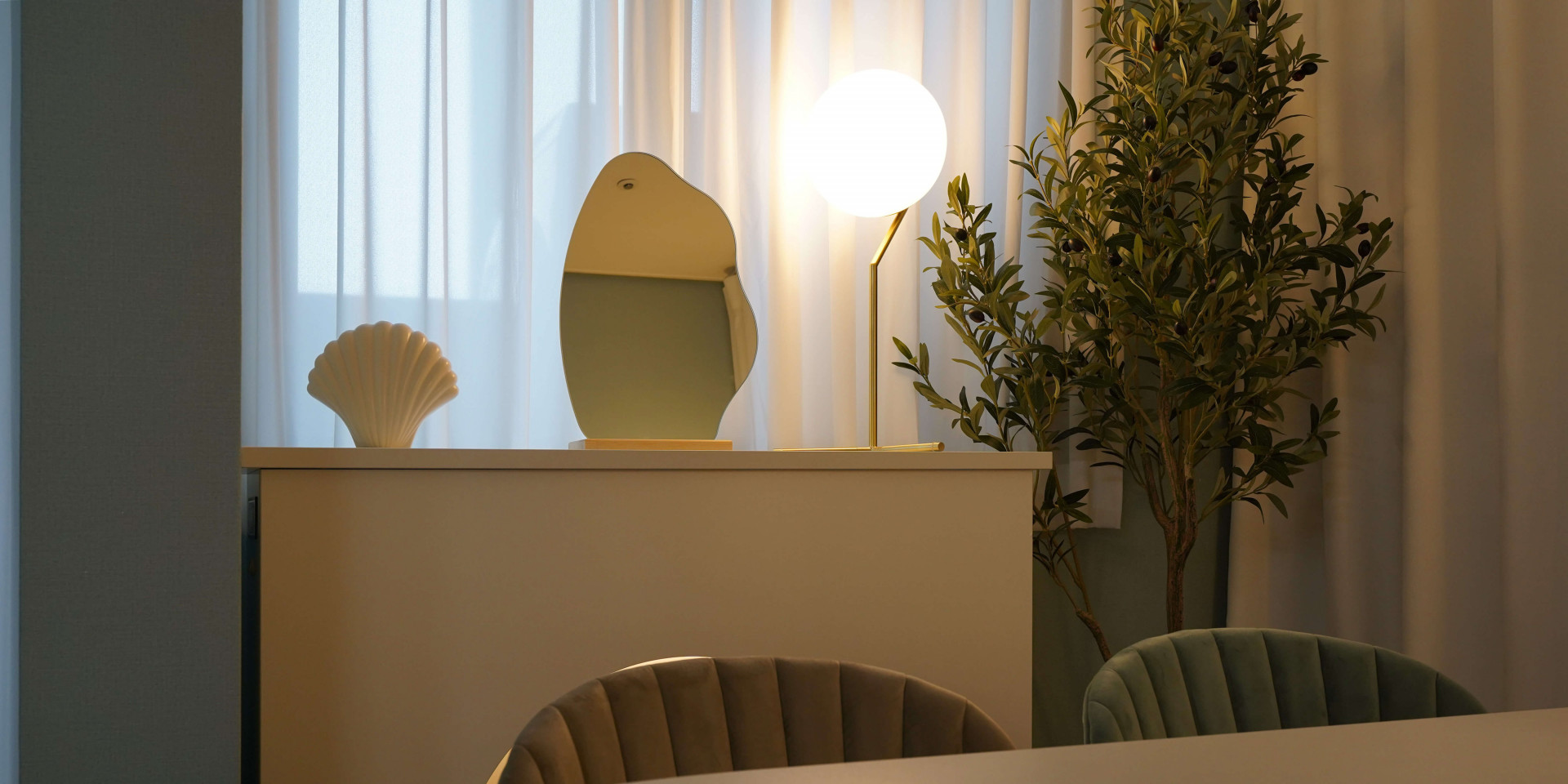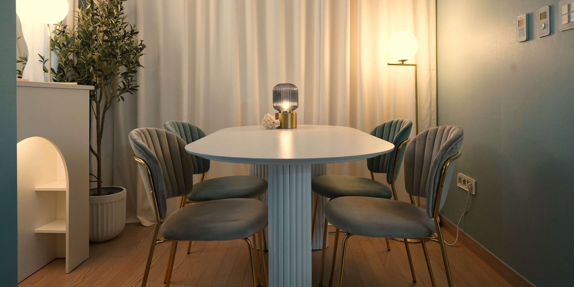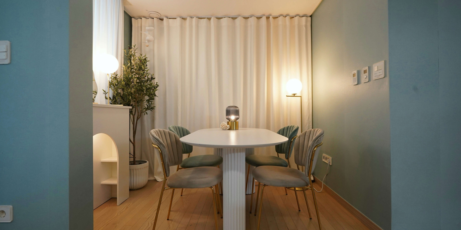 해변의 모래는 햇빛에 하얗게 빛나고, 푸른색 바닷물은 한 번씩 밀려와 모래를 적십니다. 손님을 맞이할 다이닝룸은 푸른색 벽지에 모래가 떠오르는 하얀색 컬러를 조합해 시원한 해변가에 온 것 같은 무드를 조성했습니다. 여기에 골드톤의 컬러를 사용해 세련된 포인트를 더하고 바다 거품을 닮은 구 형태의 조명을 반복적으로 사용해 디테일과 완성도를 높였습니다. "손님을 최대 5~6명 정도 초대할 수 있었으면 좋겠어요." 다이닝에 대한 시미즈님의 요청도 잊지 않고 반영하여 최대 6명이 사용할 수 있는 1600mm 사이즈의 테이블을 공간의 중심에 배치해 다이닝룸의 실용성도 힘께 챙겼습니다.
