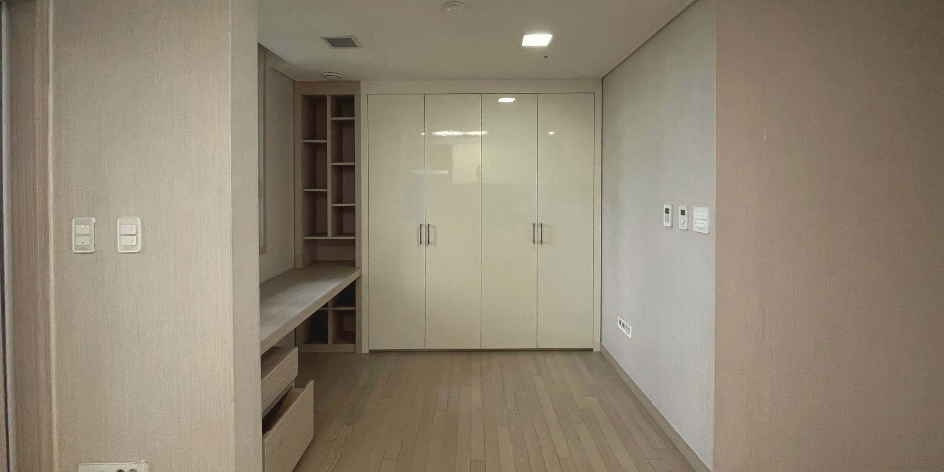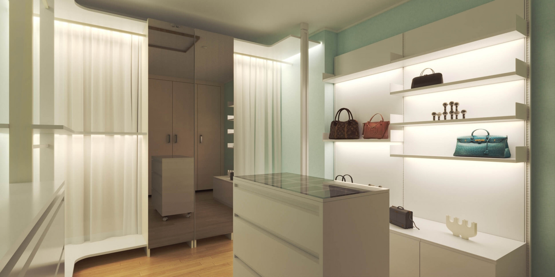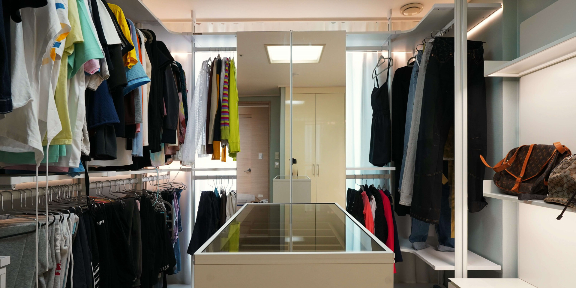 쇼룸에 가면 유독 전시된 제품이 더 돋보이고 아름답게 느껴집니다. 바로 진열장에 내장된 간접조명 덕분인데요. 시미즈님의 드레스룸도 이러한 간접조명을 활용해 마치 고급 쇼룸처럼 불을 켜면 진열장, 수납장의 조명에 빛이 들어와 전시된 옷과 가방, 신발 등이 더 돋보일 수 있도록 연출했습니다.