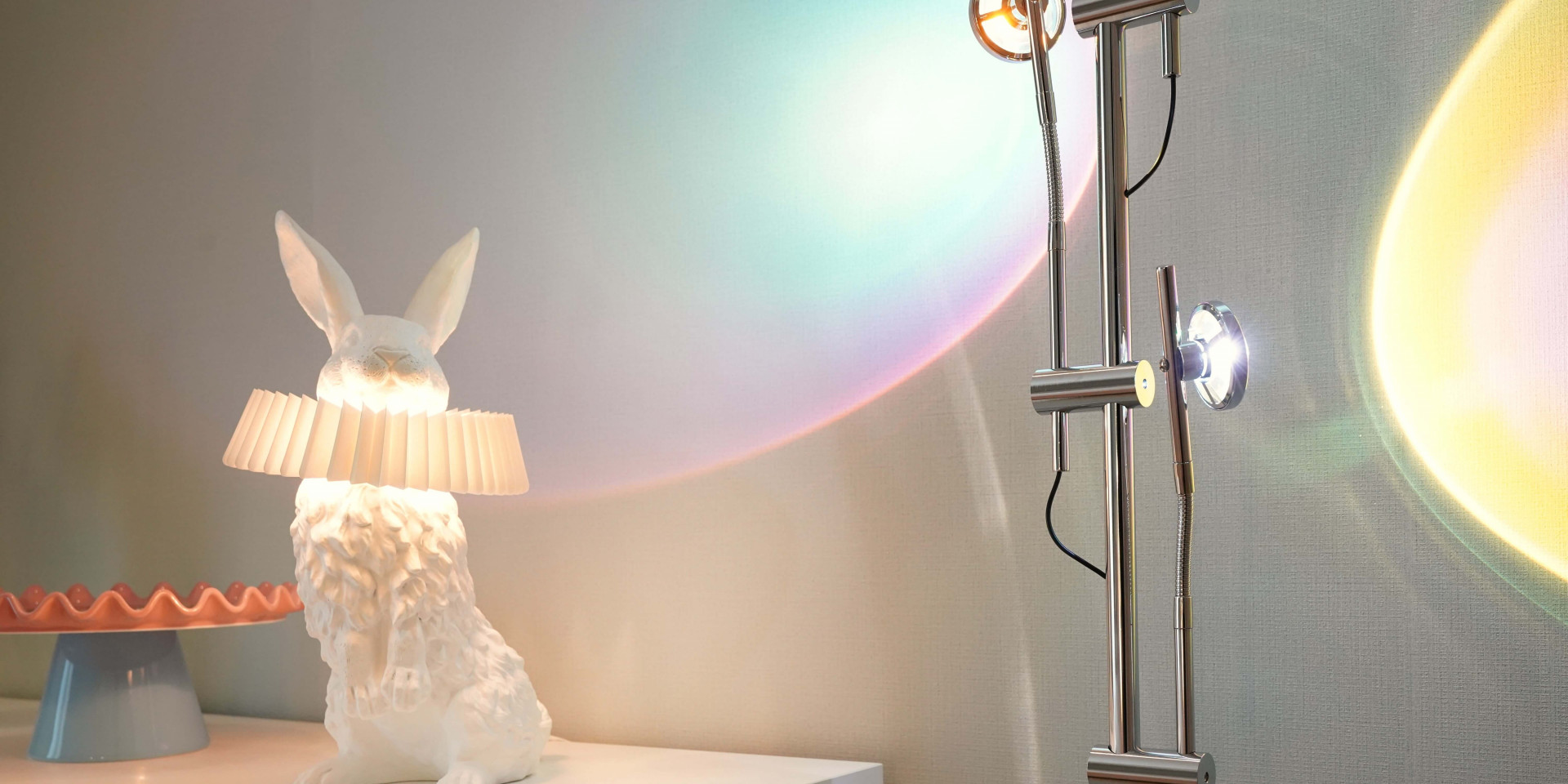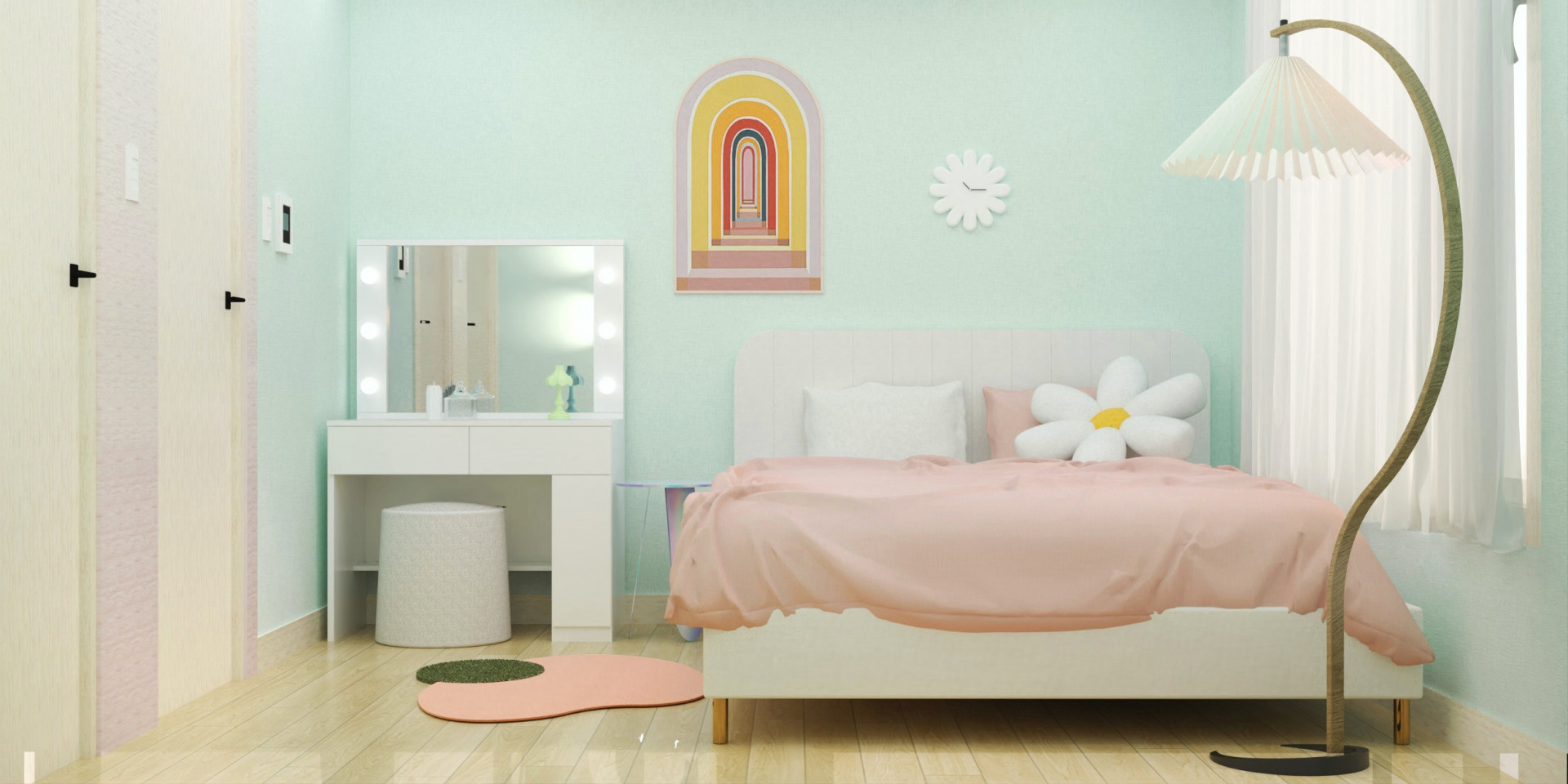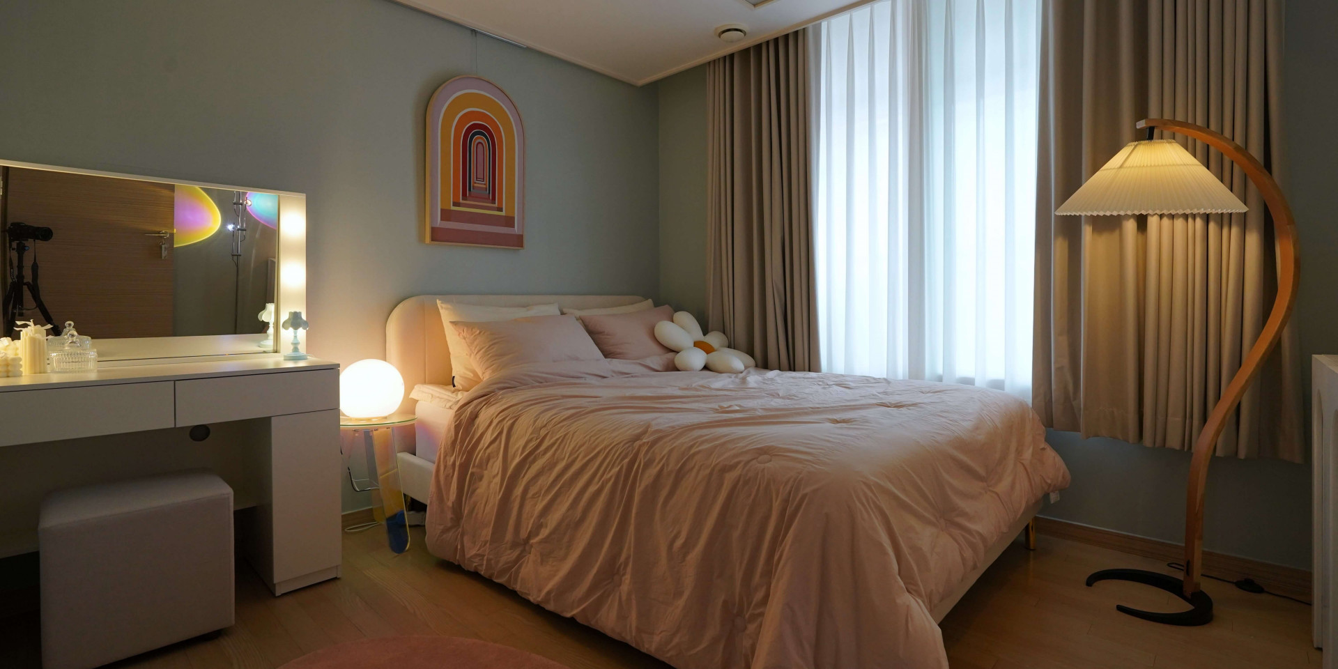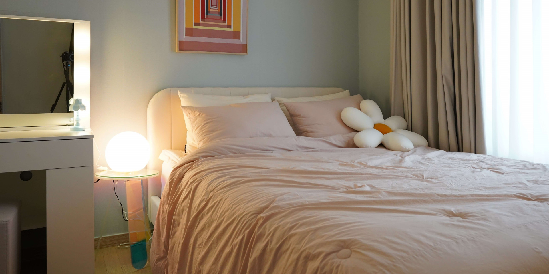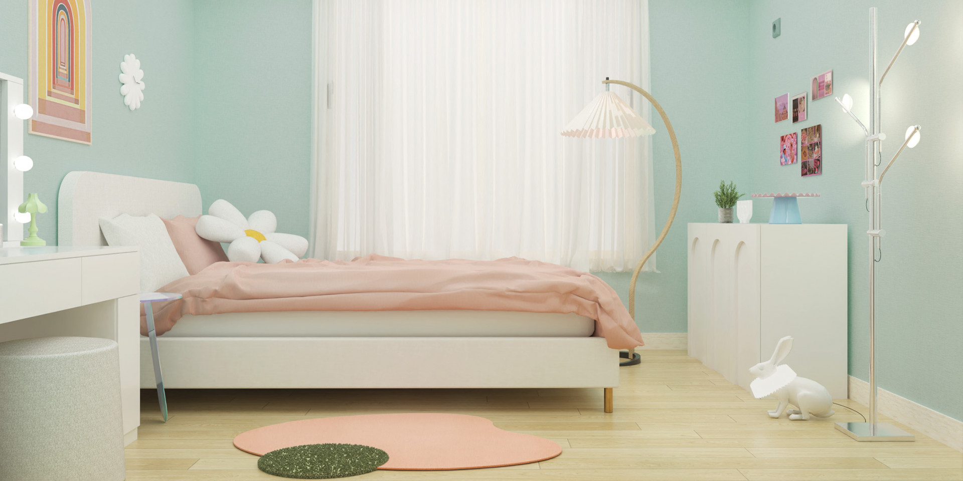 핑크색 포인트가 눈에 띄는 침실. 여기 놓인 꽃 모양의 방석, 토끼모양의 조명 등 키치한 소품은 이곳을 마치 원더랜드 속 한 공간처럼 보이게 만듭니다. 프랜치 스타일 침실을 조명 및 오브제로 키덜트적인 요소를 더해 동화속에 들어온 것 같은 꿈같은 공간으로 풀어냈습니다.