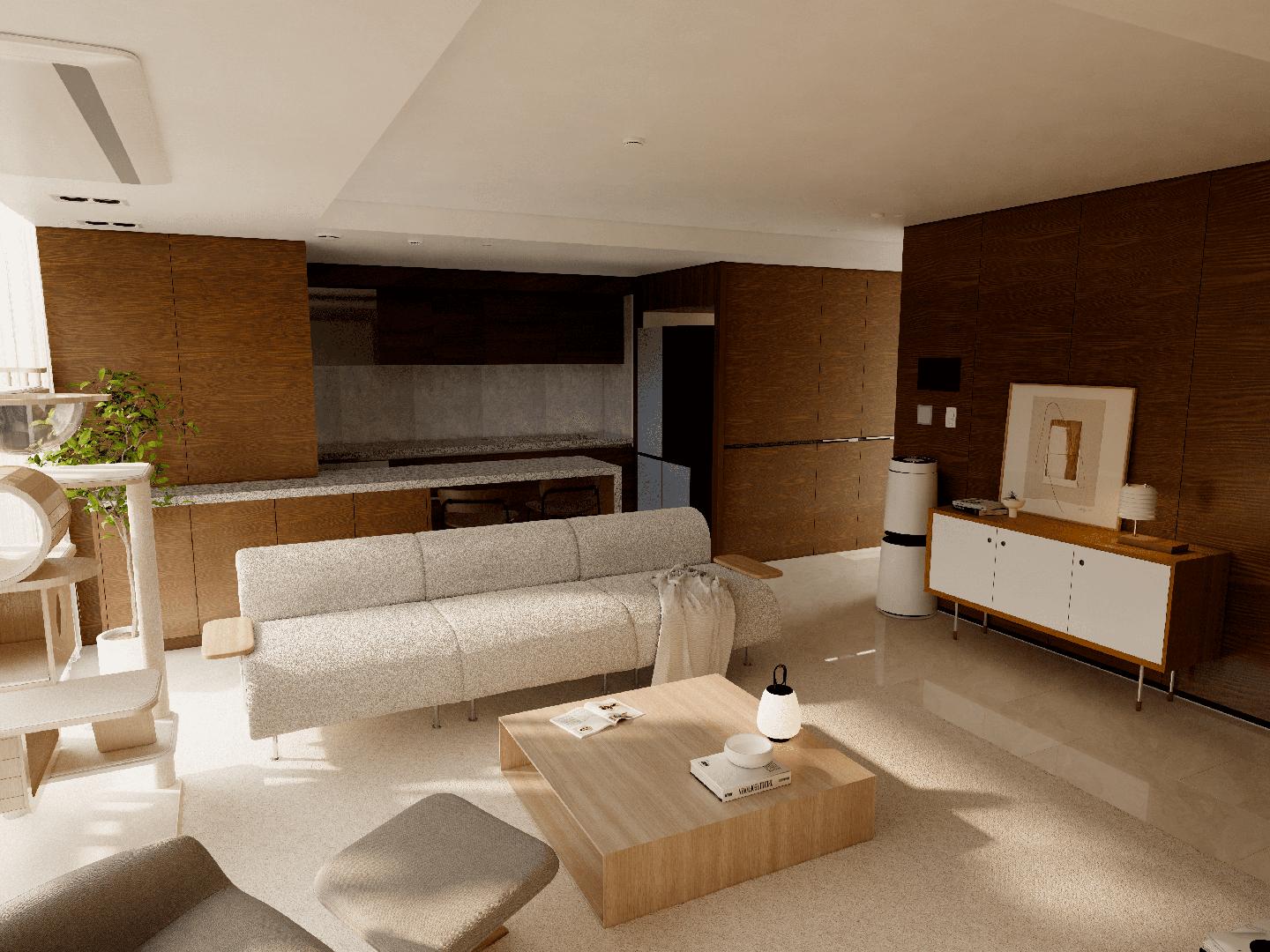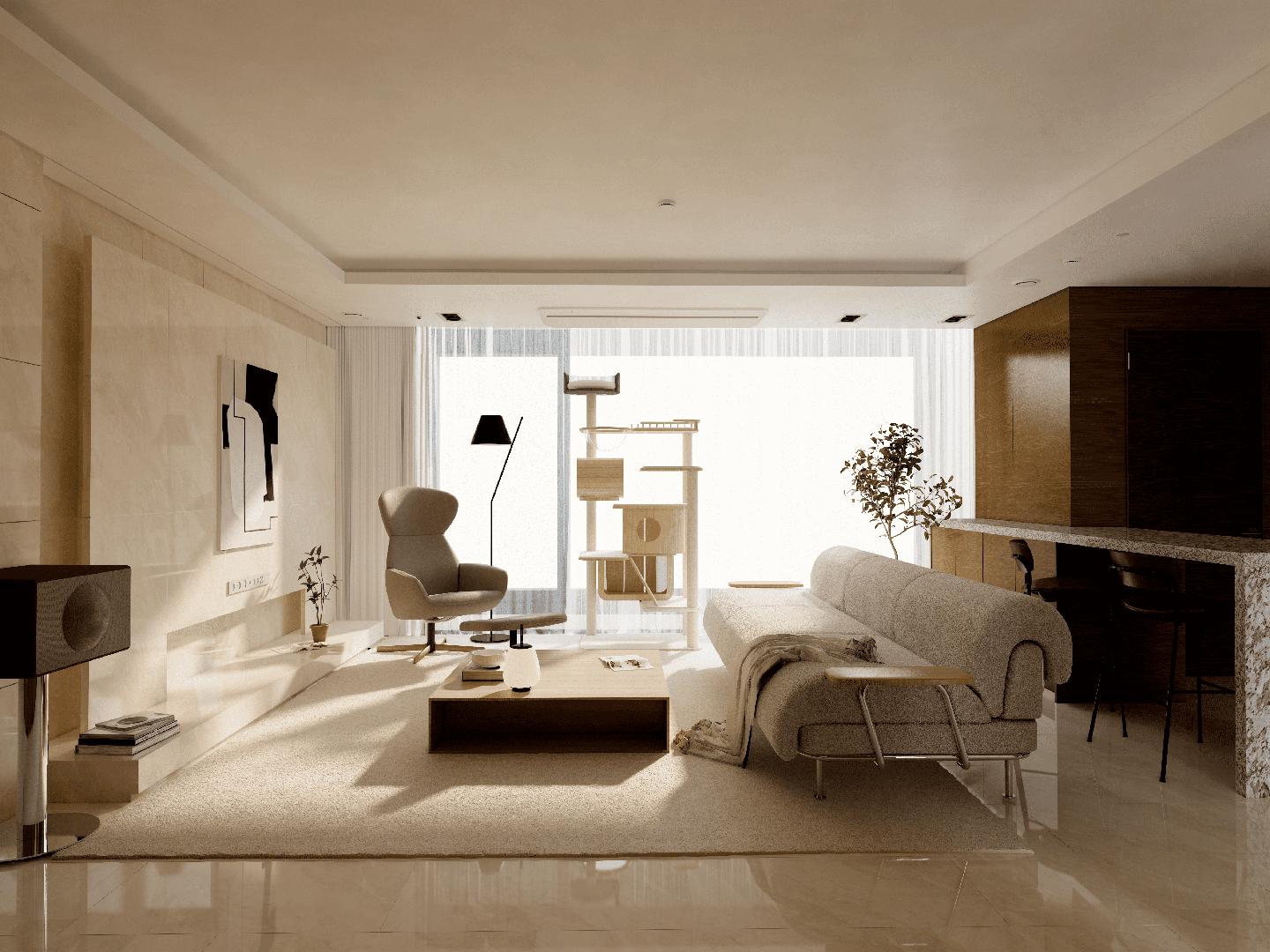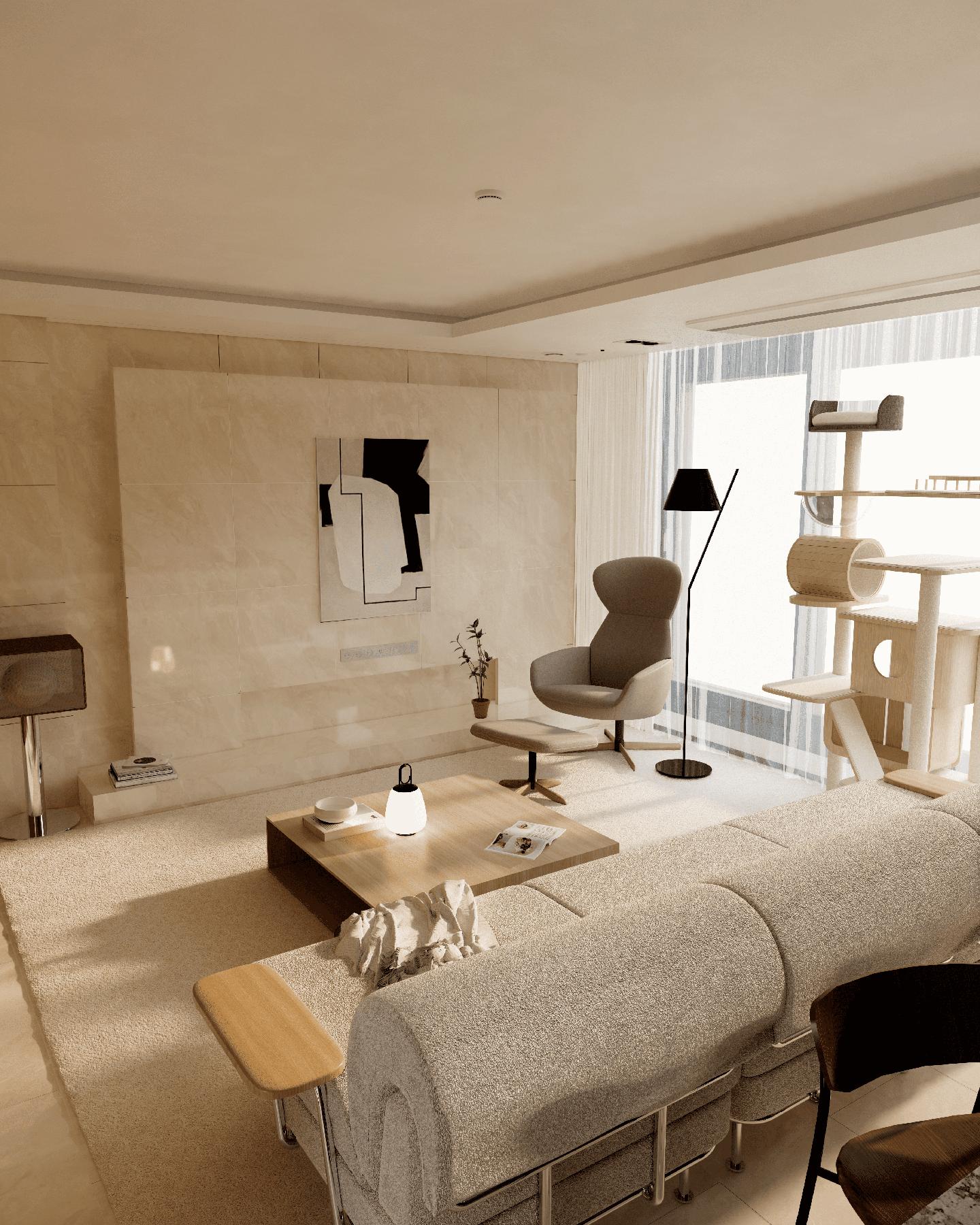 차분하신성향의고객님을위해반려묘와함께할수있는 따뜻하며 네추럴한 공간으로 스타일링 하였습니다. 반듯한 형태의 소파가 공간에 중심을 잡아주어 전체적으로 모던한 분위기를 주고 있으며, 차가운 물성의 대리석 바닥을 아이보리 색상의 펫 러그와 우드 소재의 가구들을 사용하여 부드러운 이미지를 만들어 주었습니다. 밝은 색의 오크톤의 가구들은 대리석과 대비되어 공간을 보다 따뜻하게 만들어주며, 오염 및 반려동물의 흔적에 강한 패브릭 소재를 사용하여 고객님께서 큰 신경 쓰시지 않도록 가구를 사용하실 수 있도록 하였습니다.
