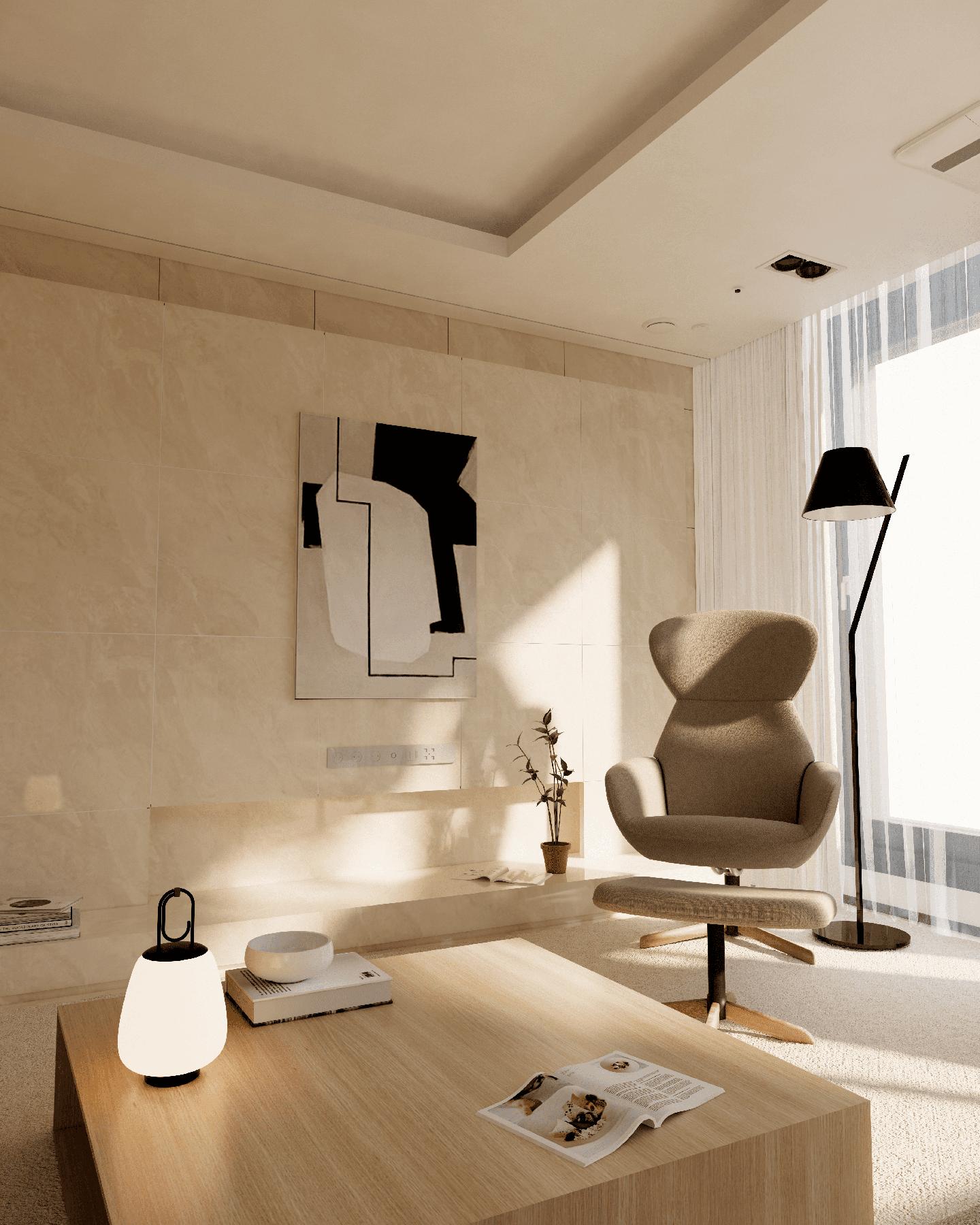 따뜻하며 고급스러운 분위기를 원하시는 고객님의 니즈에 맞춘 Boconcept의 Athena 리클라이너 체어를 배치하였습니다. 일반적인 리클라이너 체어와 달리 체어의 발 부분이 우드소재와 블랙컬러가 혼용되어 있어 독특함과 고급스러움을 함께 보여주고 있습니다. 저녁에도 조명만을 켜 두시고 차분하게 독서를 하실 수 있도록 Artemide의 La Petite 플로어 램프를 배치하였습니다. 깔끔한 블랙 색상의 라인으로 떨어지는 La Petite 플로어 램프는 휴식 공간을 다양한 조도로 공간을 다르게 느껴지게 해줄 뿐만 아니라 모던한 분위기를 한층 더 강화시켜 주는 역할을 하고 있습니다.