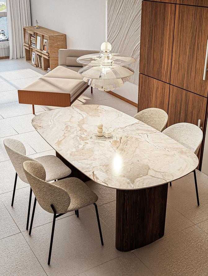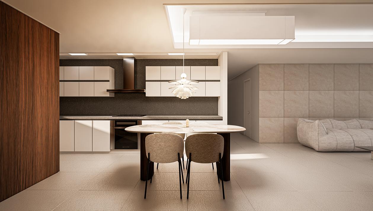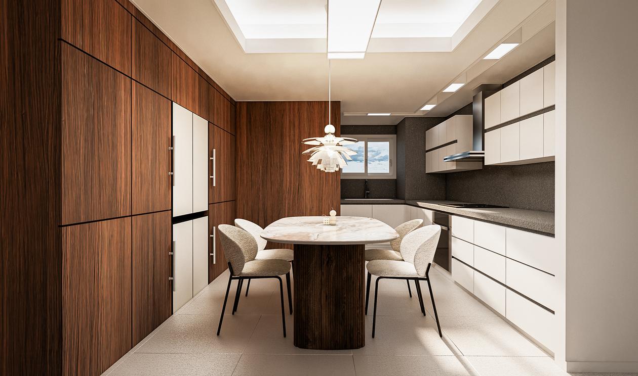 우드와 화이트의 대비—공간에 깊이를 더한 다이닝
