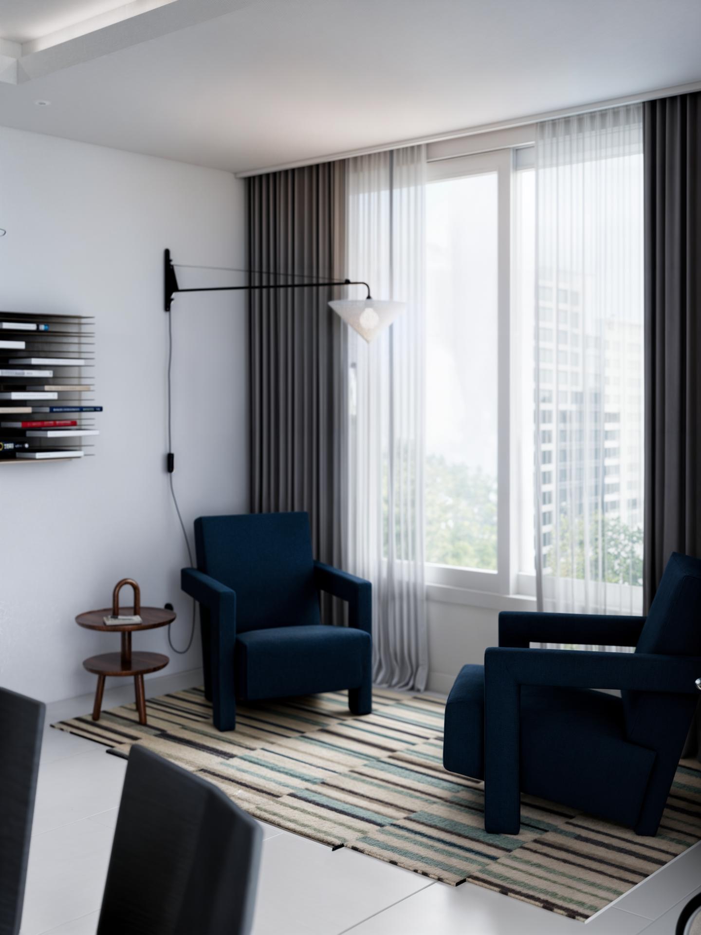 라운지 체어를 2개 추가 배치하고 테이블과 마주보게 하여 자연스럽게 대화가 흐를 수 있도록 구성하였습니다.