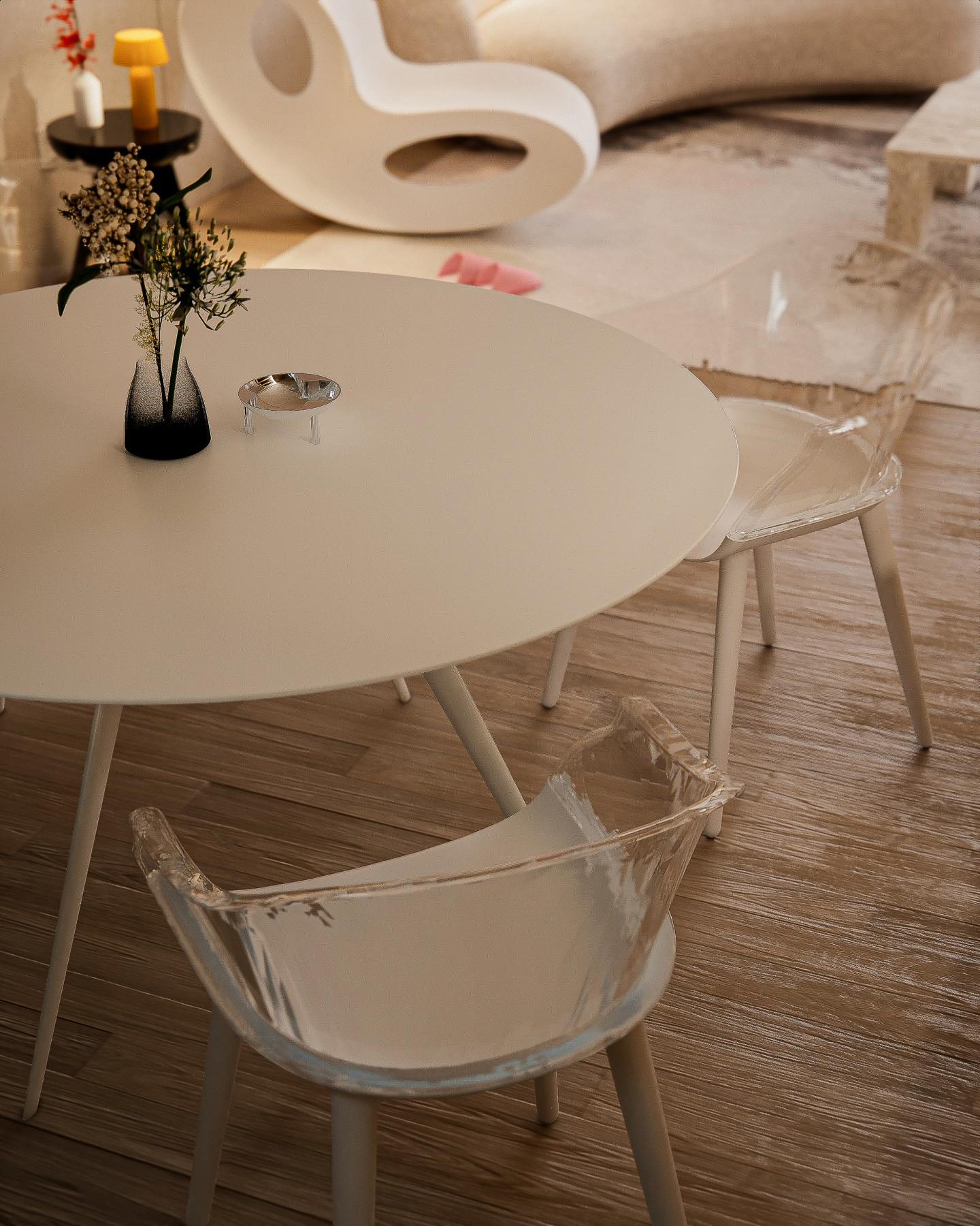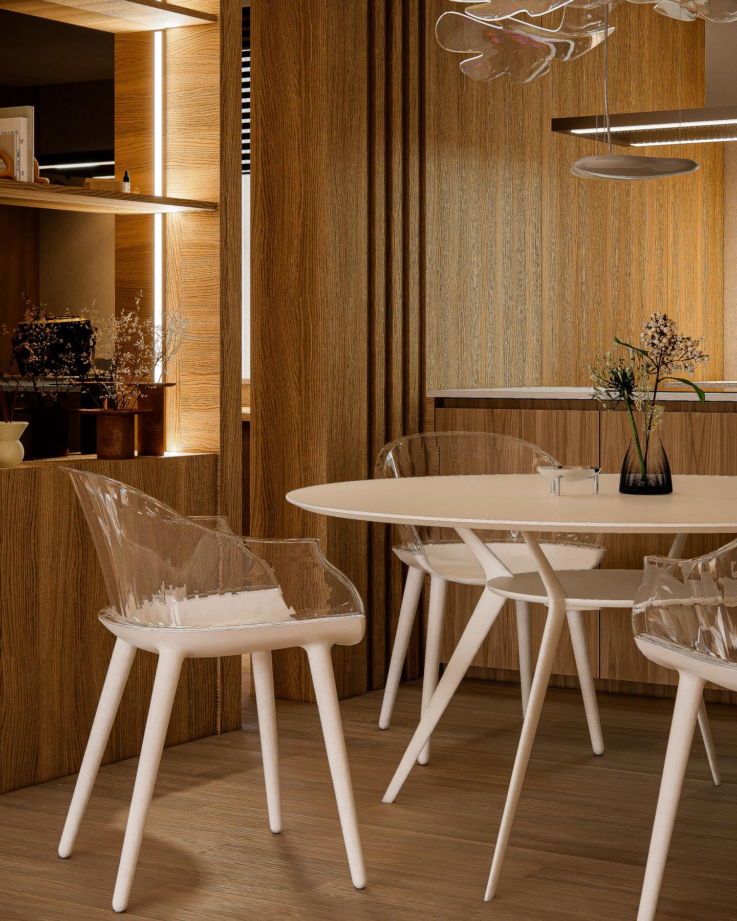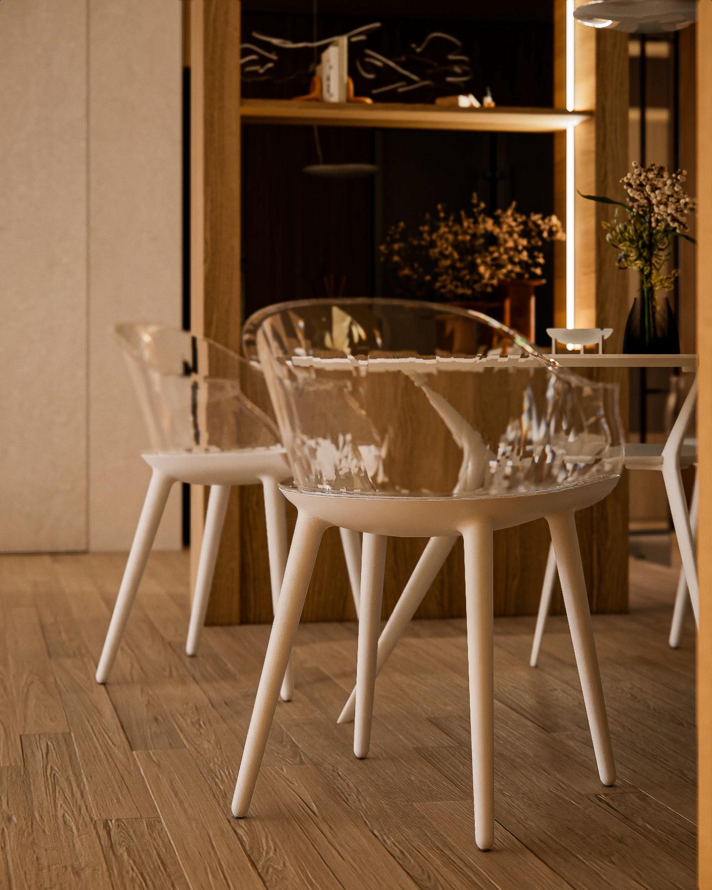 조형적인 조명과 아크릴 체어의 유니크한 조화