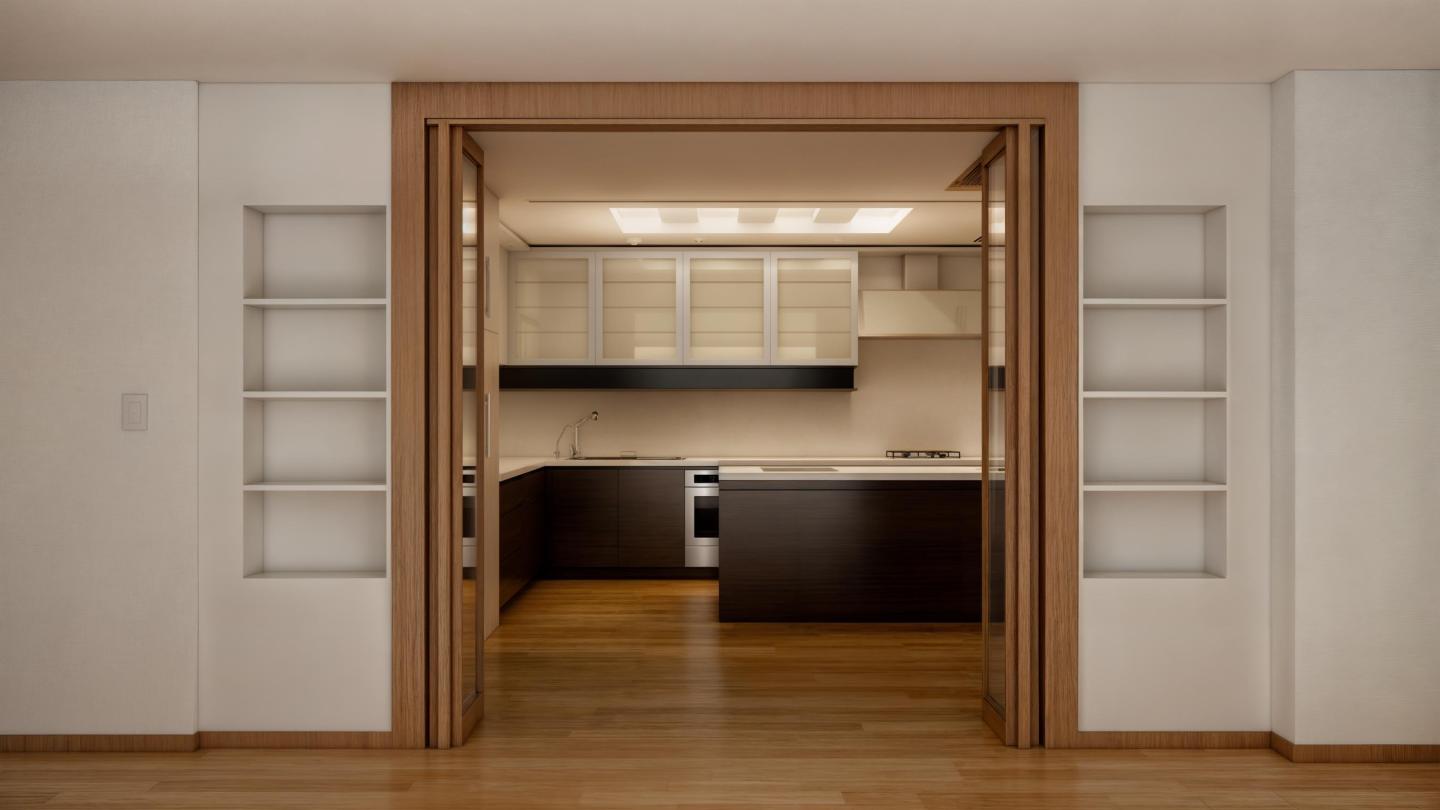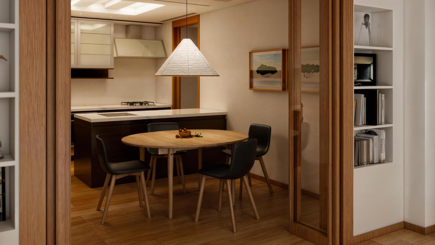 다만, 식사를 할 수 있는 공간은 다소 협소하다는 구조적 특징이 있습니다. 주방과 거실은 접이문으로 구분되어있어 필요에 따라 공간을 나누거나 오픈할 수 있습니다.
