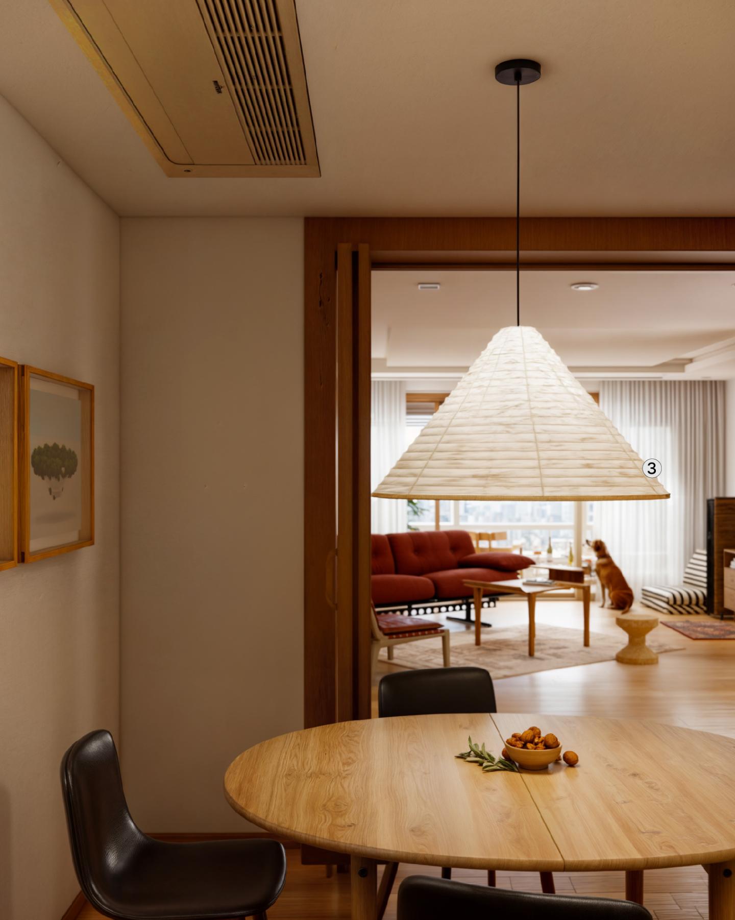 공간이 좁아 식탁 배치에 어려움을 느꼈던 부분은 확장이 가능한 테이블로 효율적인 쓰임새를 구축하고 공간의 여백을 확보해 문제를 해결했습니다. 식탁 중앙에 배치한 콘 모양의 펜던트 조명과 벽면에 아트워크는 시각적인 즐거움과 공간의 묘미를 더합니다.