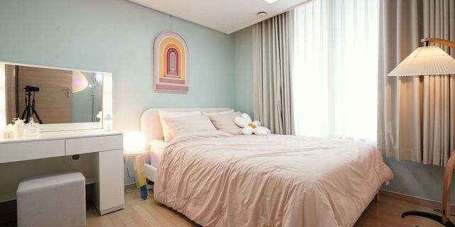 핑크색 포인트가 눈에 띄는 침실. 여기 놓인 꽃 모양의 방석, 토끼모양의 조명 등 키치한 소품은 이곳을 마치 원더랜드 속 한 공간처럼 보이게 만듭니다. 프랜치 스타일 침실을 조명 및 오브제로 키덜트적인 요소를 더해 동화속에 들어온 것 같은 꿈같은 공간으로 풀어냈습니다.