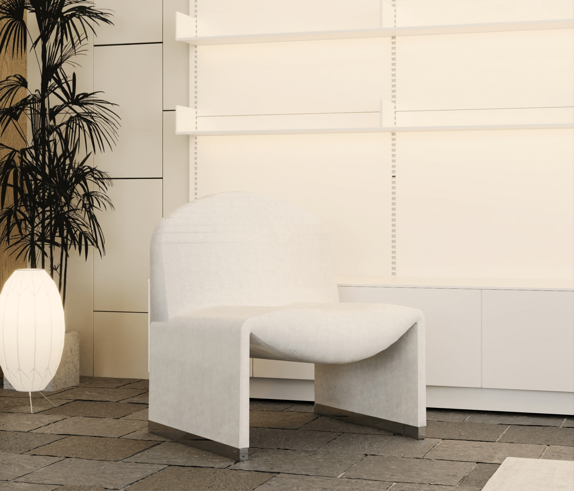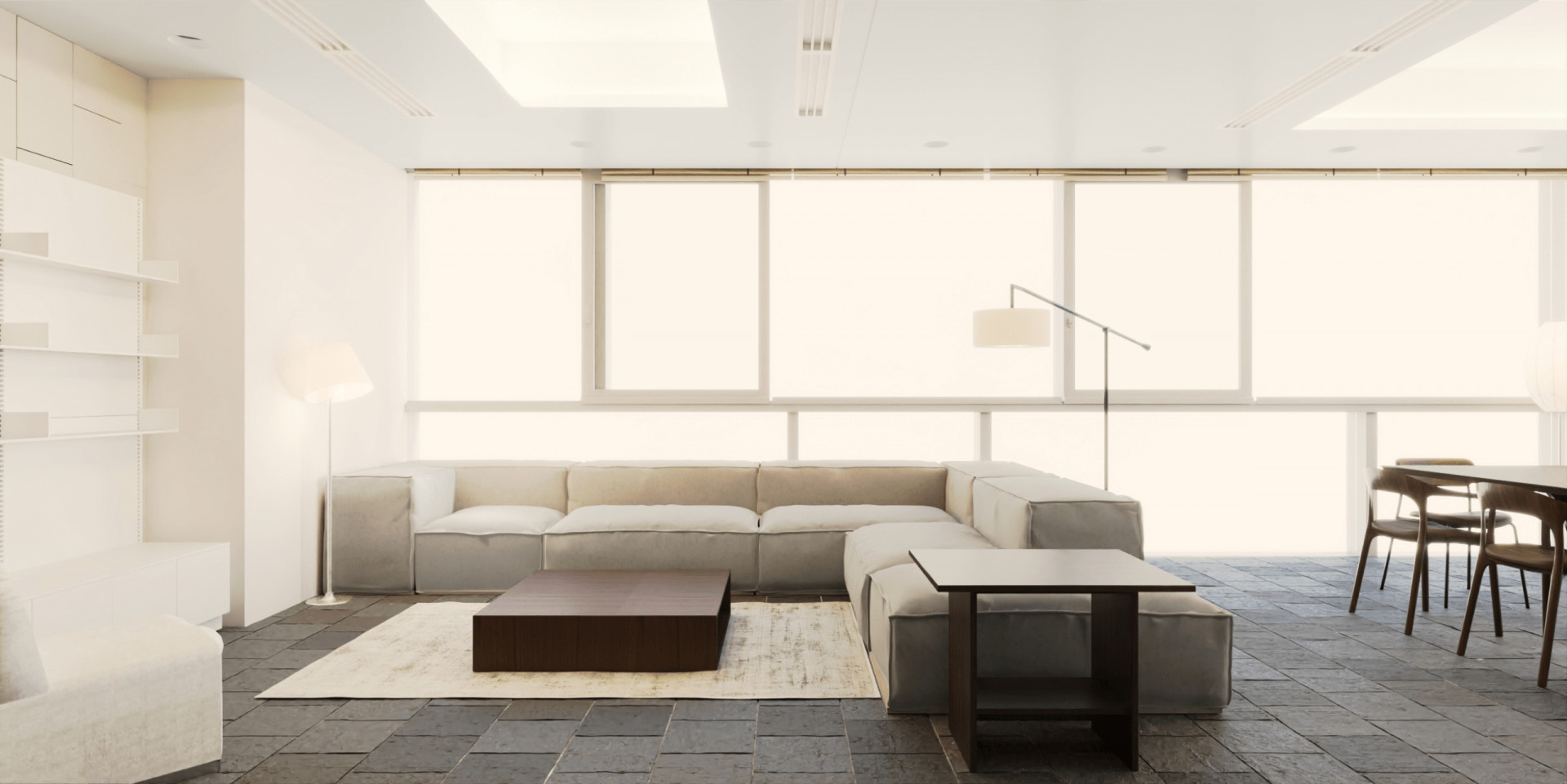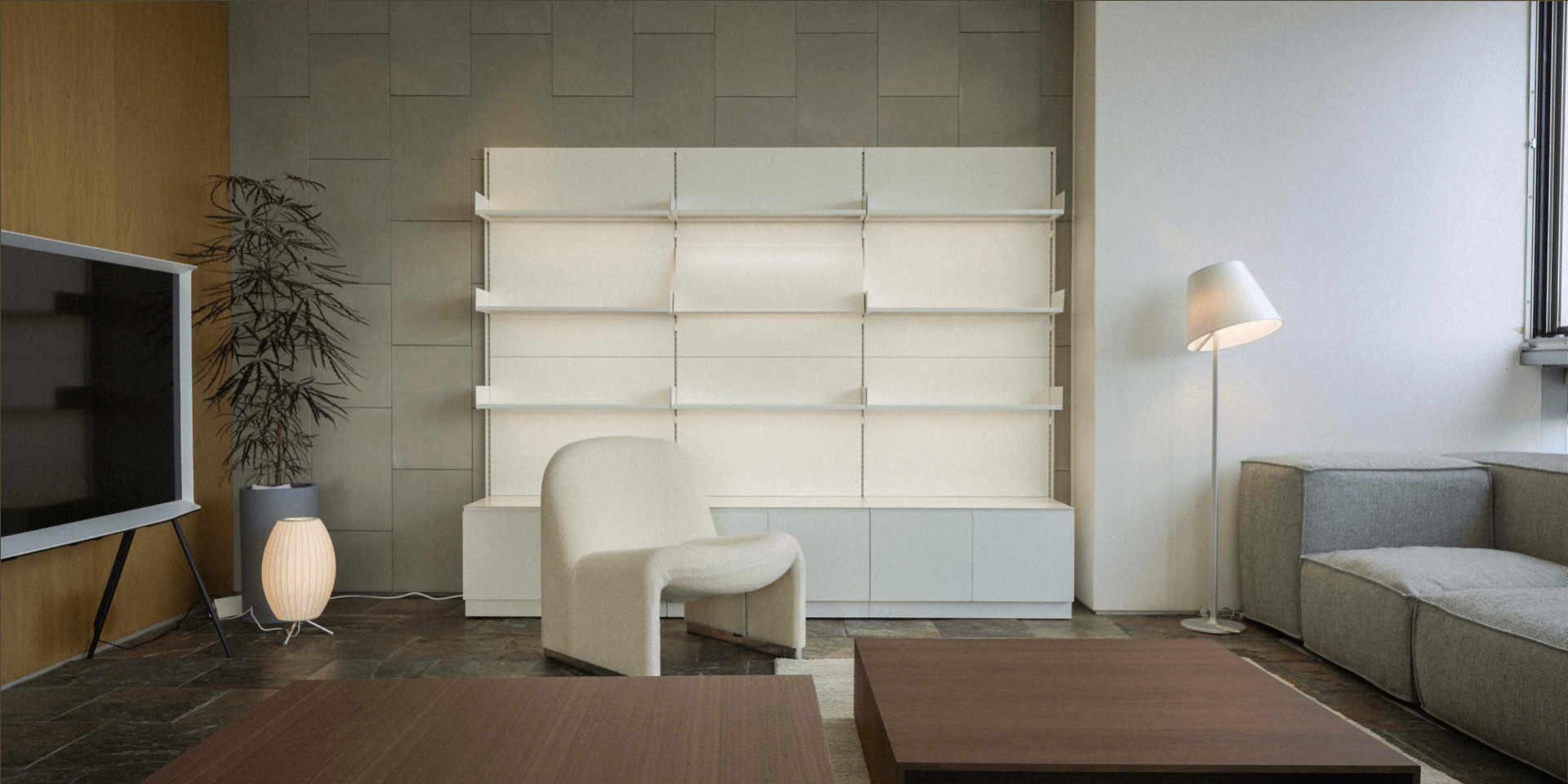 거실 공간은 손님을 맞이하는 공간으로 고급스럽고 세련된 분위기로 스타일링 하고자 하였습니다. 사각 형태의 소파와 소파테이블을 배치하여 정적이고 포멀한 느낌을 주고자 하였고 소파테이블의 경우 짙은 월넛 컬러를 선택하여 공간의 무게감을 주고자 하였습니다.