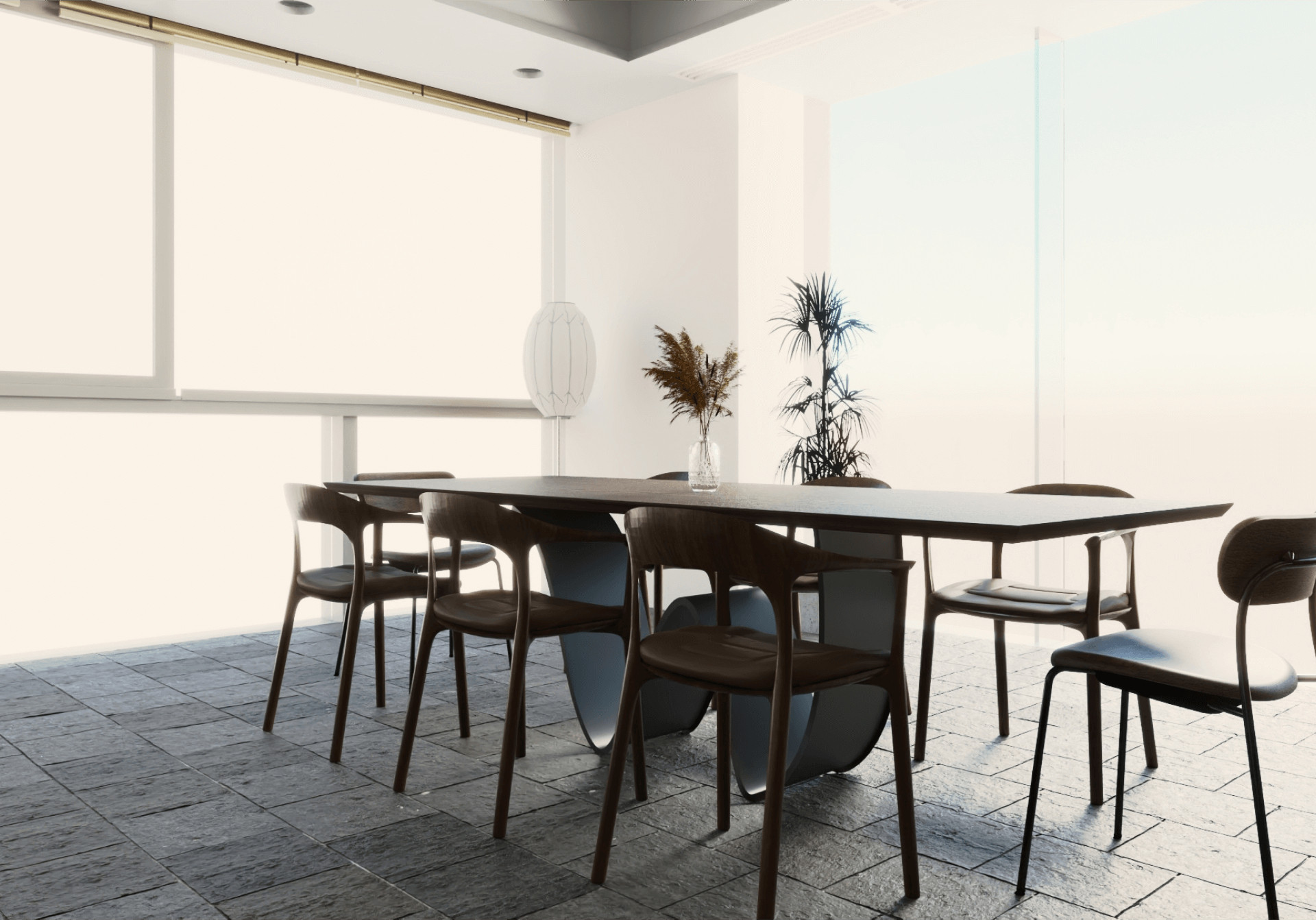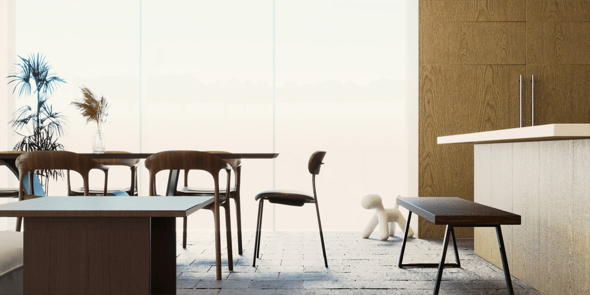 다이닝 공간은 네츄럴한 오리엔탈 스타일의 프리미엄 공간으로 디자인하였습니다. 전체적으로 우드톤이 돋보이는 공간으로 메인 소재는 무게감 있는 오크 우드, 메탈 소재를 선택하여 공간에 무게감을 주면서 동시에 현대적이면서도 동양적인 미가 믹스된 스타일로 디자인하였습니다.