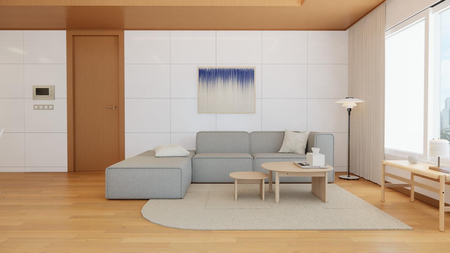내추럴한 요소와 블루 페인팅의 조화로운 거실