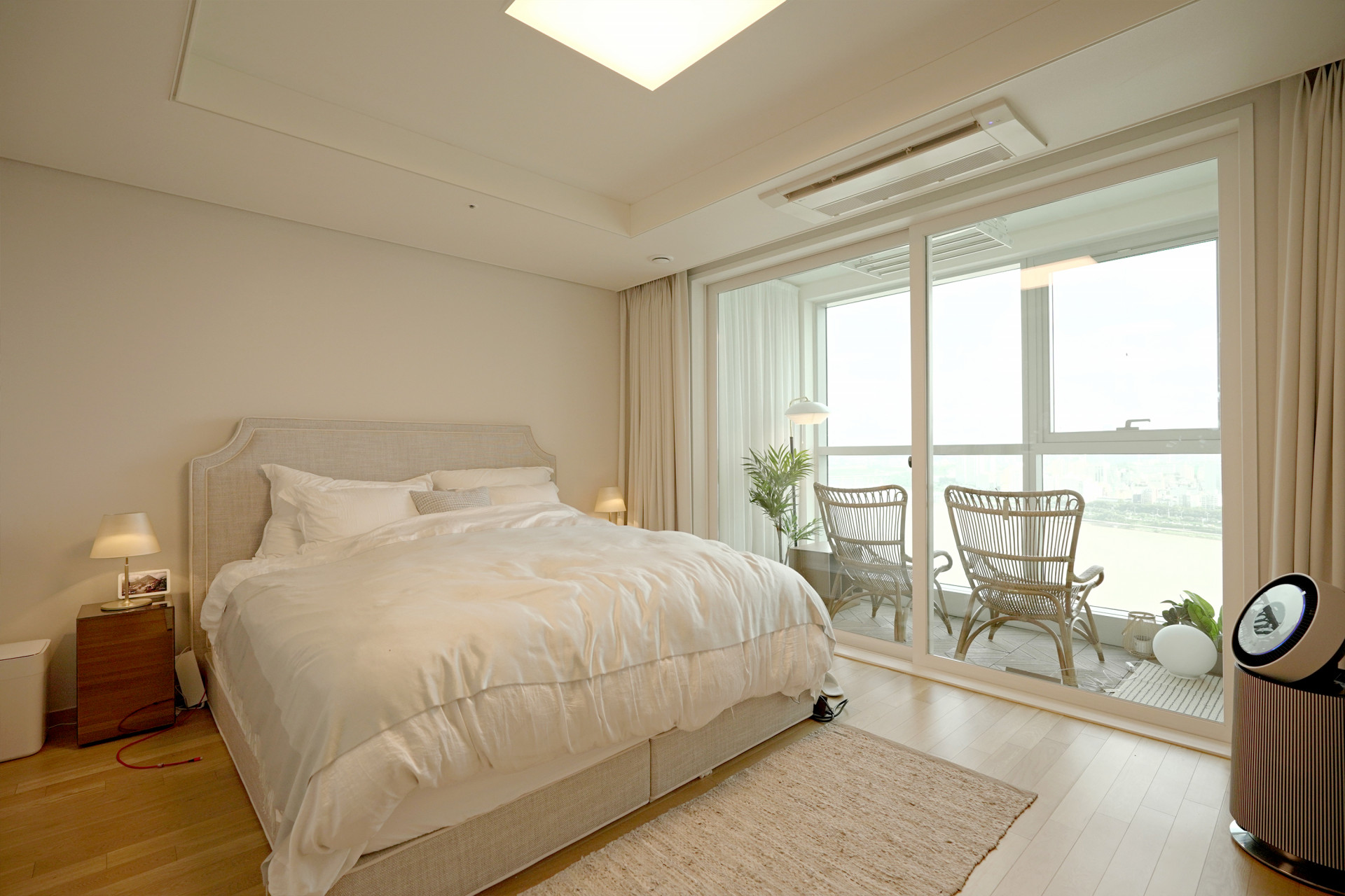 공간의 컨셉을 정하기 위해 상담을 진행하면서 대리석의 화이트 샌드 컬러감과 한강의 파란 컬러감이 마치 사막 속 오아시스와 같은 느낌이 들었습니다. 최종적으로 오아시스를 품은 우아한 사막이라는 컨셉으로 결정을 해서 스타일링을 진행하였습니다.