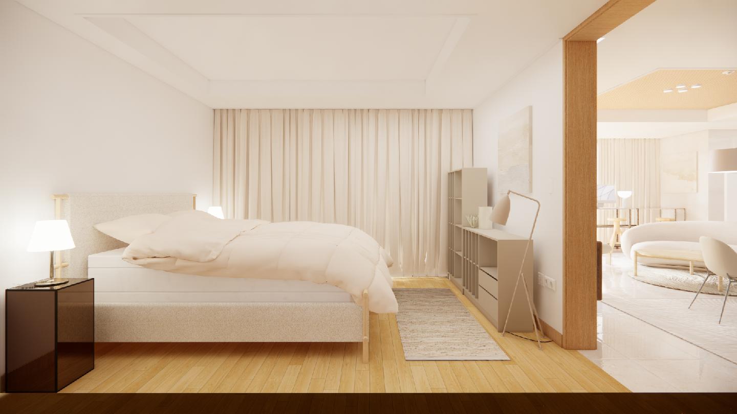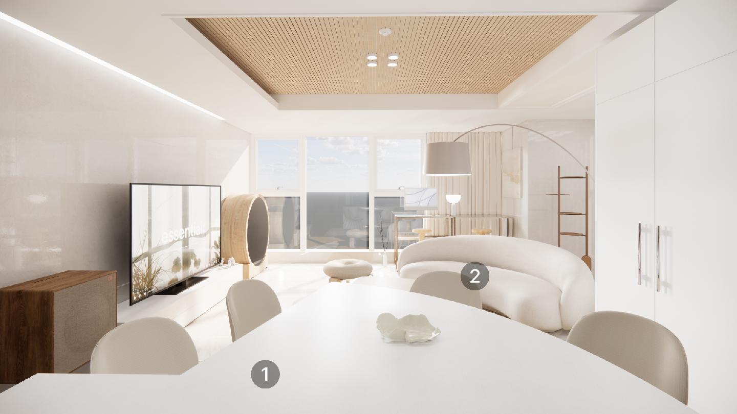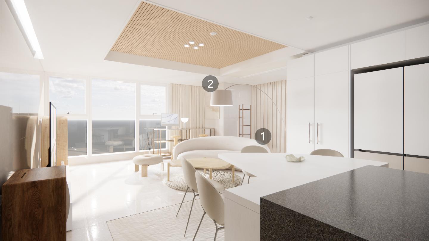 먼저 거실 공간은 휴식을 원하셨던 고객님을 위해 벽의 대리석과 같은 베이지 톤의 가구들을 활용해 사막이라는 컨셉을 살린 아늑하고 따뜻한 거실로 디자인 했어요. 특히 전용 면적이 다소 작아 자칫 가구를 잘못 셀렉하게 되면 뷰를 가리고 답답하고 좁아보일 수 있어 일반적인 직각 형태의 소파가 아니라, 우아한 곡선을 가진 소파를 활용해 공간에 더 트여보이는 시야감을 주었습니다.