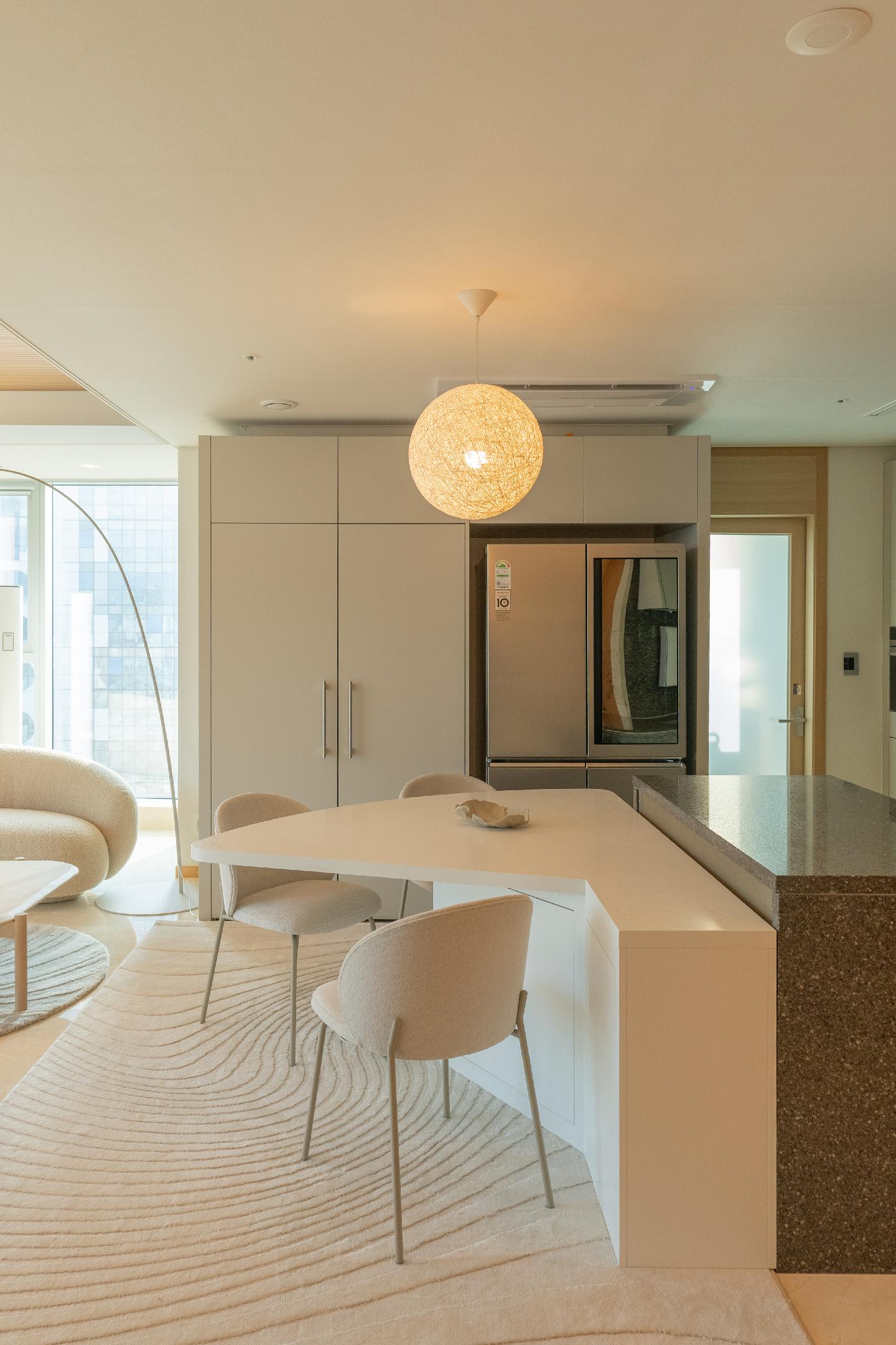 그래서 부채꼴 모양의 테이블을 제안드려 공간의 효율성과, 개방감 있는 시야 모두를 챙기게 되었습니다. 또한 거실과 이어진 만큼 러그를 활용해 심리적으로 공간 분리까지 될 수 있도록 하였습니다.