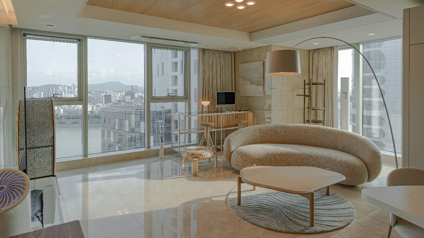 공간의 컨셉을 정하기 위해 상담을 진행하면서 대리석의 화이트 샌드 컬러감과 한강의 파란 컬러감이 마치 사막 속 오아시스와 같은 느낌이 들었습니다. 최종적으로 오아시스를 품은 우아한 사막이라는 컨셉으로 결정을 해서 스타일링을 진행하였습니다.