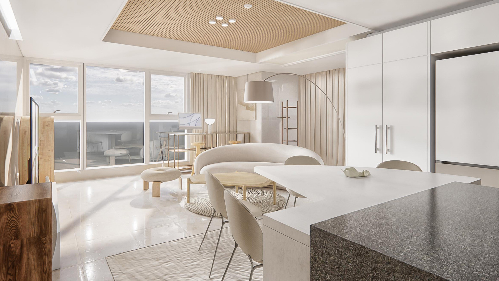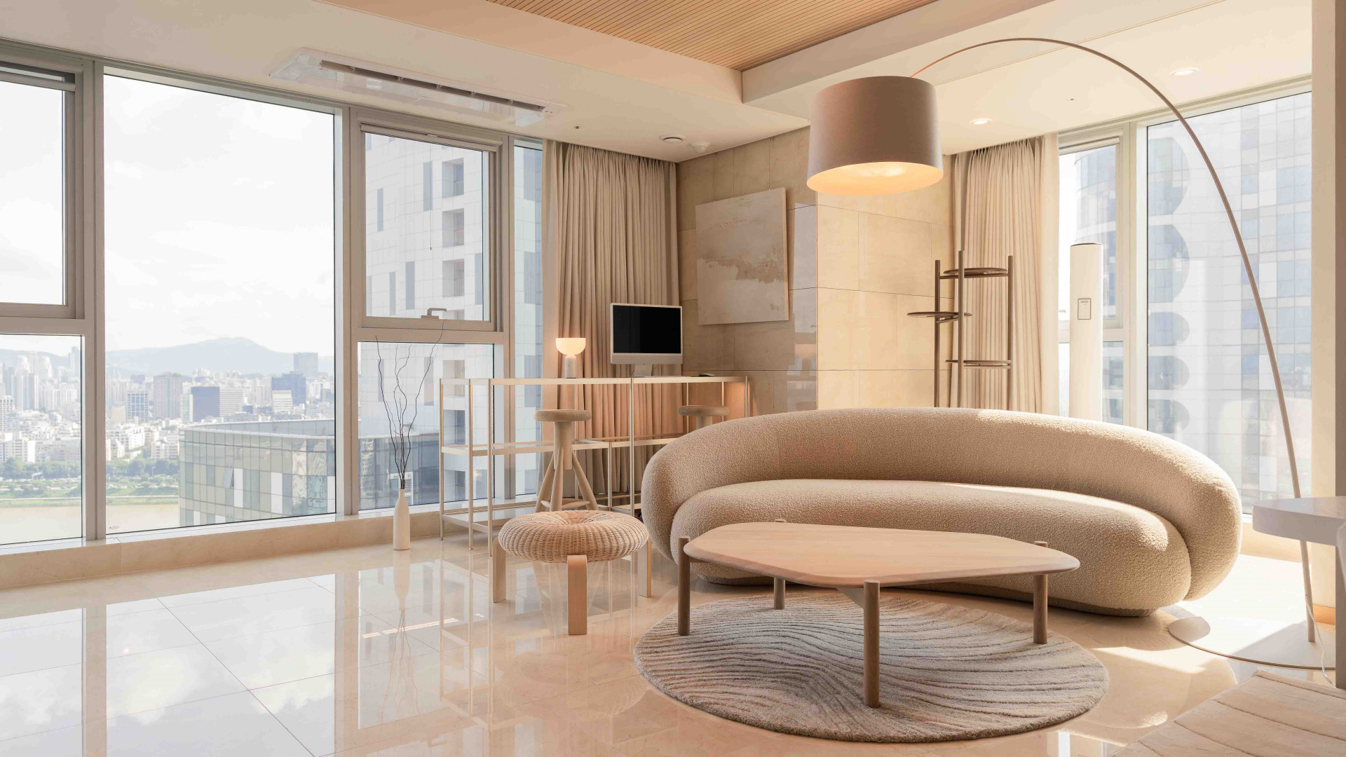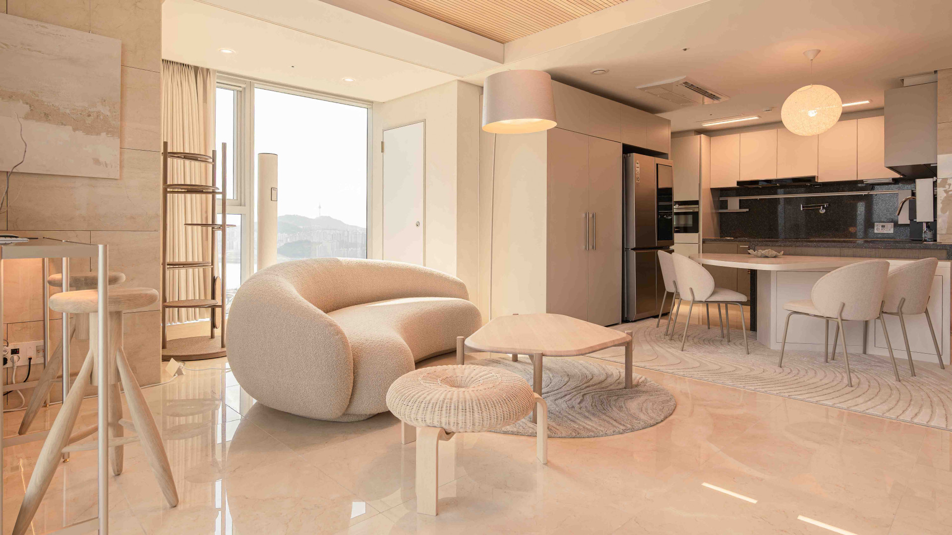 고객님은 보기만 해도 고급스러움이 느껴지는 거실을 휴식 그리고 비즈니스에 집중할 수 있는 공간으로 활용하길 원하셨습니다. 대리석의 샌드 톤을 고려한 ‘타키니'의 줄렙 소파는 패브릭 소재와 유려한 곡선의 쉐입으로 거실을 더욱 아늑하게 만듭니다. 고급스러운 사막의 분위기는 모래 언덕을 연상케 하는 줄렙 소파의 라운드 쉐입에 이어 불규칙한 곡선 텍스쳐가 나타나는 ‘보컨셉'의 Furrow rug을 통해 완성되었습니다.