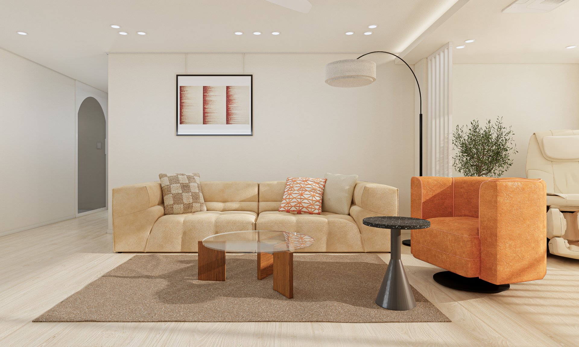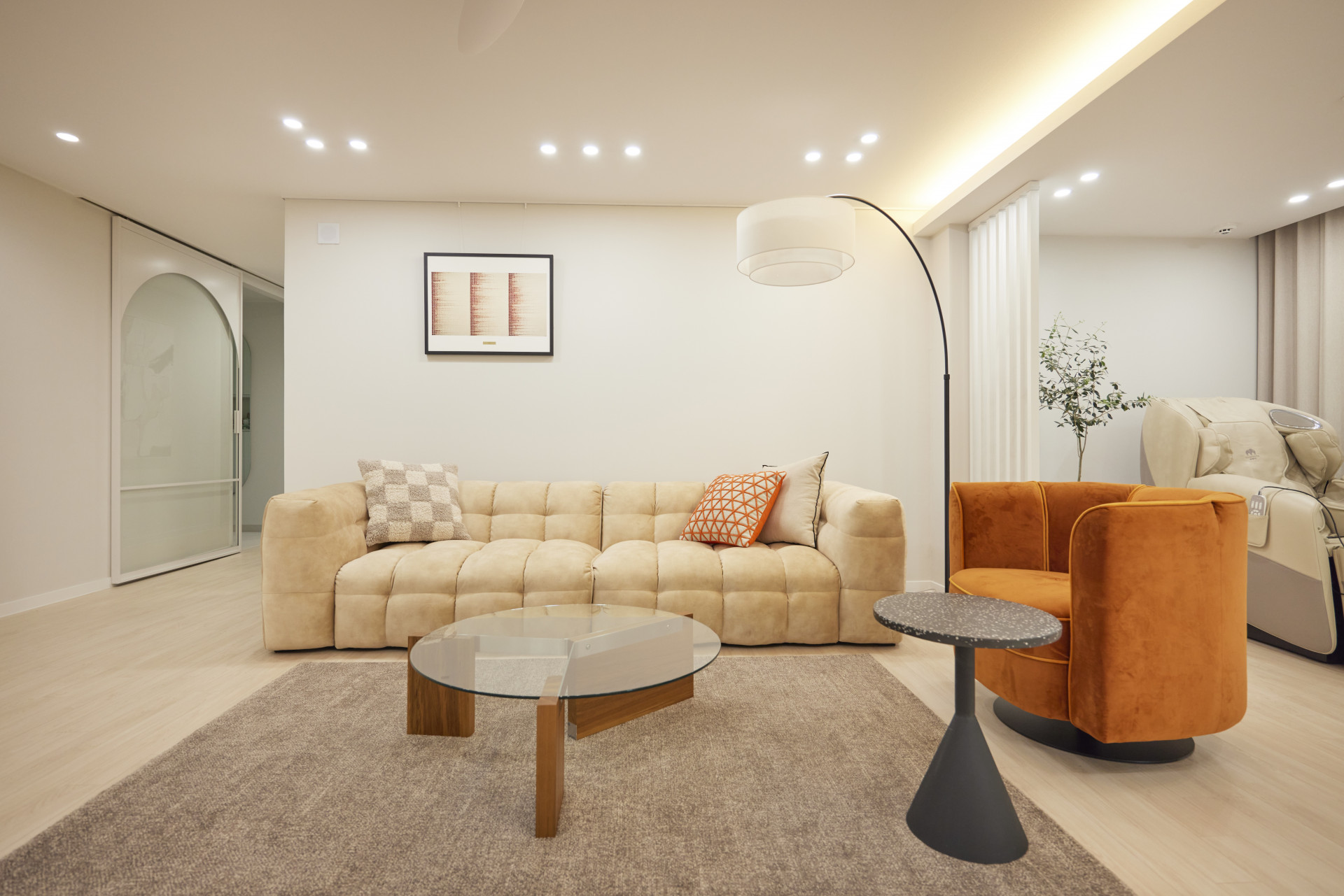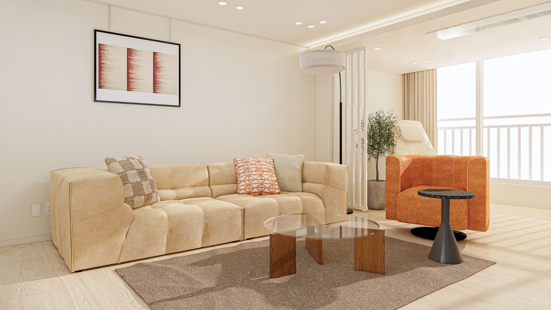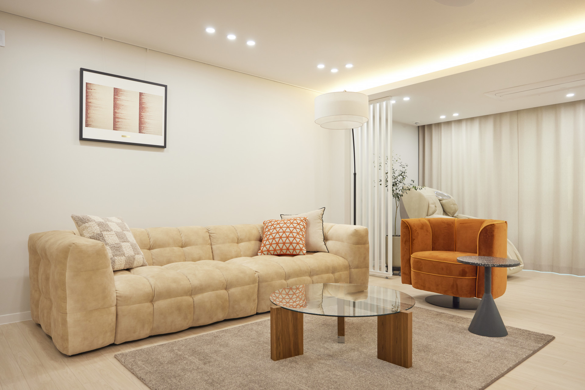 거실 인테리어는 전체적으로 따뜻한 색감의 아이보리, 브라운 컬러를 사용하여 따뜻하고 세련된 공간이면서, 쨍한 오렌지 색상과 블랙&월넛의 가구를 활용하였습니다. 공간에 환기를 시켜주면서 어두운 컬러로 무게감을 잡아주어 우아함과 절제됨이 함께 느껴집니다. 독창적인 디자인과 안락한 착석감의 볼륨감이 강조된 소파와 복고풍 감성이 느껴지는 라운지 체어를 사용하여 화려함이 느껴집니다. 더불어 깔끔한 원형의 테이블을 셀렉하여 모던미의 현대적인 감각도 더하였습니다. 더불어 무늬가 없는 마감재를 사용하고, 활장 장스탠드를 조합하여 직선과 비정형의 곡선 형태가 공존하여 심심하지 않은 조화로움이 느껴집니다. 커튼은 베이지 색상으로, 아늑함이 느껴지도록 하였습니다.