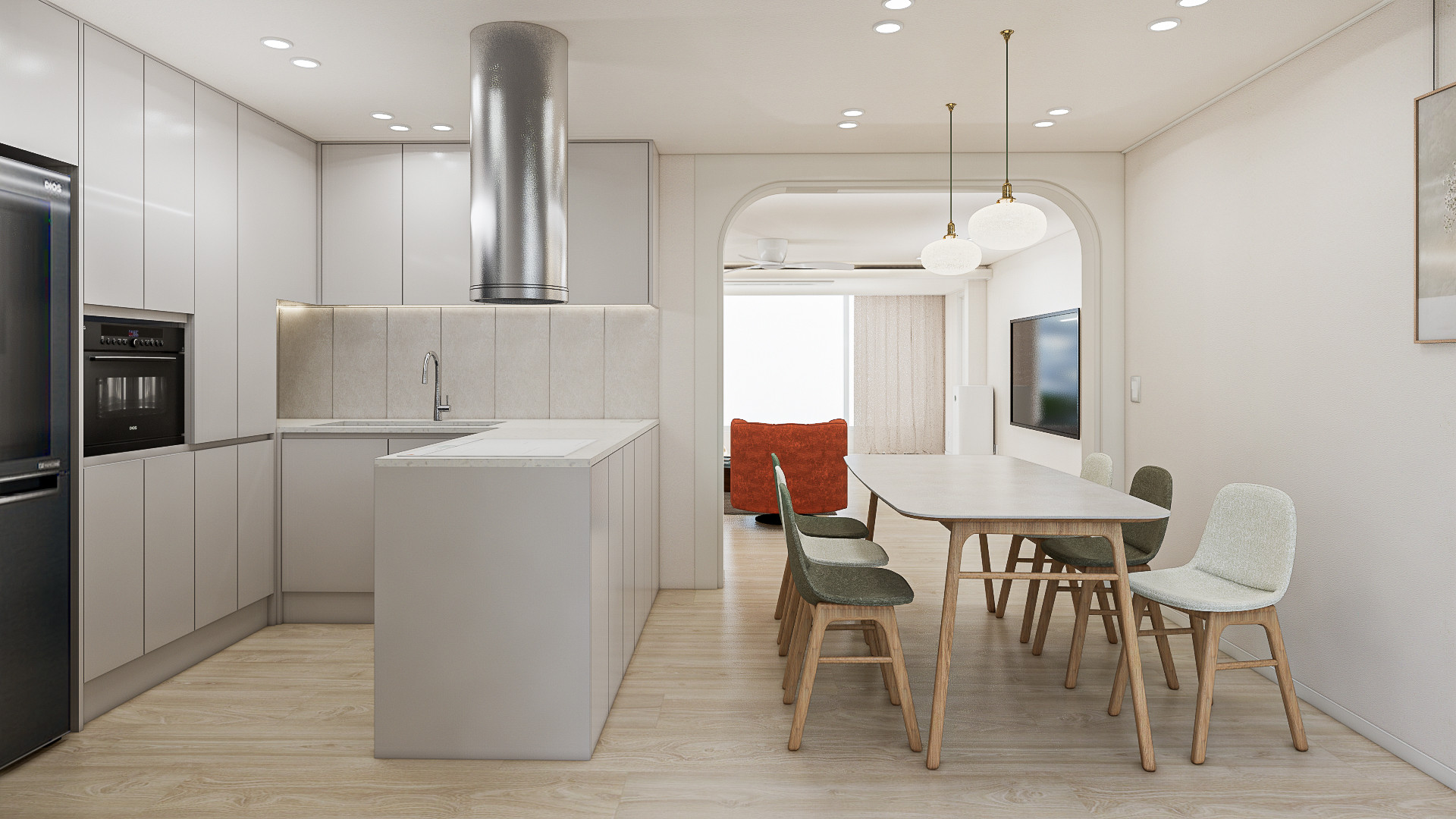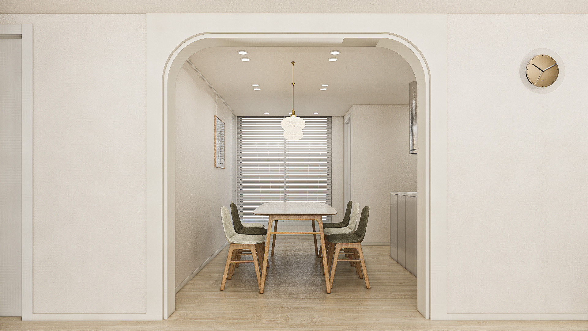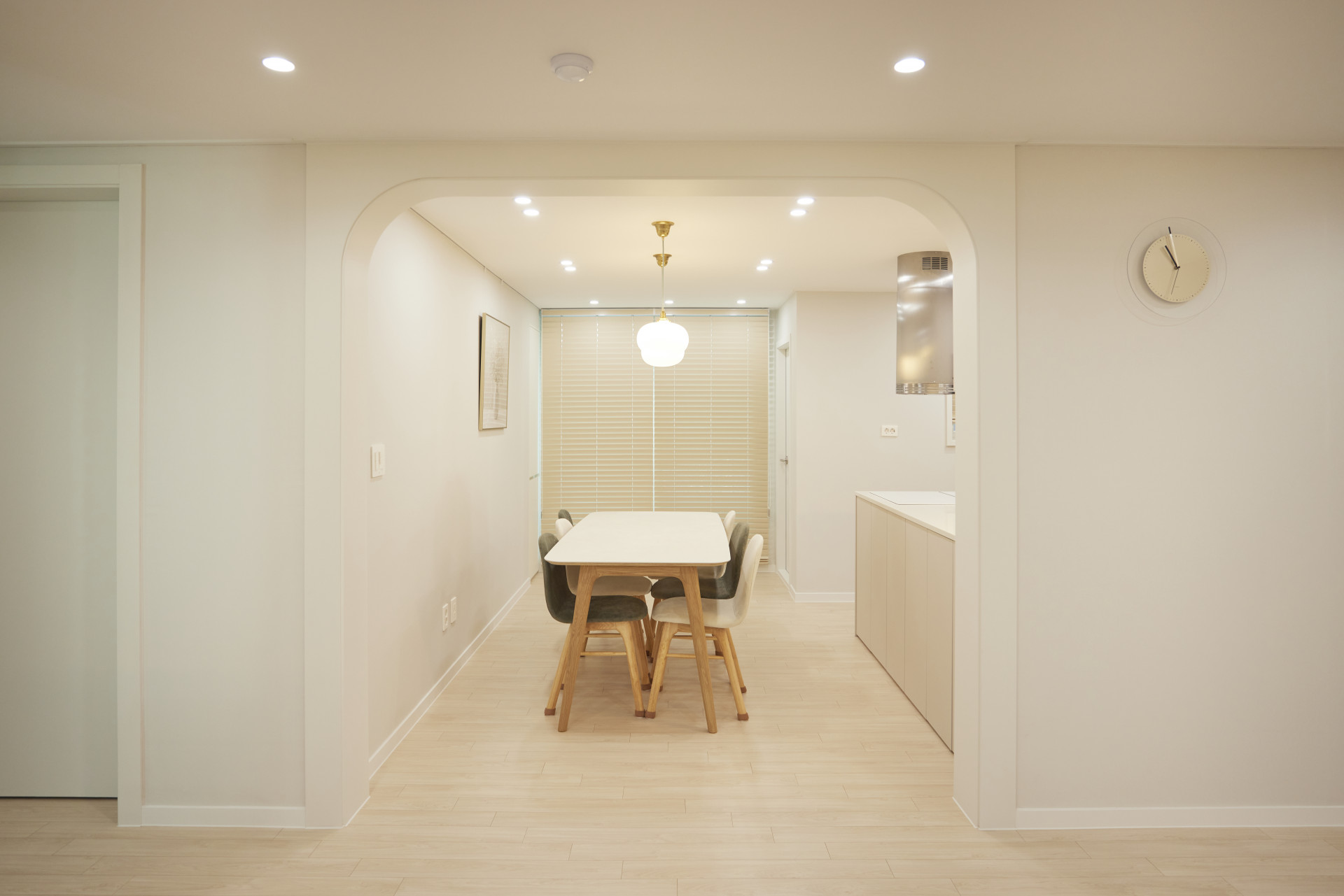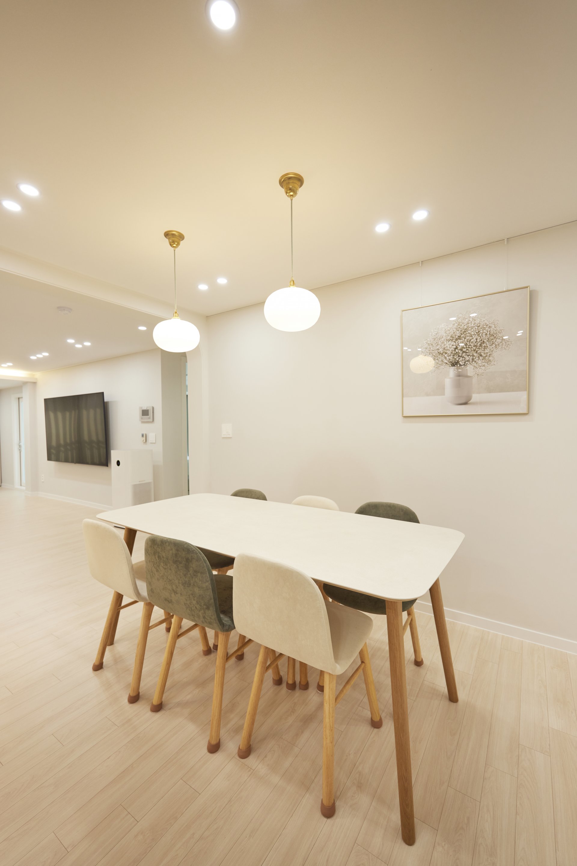 다이닝 공간의 전체적인 색감은 자연스럽고 편안한 무드가 느껴지는 베이지와 적당하게 무게감 있으며 세련된 무드를 더해주는 그린색으로 조합하여 안정적인 분위기를 연출하였습니다. 더불어 유광 골드소재가 포인트로 가미된 팬던트를 함께 매치하여 동시에 화려함이 느껴집니다. 선이 강조된 견고한 우드 소재의 다릿발이 특징인 식탁과 의자를 사용하였으며, 그린과 아이보리컬러의 기능성 패브릭의 의자를 교차로 사용하여 재밌으면서 따뜻한 무드가 연출됩니다.