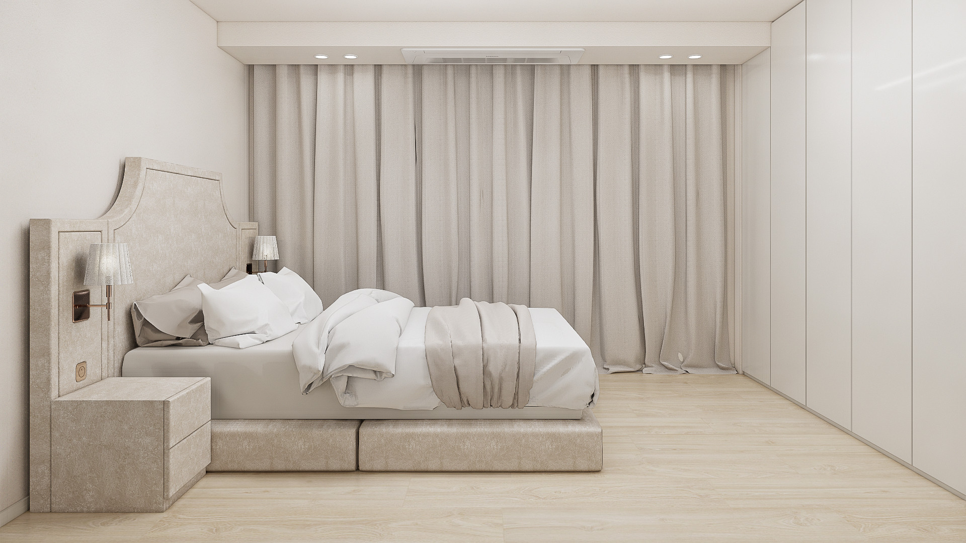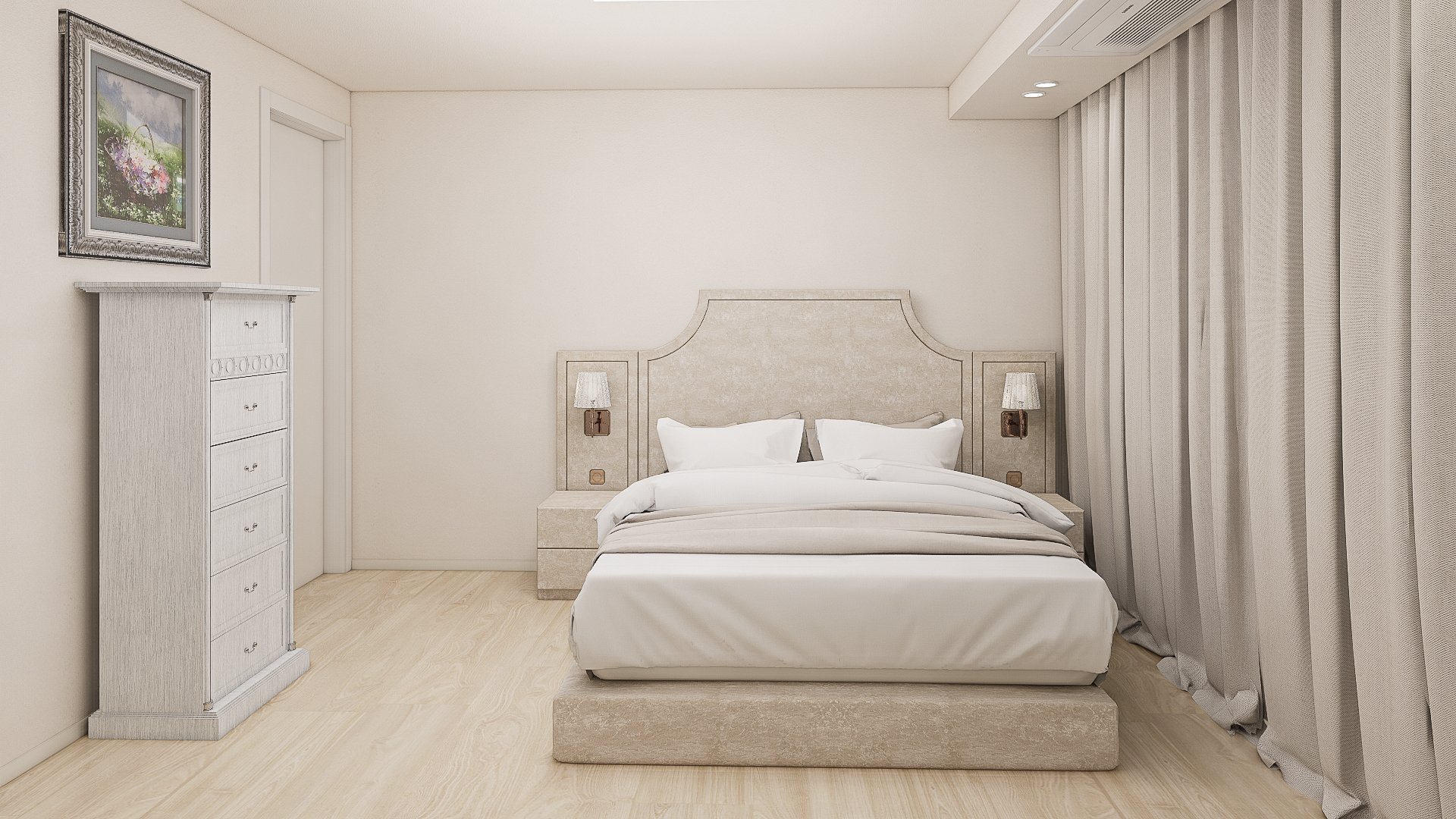 고객님께서 소지하고 계시는 서랍장과 액자는 프렌치 스타일의 무드가 느껴집니다. 기존 가구에서 느껴지는 스타일을 안방에 적용하였습니다. 가구를 다시 활용하면서 꼭 필요한 가구만 무드에 맞게 구매하실 수 있도록 하였습니다. 침실의 가장 큰 면적을 차지할 침대는 호텔 스타일의 패브릭 소재 침대로 선택하여 침대 하나만으로도 고급스럽고 세련된 분위기가 느껴질 수 있도록 하였습니다. 커튼은 99.9%의 암막률이지만 밝은 아이보리 색상으로 선택하여 공간의 무드는 살리면서 숙면에 방해가 되지 않도록 하였습니다.