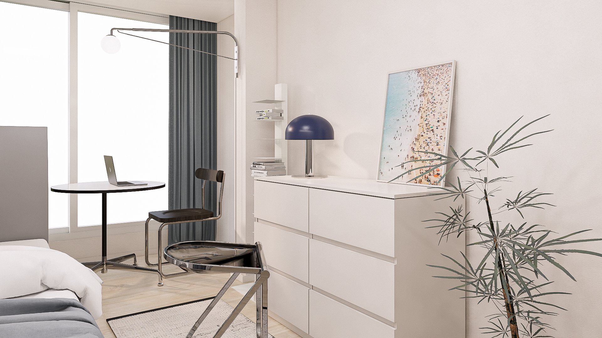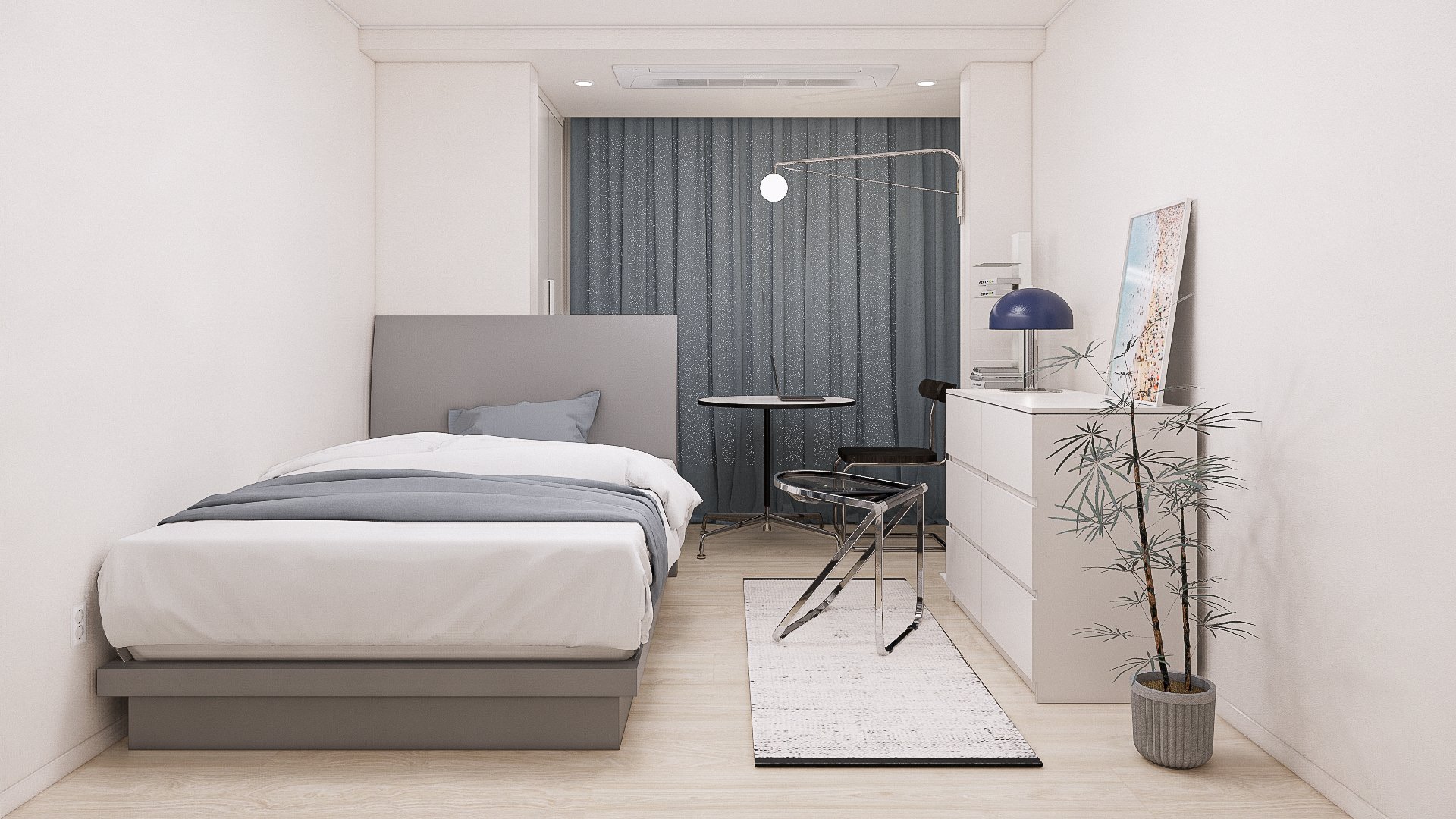 전체적으로 흰색과 그레이의 모노톤의 컬러를 적용한 가구로 셀렉하고, 포인트 컬러로 파란색의 커튼과 오브제를 활용하였습니다. 모노톤의 배경색에 블루컬러가 돋보이는 스테인리스, 유리, 플라스틱 등 광택이 나는 다양한 소재로 이루어진 가구와 소품을 조화롭게 배치하여 심플함과 모던함이 느껴지도록 하였습니다.