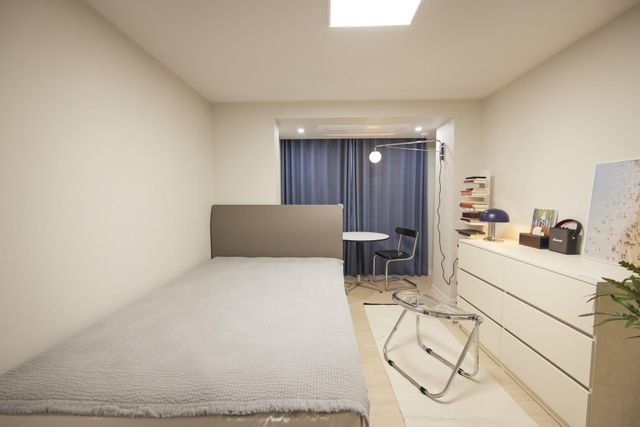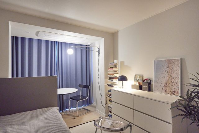 전체적으로 흰색과 그레이의 모노톤의 컬러를 적용한 가구로 셀렉하고, 포인트 컬러로 파란색의 커튼과 오브제를 활용하였습니다. 모노톤의 배경색에 블루컬러가 돋보이는 스테인리스, 유리, 플라스틱 등 광택이 나는 다양한 소재로 이루어진 가구와 소품을 조화롭게 배치하여 심플함과 모던함이 느껴지도록 하였습니다.