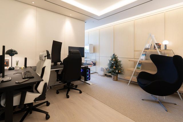 작업공간인 서재 인테리어는 전체적인 스타일링 분위기와는 다른 느낌의 공간을 원하셨습니다. 지극히 사적인 공간으로 존재하길 원하셨어요. 우선 기존에 가지고 계시던 책상을 활용하여 전체적인 가구 스타일링을 진행해드렸습니다. 의자가 서로 등지게 배치하여 업무에 오롯이 집중할 수 있는 공간을 그렸습니다.