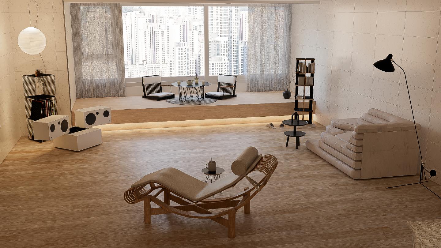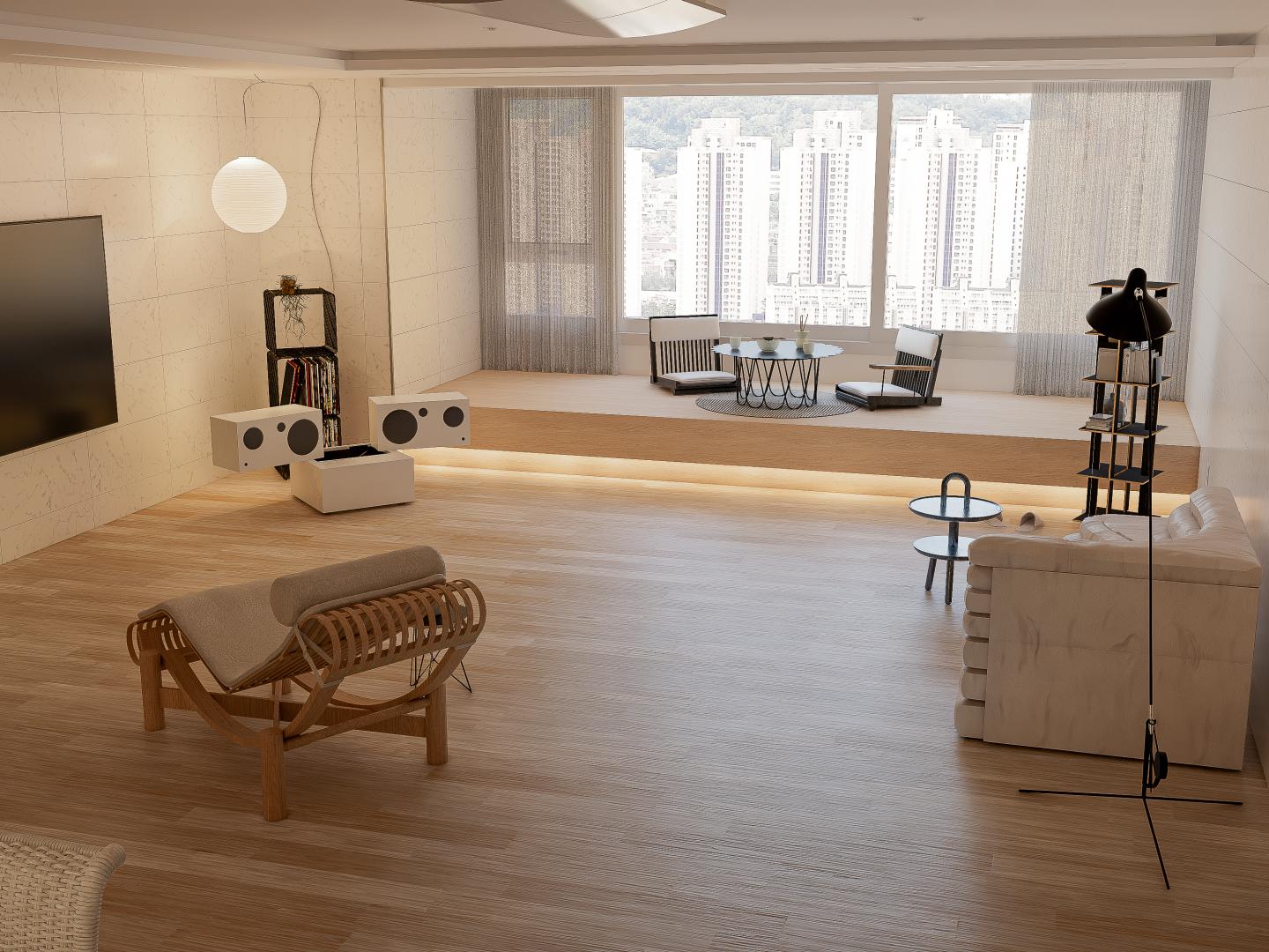 209 타입의 넓은 거실에 단을 올려 창밖을 바라보며 다도를 즐길 수 있는 공간을 제안해 드렸습니다.