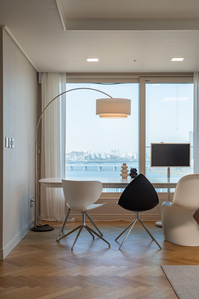 다이닝 테이블이 배치된 거실 2는 창 너머의 풍경을 최대한 만끽하며 다양한 활동이 가능하도록 구성했습니다. 창가쪽에 다이닝 테이블을 가로로 배치해 가족구성원 모두가 창가를 바라보고 앉을 수 있도록 했으며 다이닝 체어의 구성은 가족 구성원의 개성을 표현하고 아트워크 적인 효과를 주고자 세가지 서로 다른 디자인의 체어를 배치했습니다. 창가쪽에 플로어 스탠드를 배치해 팬던트 조명으로 사용할 수 있게 했고 이동식 티비 제품을 구비하여 다양한 환경에서 사용이 가능하게 했습니다.
