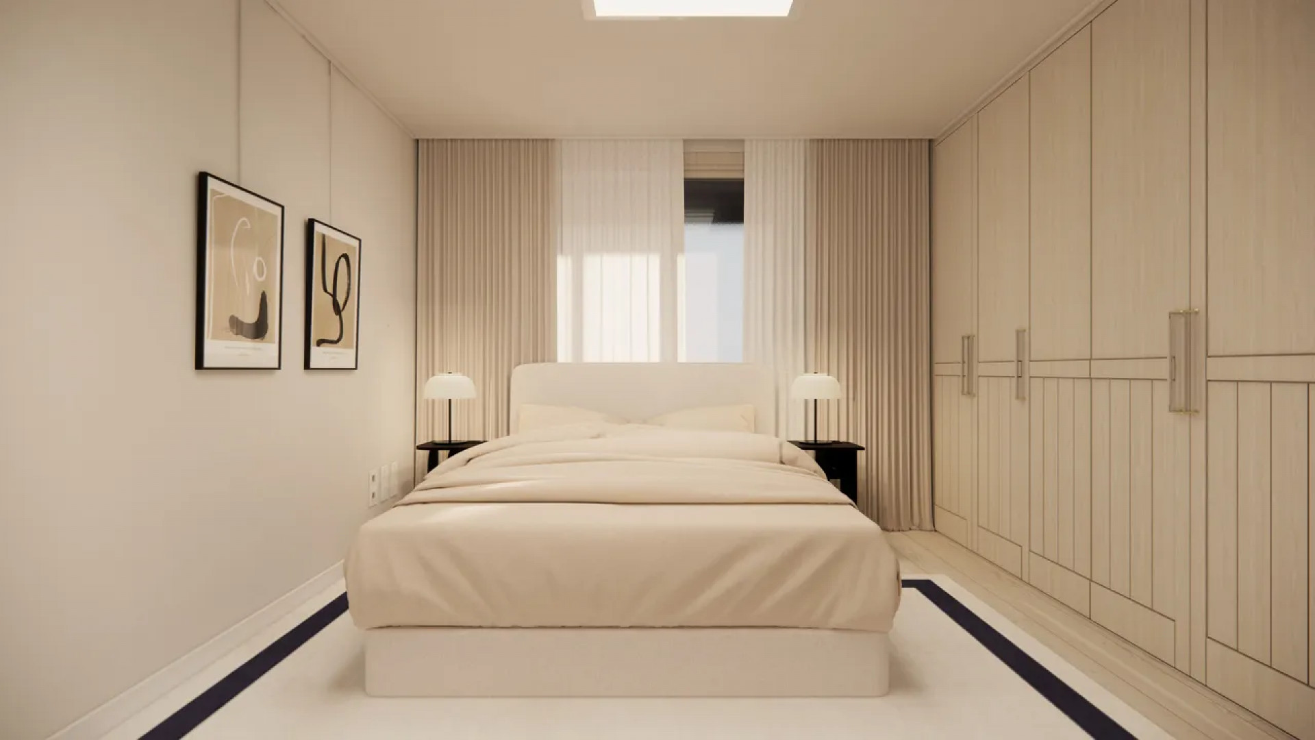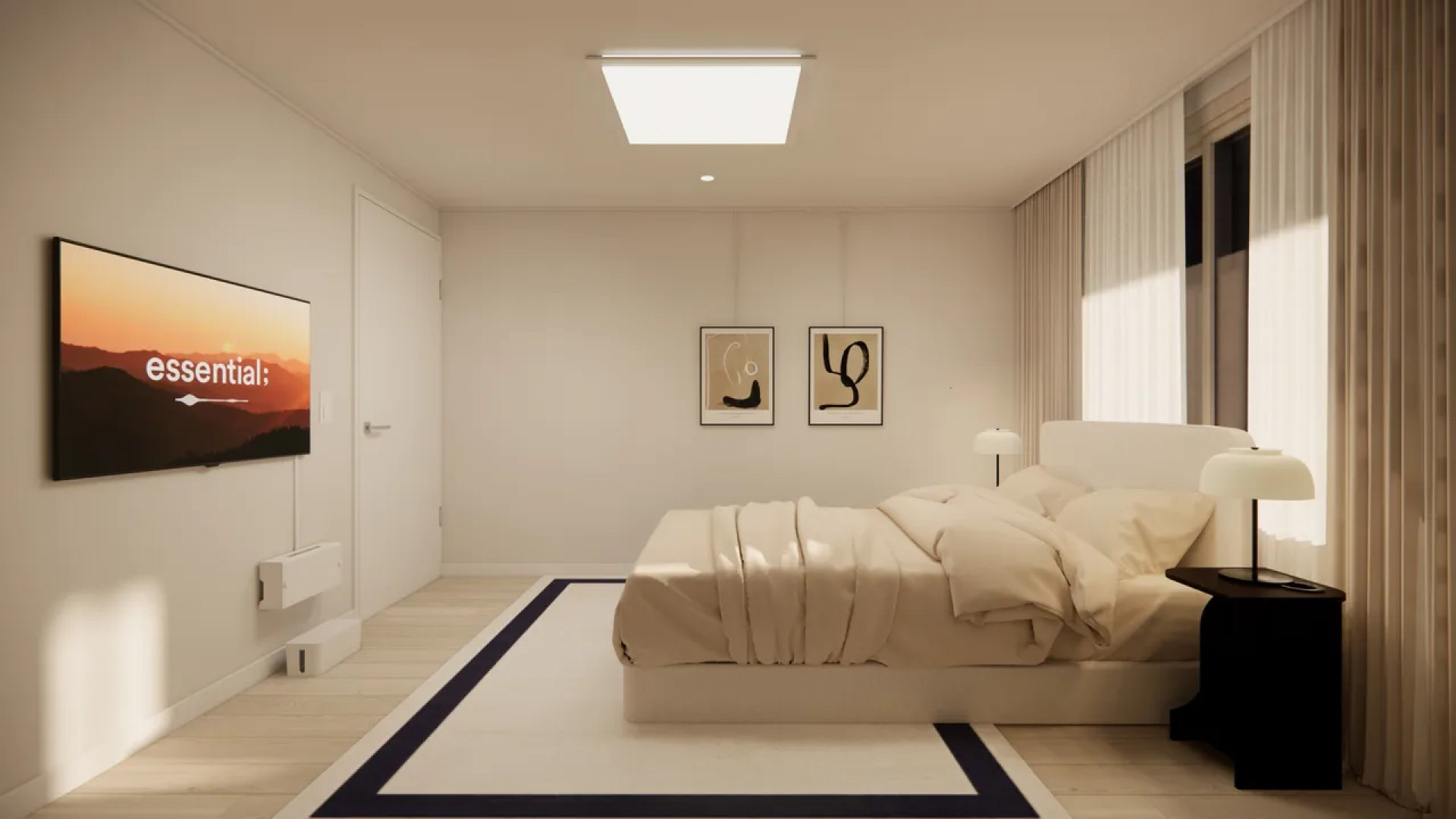 따뜻한 분위기를 위해 종이 질감의 조명과 노란 빛의 전구를 조합했어요. 또한 바닥에서 오는 온기를 느끼실 수 있도록 저상형 침대를 배치하고, 발이 닿는 부분에 러그를 두어 발끝까지 부드러운 경험을 계획했습니다.