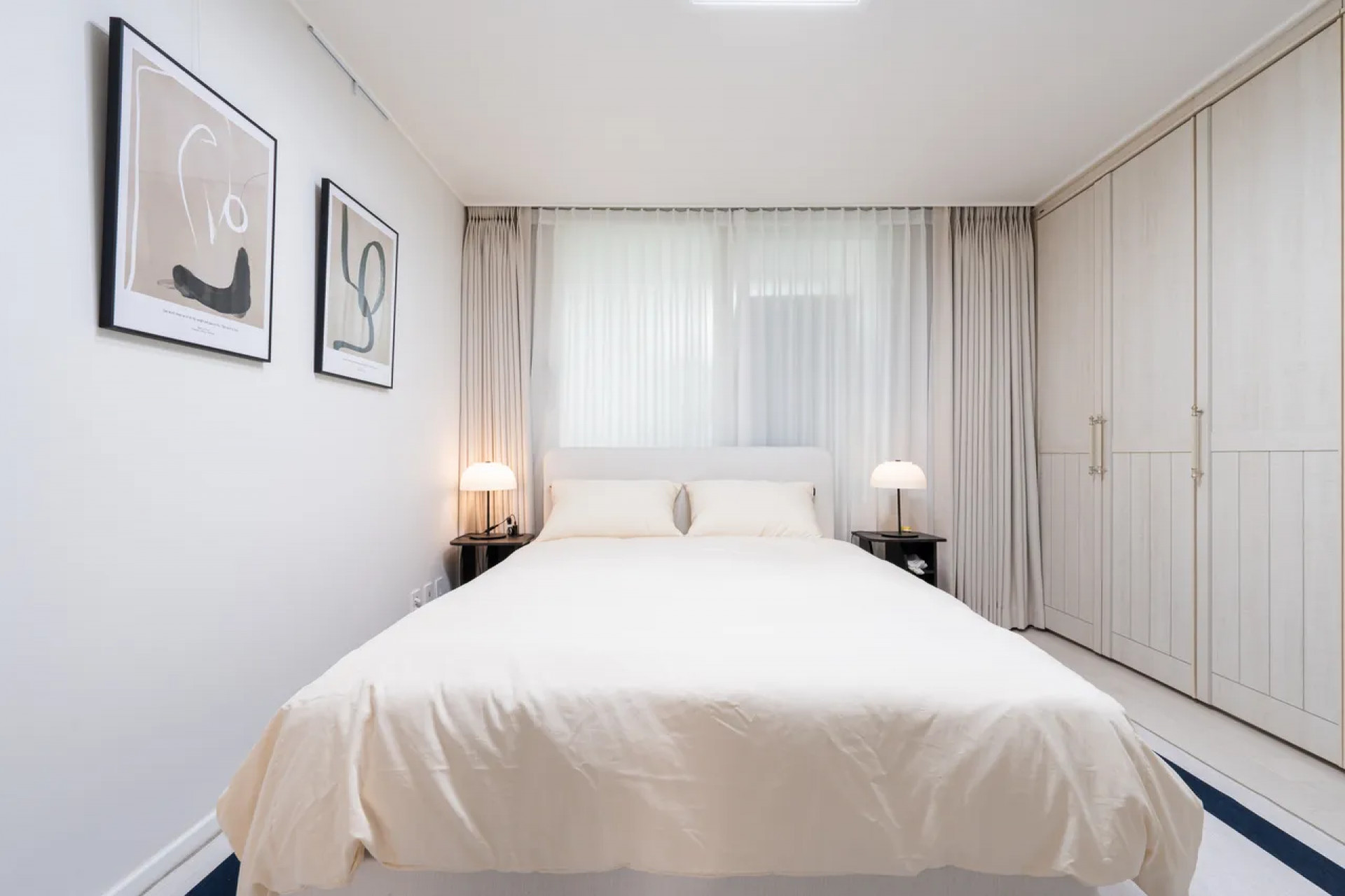 침실 인테리어는 화이트 색상을 메인으로 하되 블랙 컬러 포인트의 오리엔탈 스타일로 디자인 하였습니다.