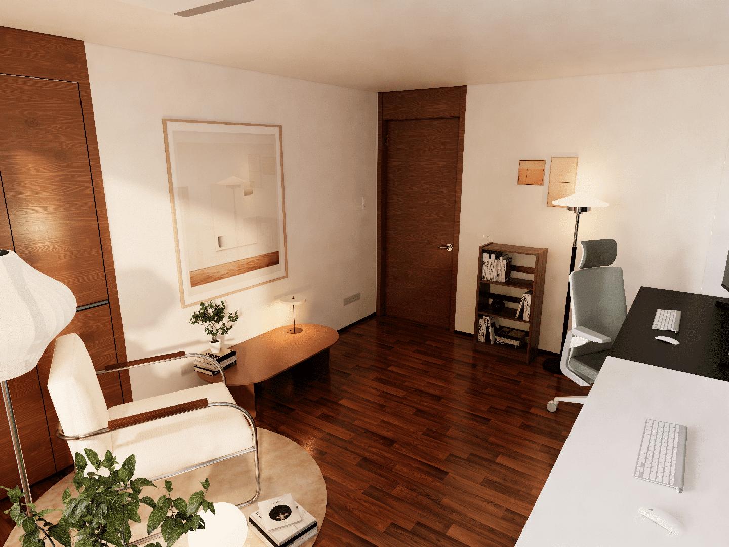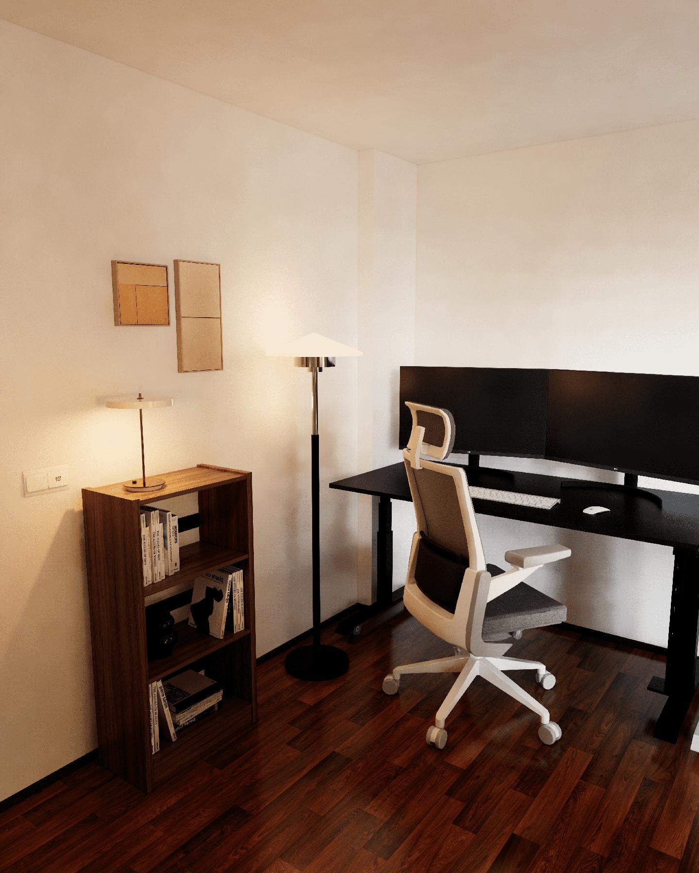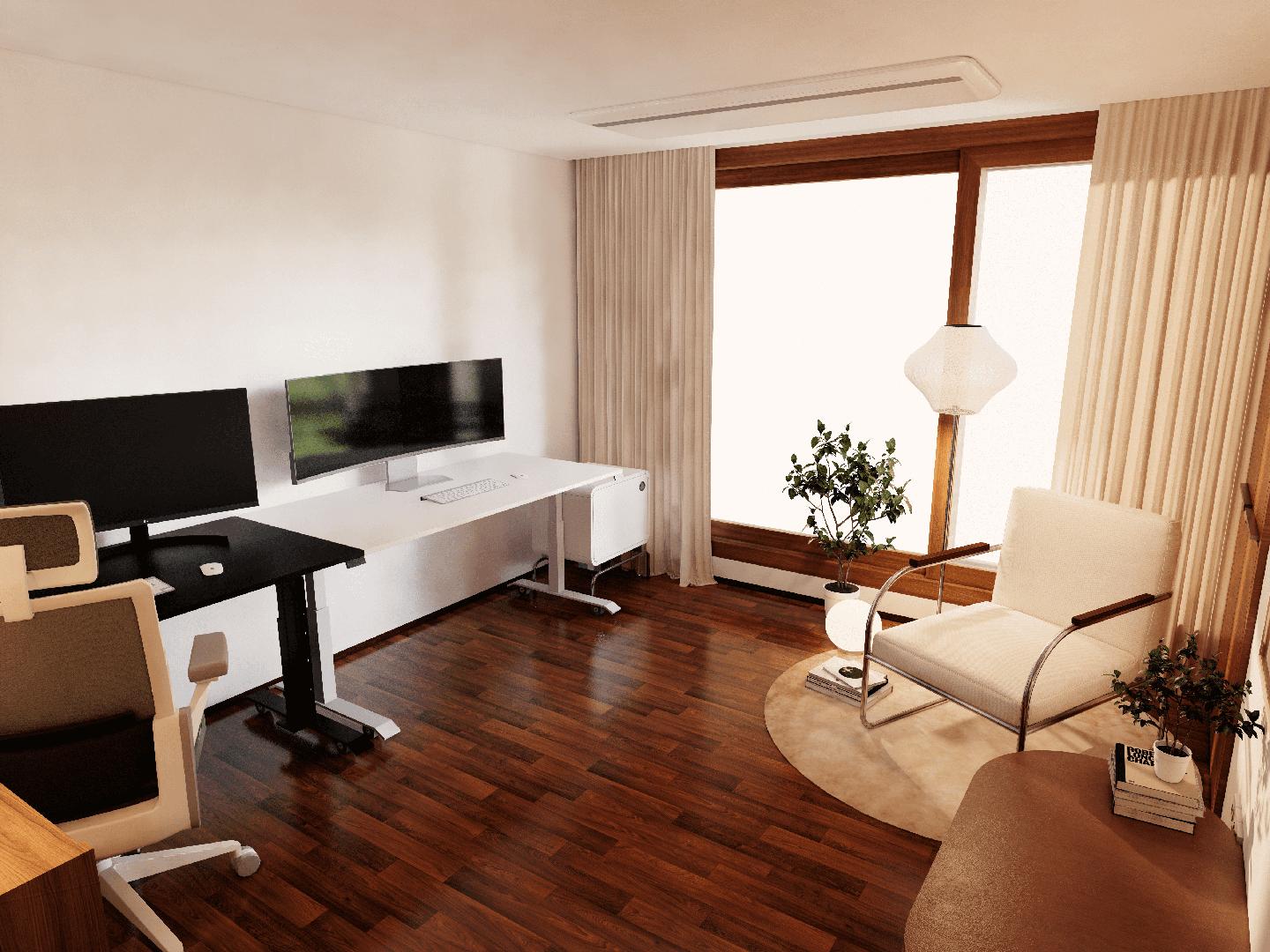이미 구매하신 루나랩의 전동 데스크의 색상에 착안하여 서재 공간은 어두운 톤을 사용한 젠 스타일로 공간을 연출하였습니다. 두개의 컴퓨터를 사용하실 고객님께서 최대한 공간을 활용하실 수 있도록 책상을 벽 쪽으로 배치하였습니다.