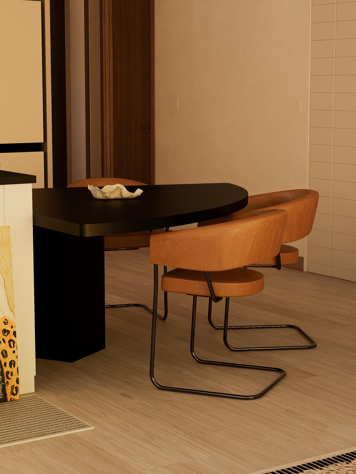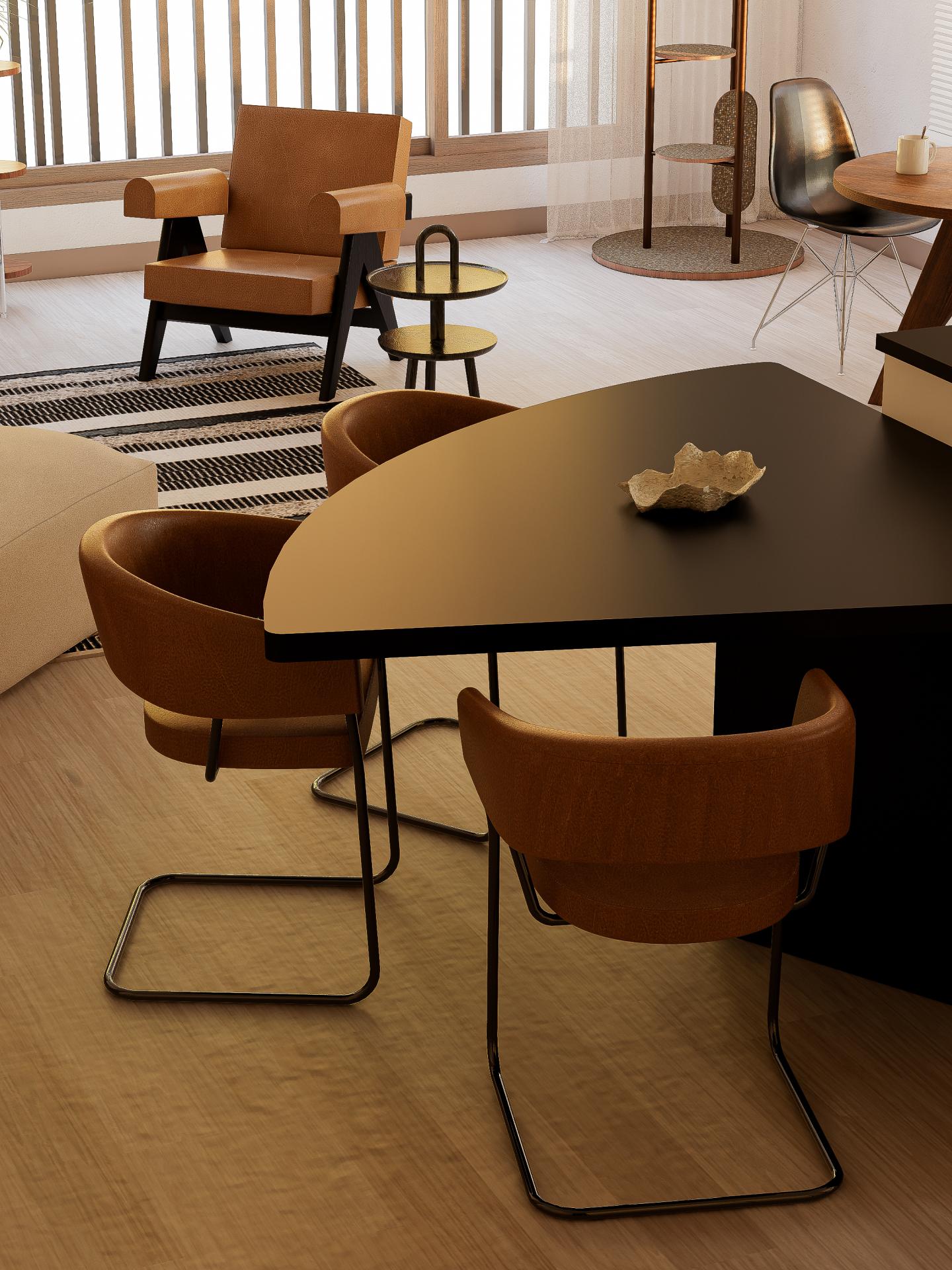 블랙 테이블과 브라운 가죽 체어를 배치해 세련된 인테리어 완성하였습니다.
